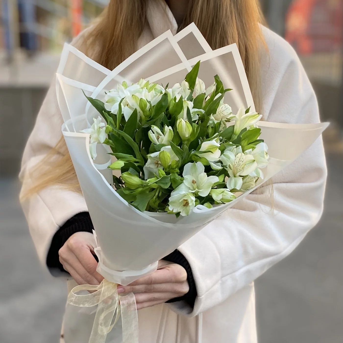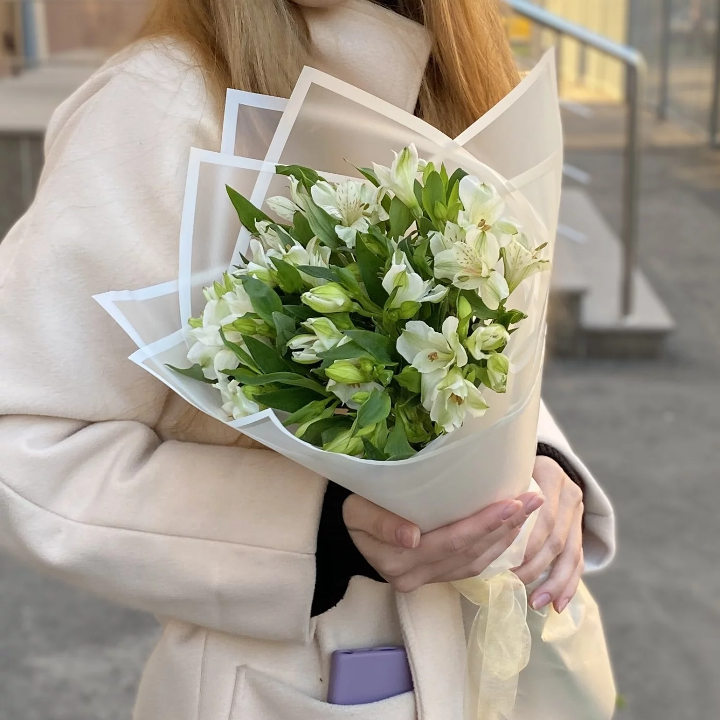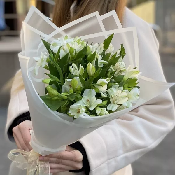 Букет из 7 белых альстромерий в стильной упаковке. Такой букет можно подарить маме в знак внимания или взять его с собой на свидание.