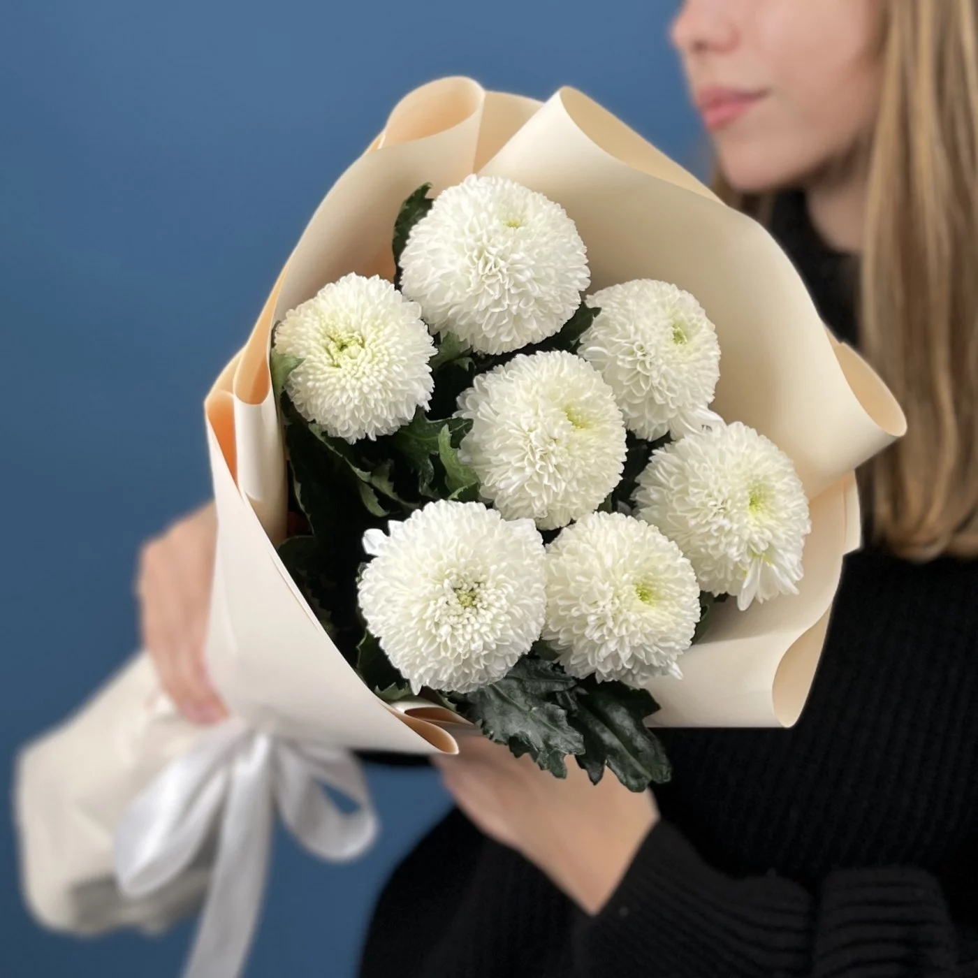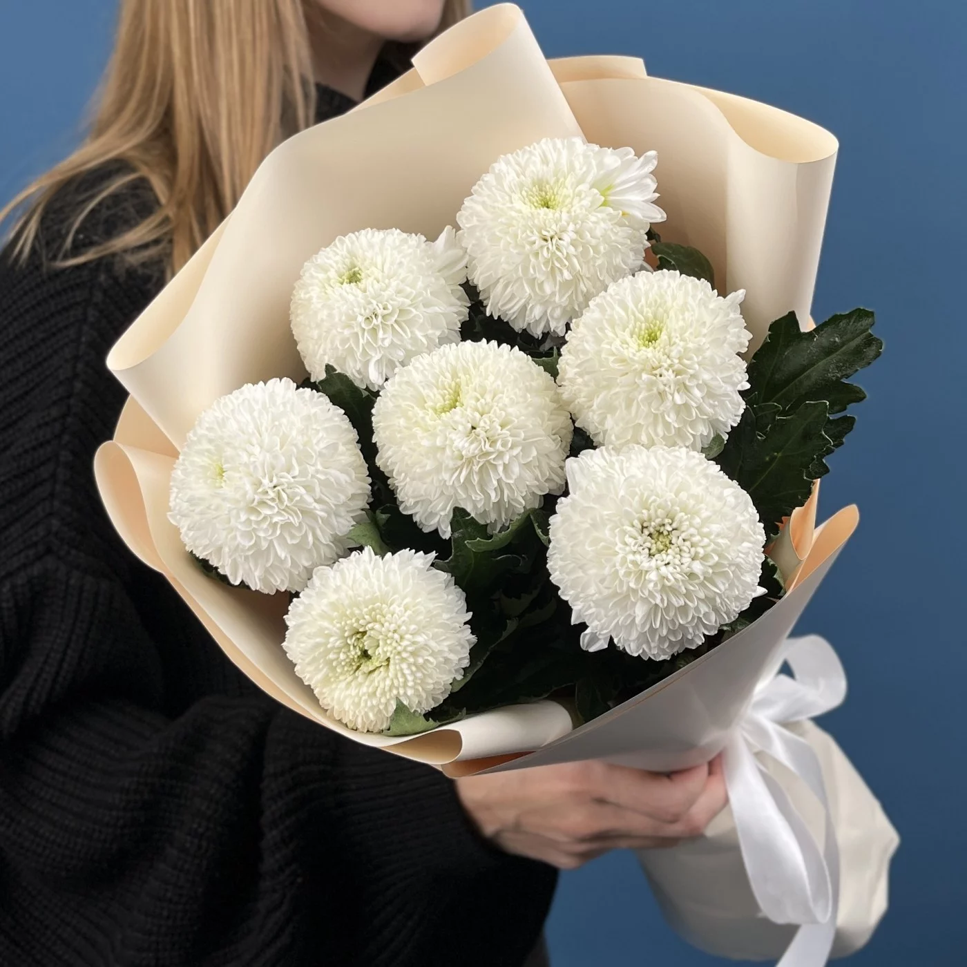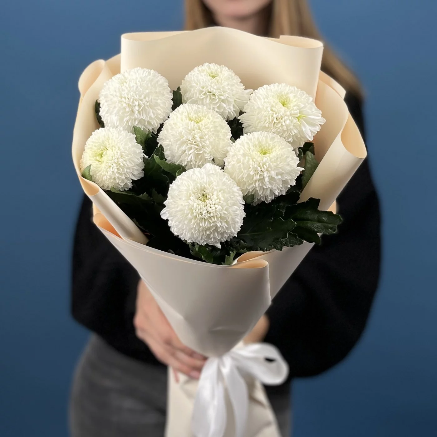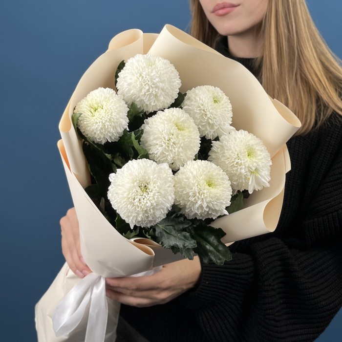 7 белых хризантем помпон — изысканная и выразительная композиция, объединяющая в себе чистоту белых хризантем и глубокий символизм числа семь. Семь пышных помпонных хризантем создают объемную, насыщенную и в то же время легкую и воздушную группу цветов.