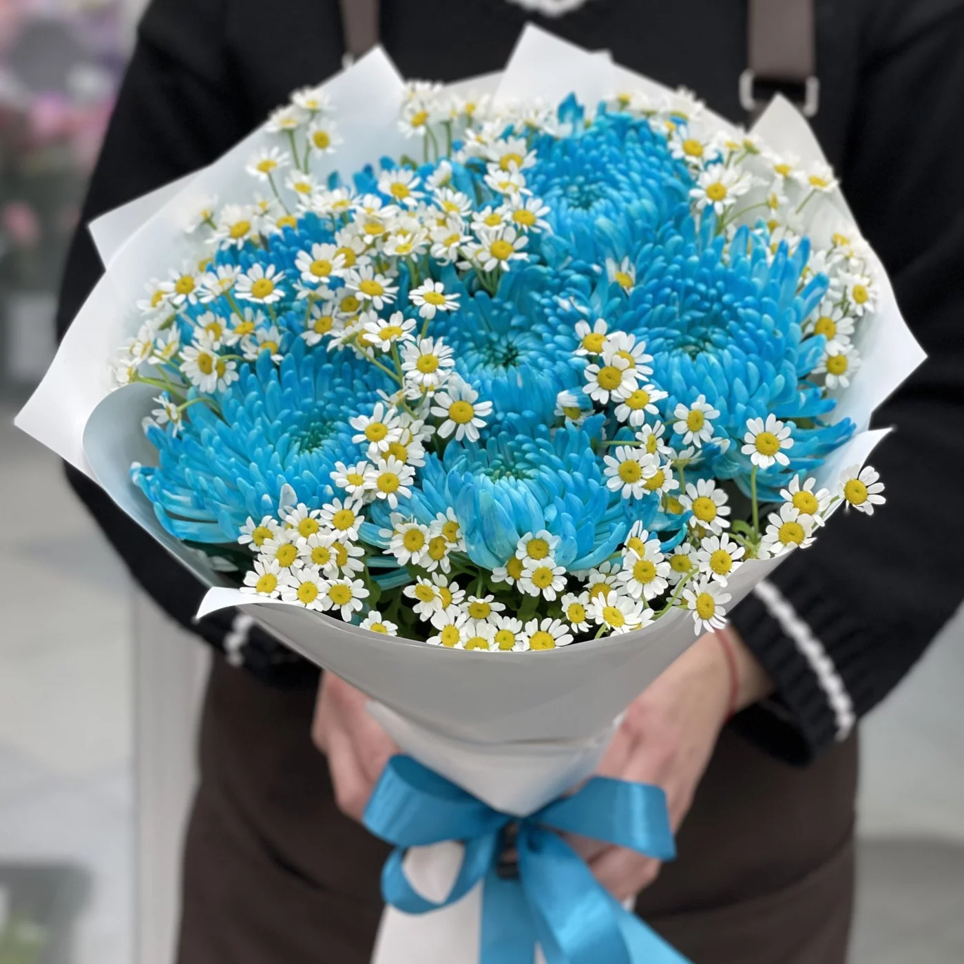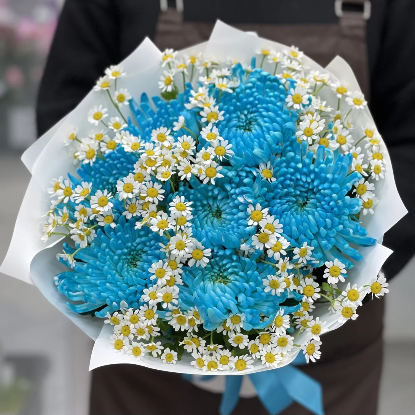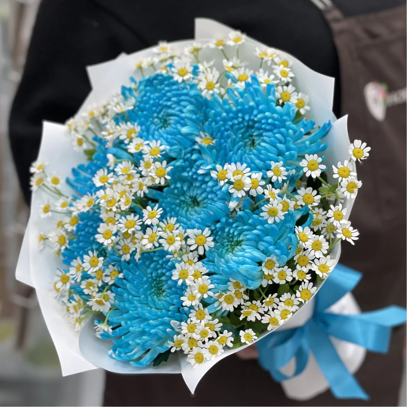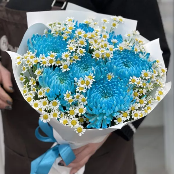 Букет из 7 бирюзовых хризантем с ромашками — это необычное и яркое сочетание, которое привнесет свежесть и оригинальность в любой интерьер. Бирюзовые хризантемы символизируют спокойствие и гармонию, а ромашки добавляют нотку нежности и простоты.