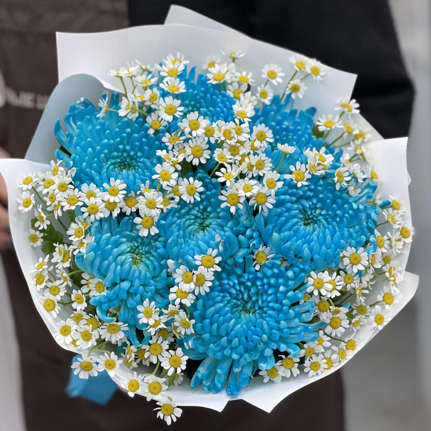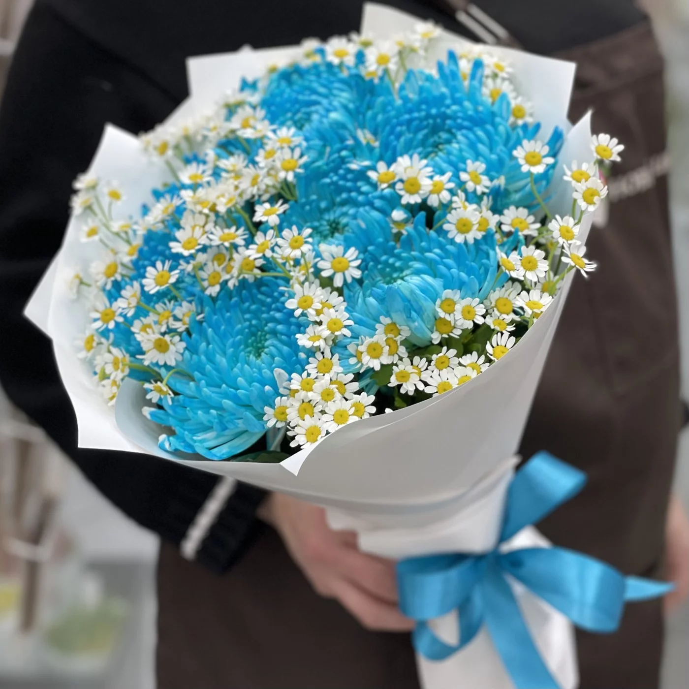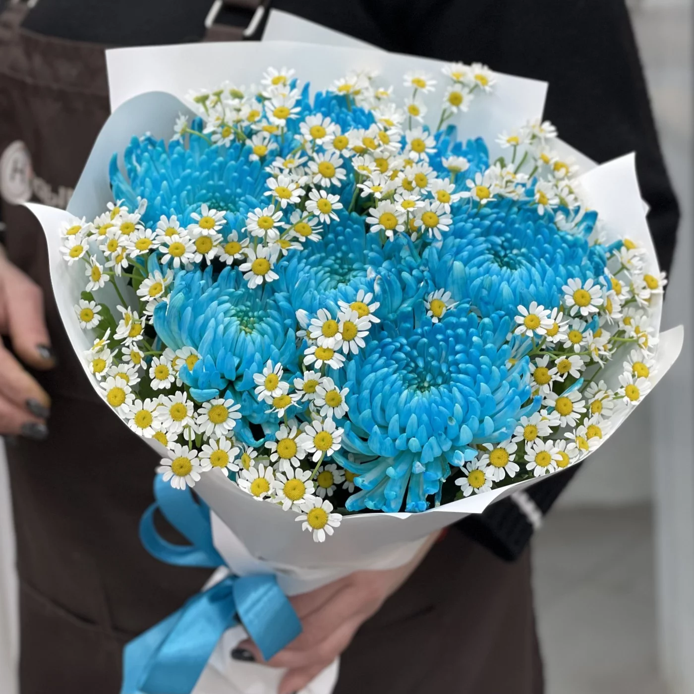 Букет из 7 бирюзовых хризантем с ромашками — это необычное и яркое сочетание, которое привнесет свежесть и оригинальность в любой интерьер. Бирюзовые хризантемы символизируют спокойствие и гармонию, а ромашки добавляют нотку нежности и простоты.