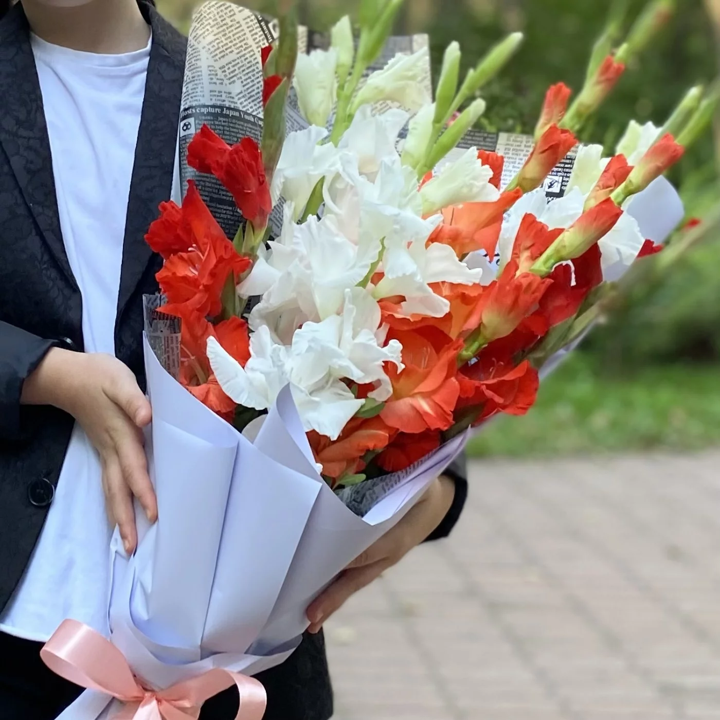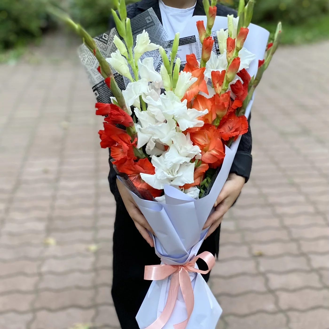 Букет из 7 ярких гладиолусов микс. Гладиолусы – самые роскошные осенние цветы, которые не оставят равнодушным никого и смогут порадовать Вашего получателя. Гладиолусы уместно преподнести в качестве подарка уважаемому коллеге, партнеру по бизнесу, а также любимому педагогу на 1 Сентября!
