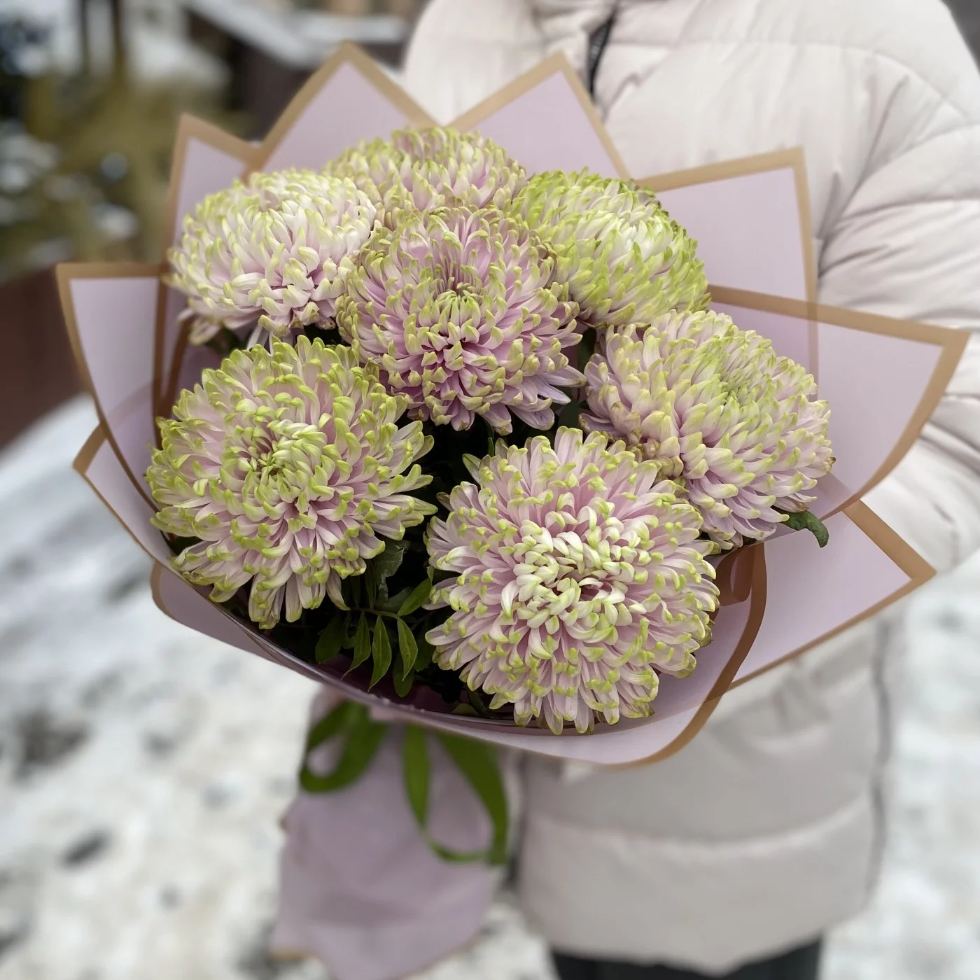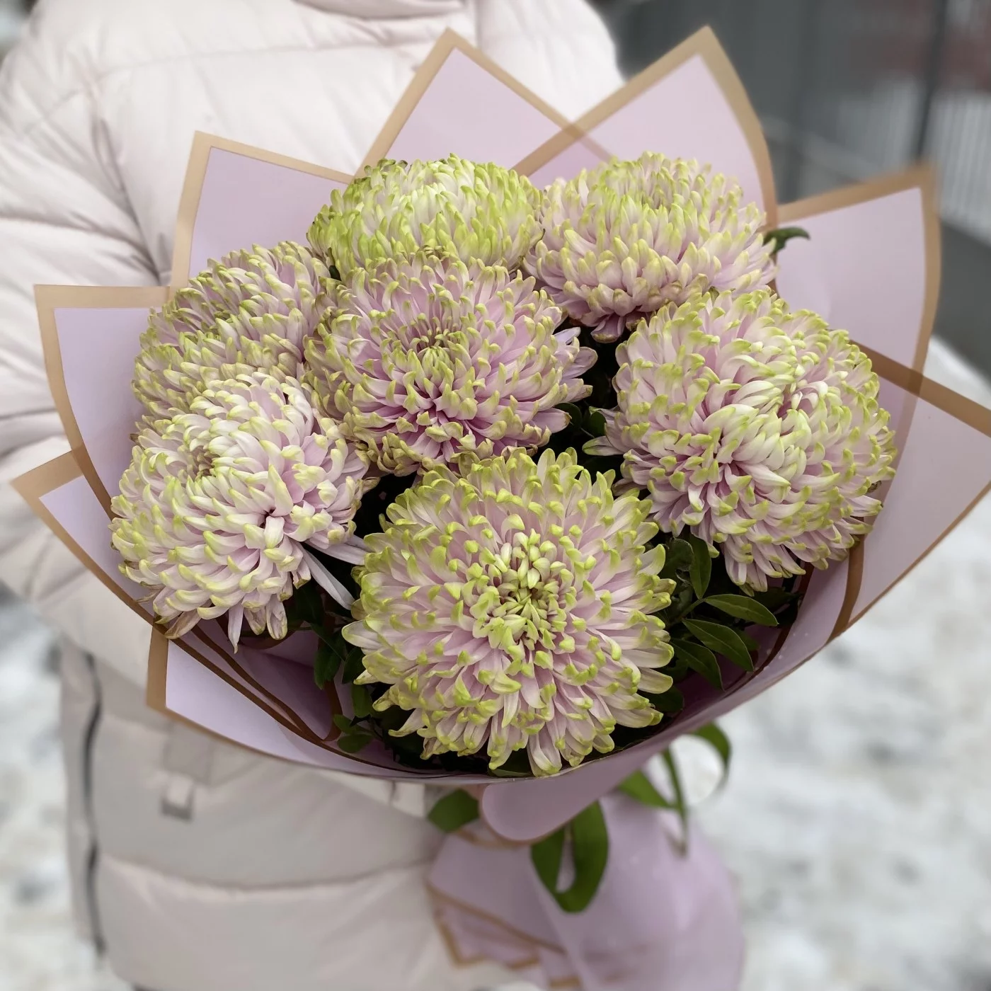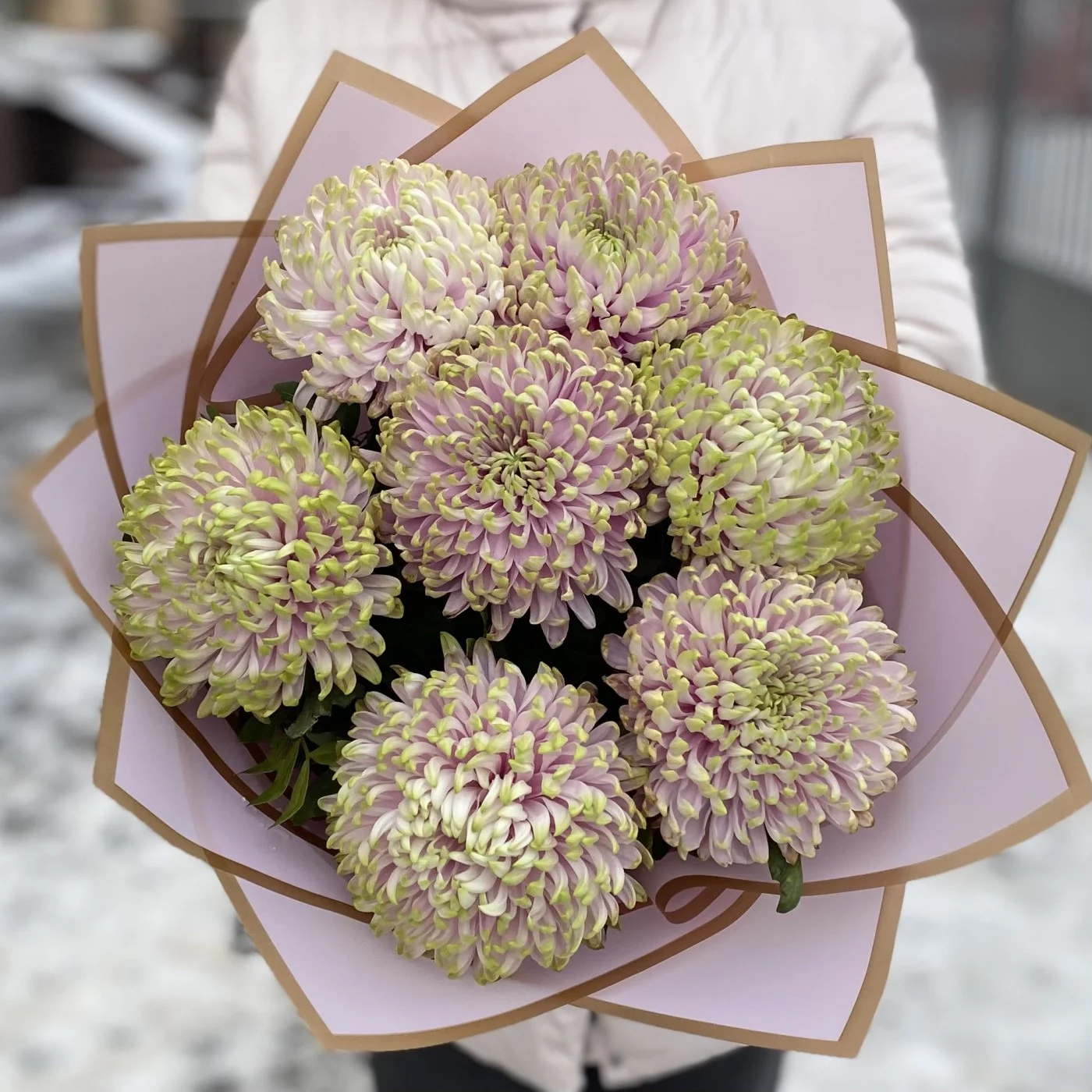 Букет из 7 крупных сиренево-зеленых хризантем отлично подойдет в качестве подарка любимой учительнице, коллеге или подруге.