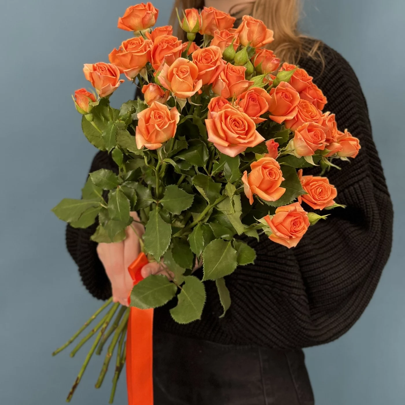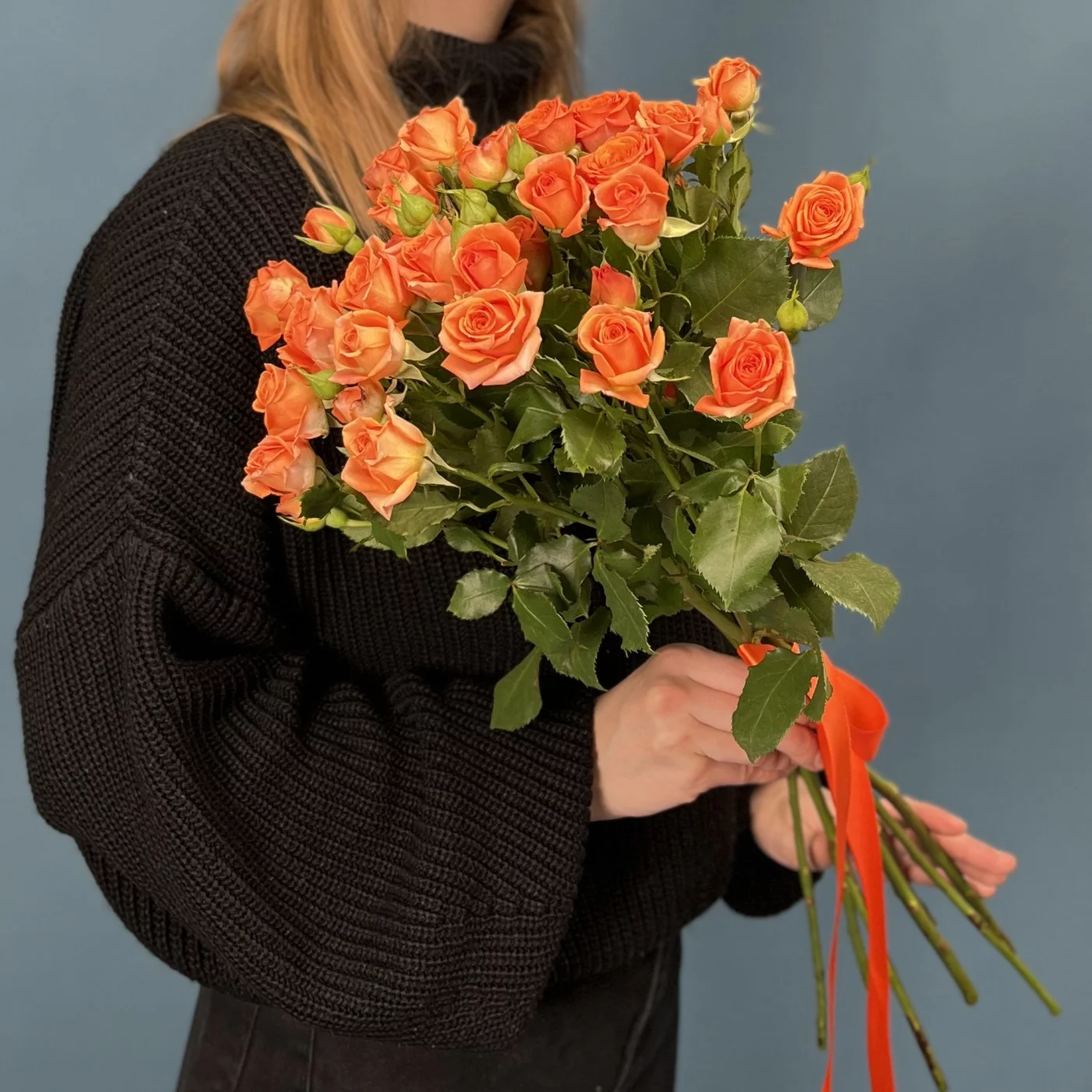 7 кустовых оранжевых роз Чарминг Бейб 50 см — это гармоничное сочетание яркости и изящества, которое привлечёт внимание своей насыщенной цветовой гаммой и естественной пышностью.