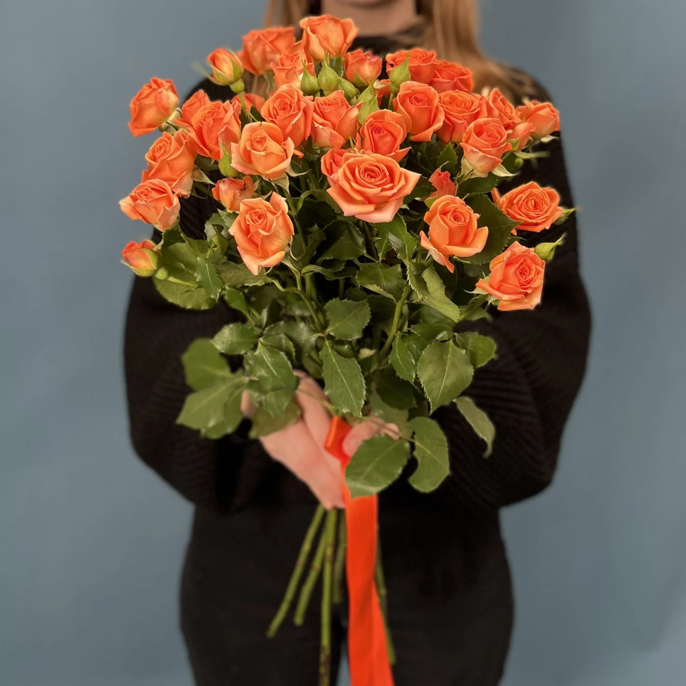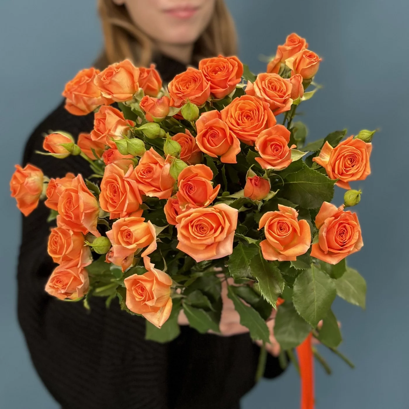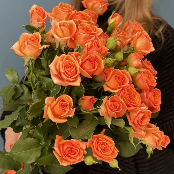 Каждая роза Чарминг Бейби отличается насыщенным, глубоким оранжевым оттенком, который ассоциируется с энергией, теплом и радостью. Благодаря кустовому типу цветения на каждом стебле расположено несколько аккуратных бутонов, что придаёт букету объем и живость, делая его одновременно элегантным и выразительным.