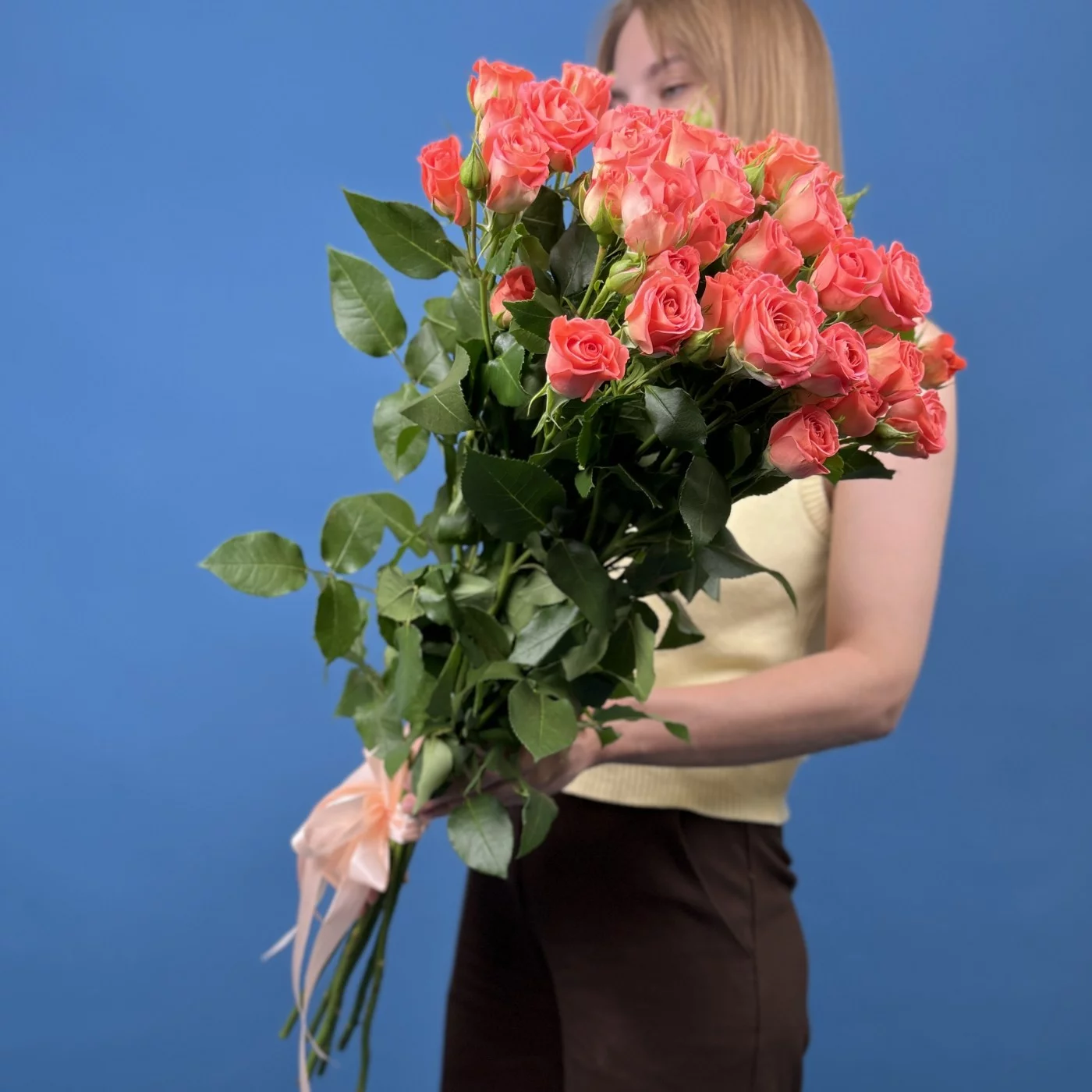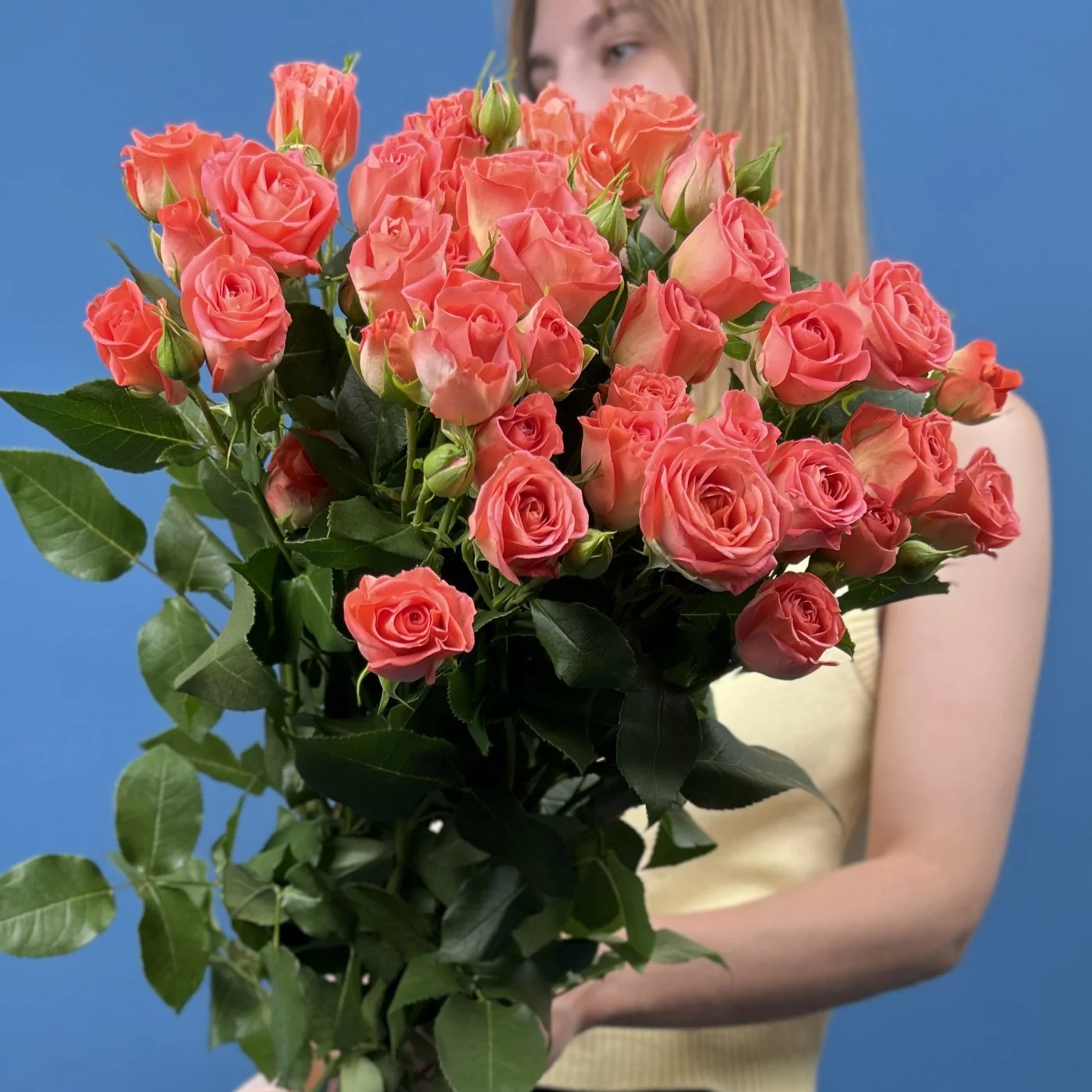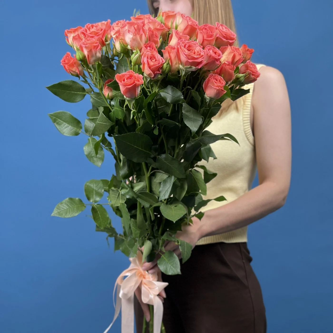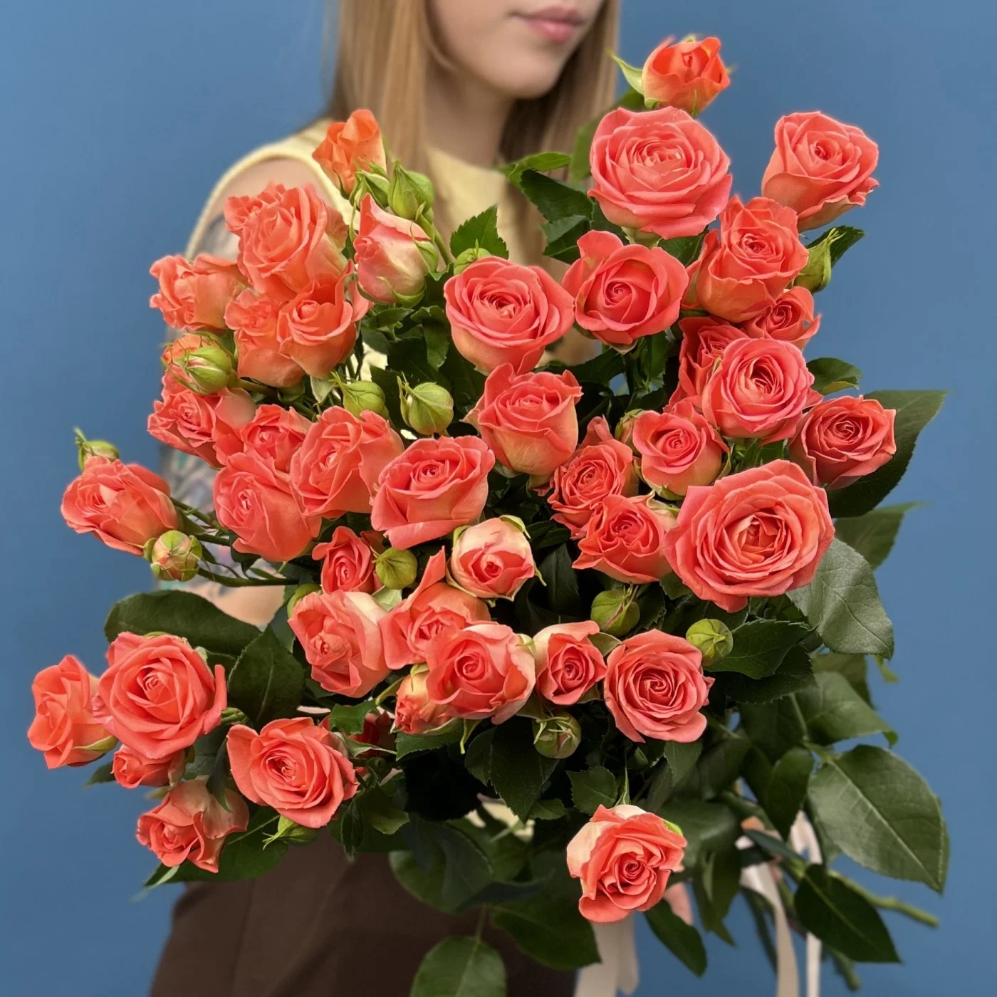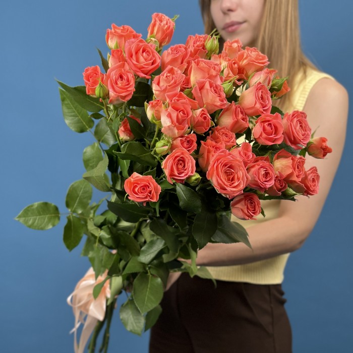 7 кустовых оранжевых роз Чарминг Бейб 80 см — яркий и энергичный выбор, символизирующий страсть, энтузиазм и жизнерадостность.