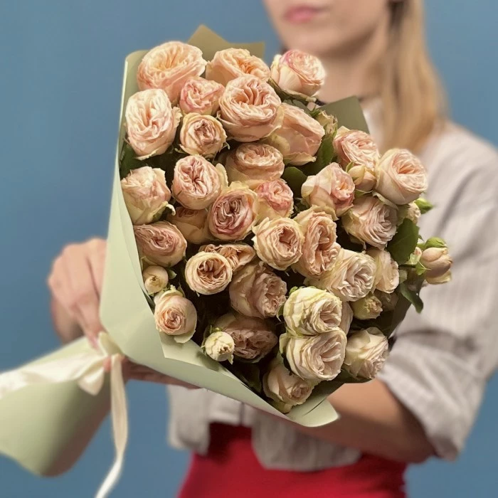 Нежный и изысканный букет из 7 кустовых пионовидных роз сорта Джентл Трендсеттер с длиной стебля 60 см.
