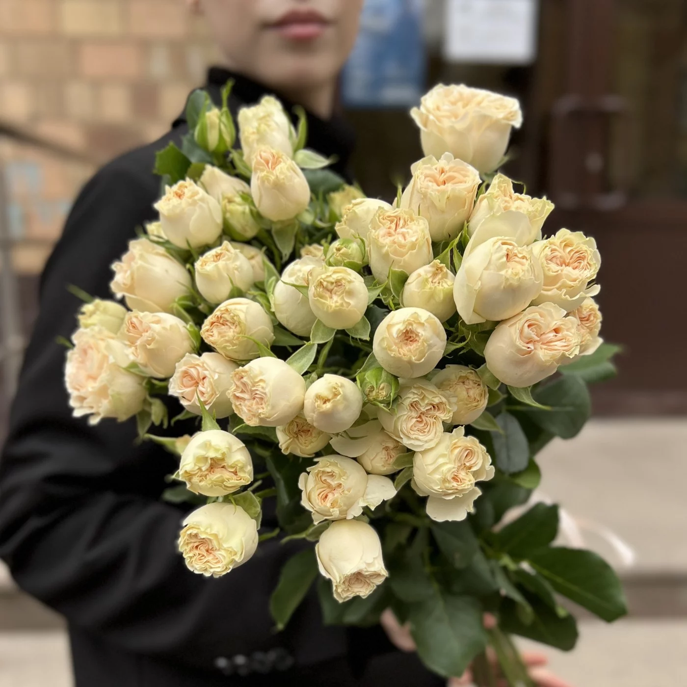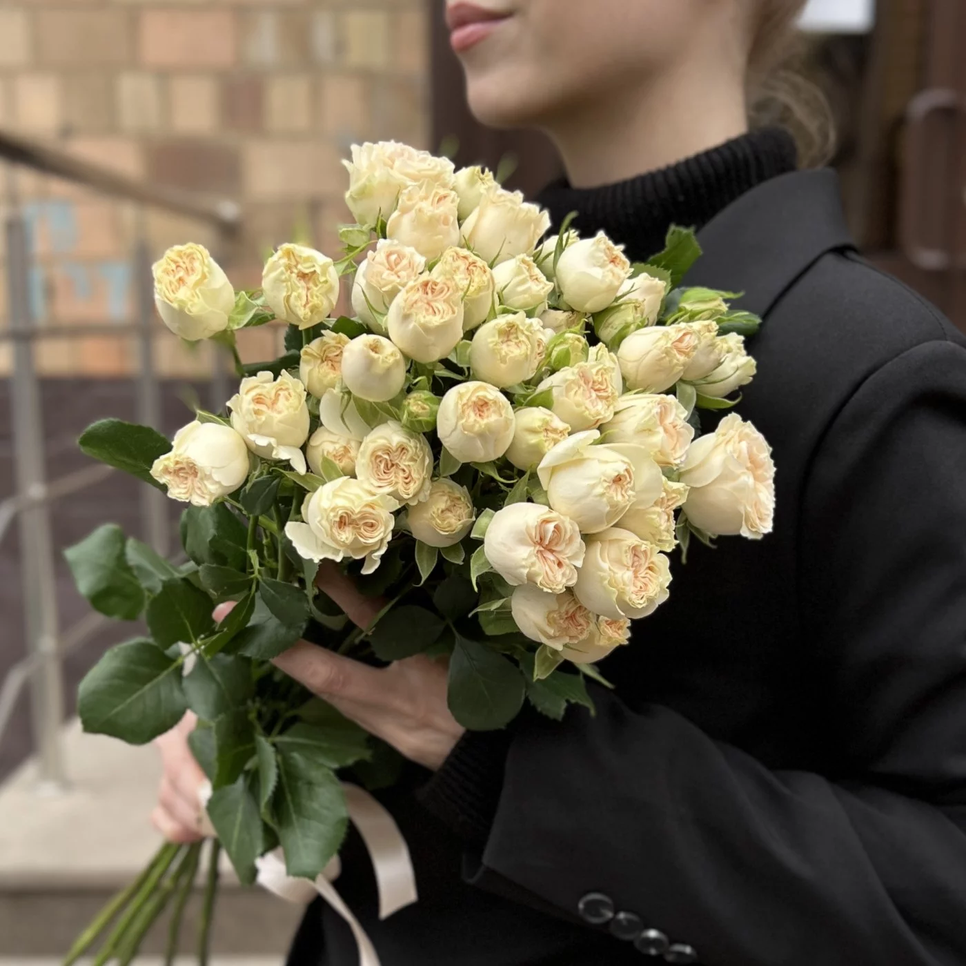 Этот сорт пионовидных роз отличается крупными, махровыми бутонами с нежным персиковым или розовым оттенком. Лепестки имеют бархатистую текстуру и создают эффект пышности, что придаёт букету особую элегантность.