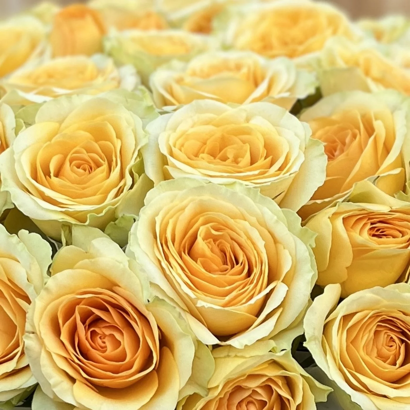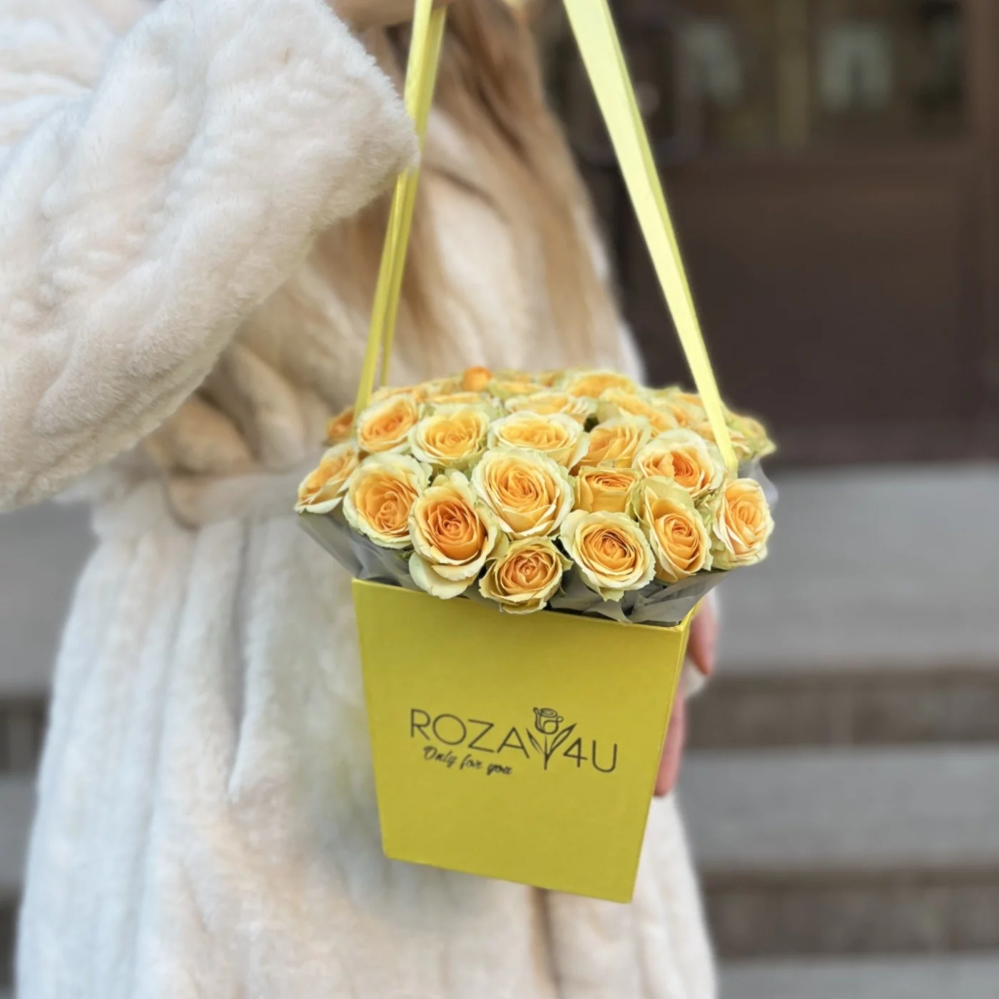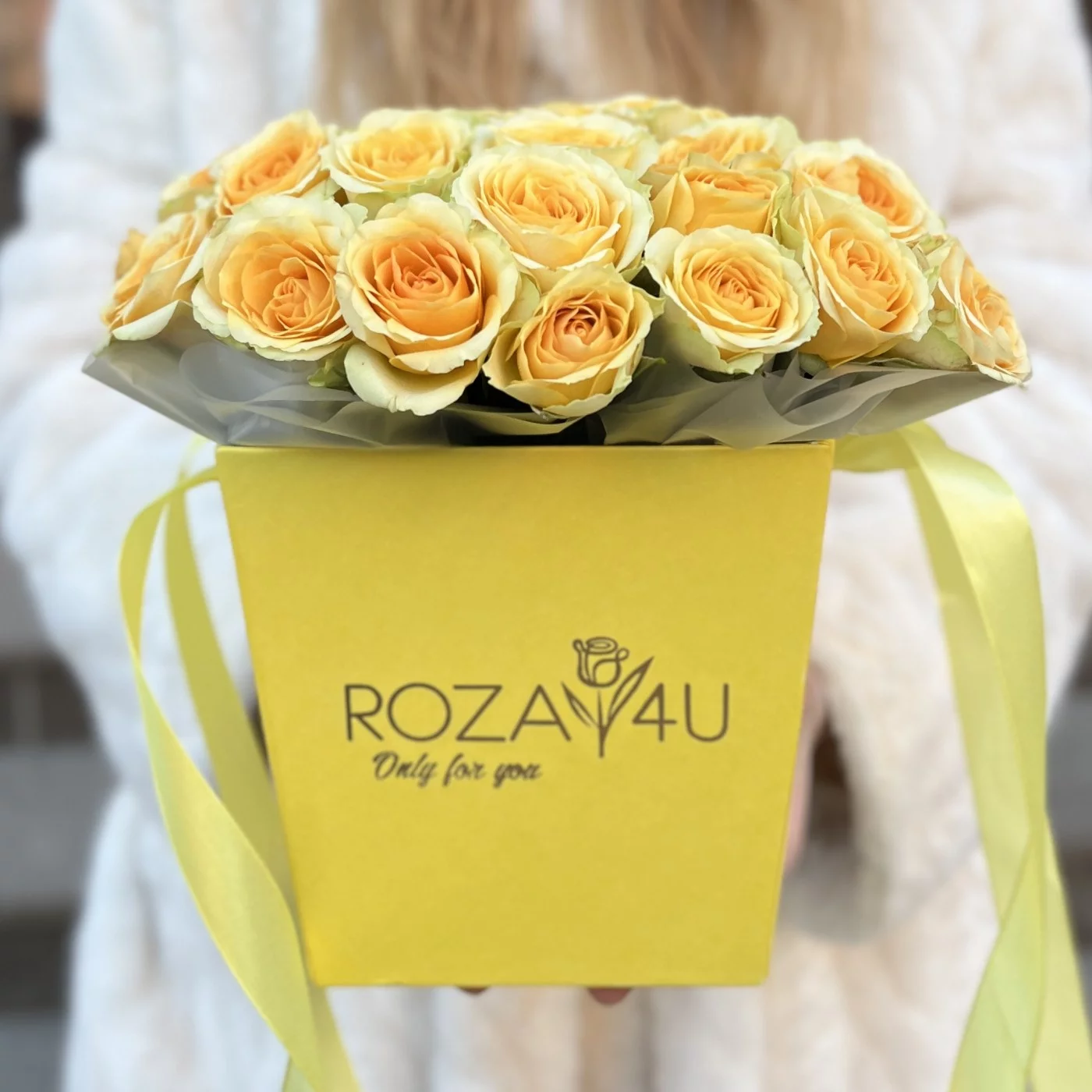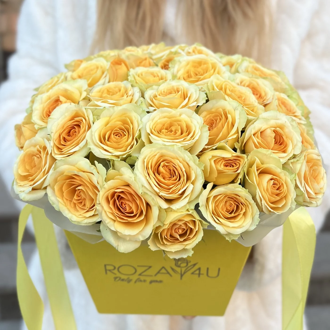Композиция из 7 желтых пионовидных роз Бандолера в коробке станет замечательным подарком для любого случая.