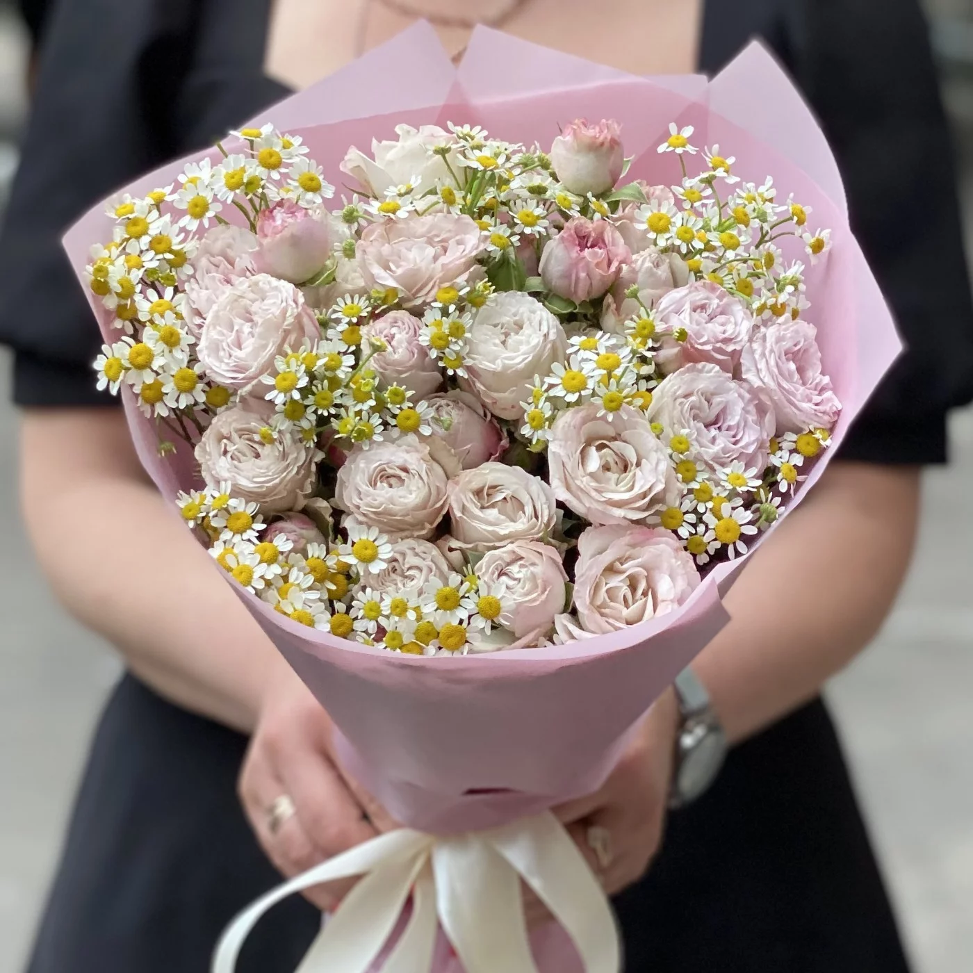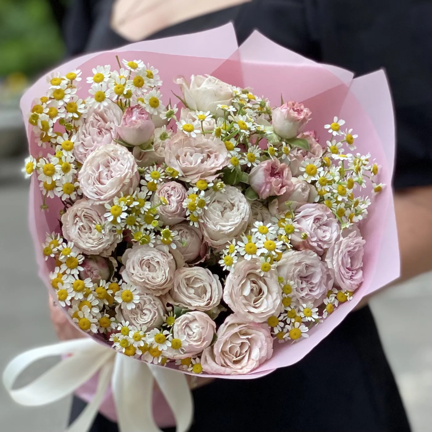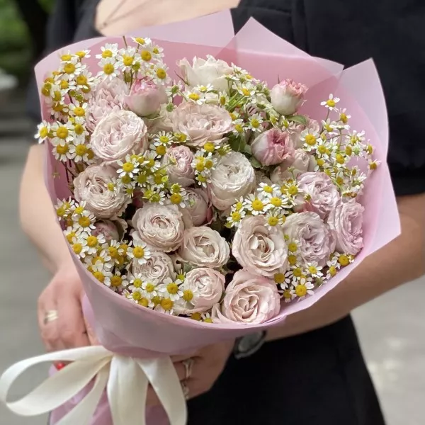 Букет из кустовых роз Энджел бомбастик с ромашкой