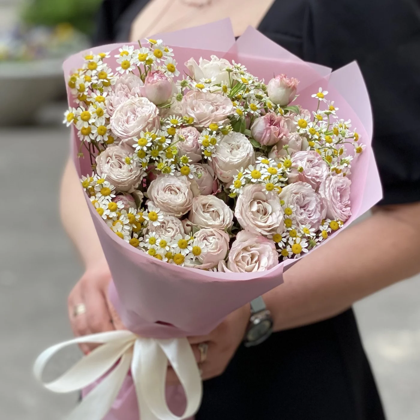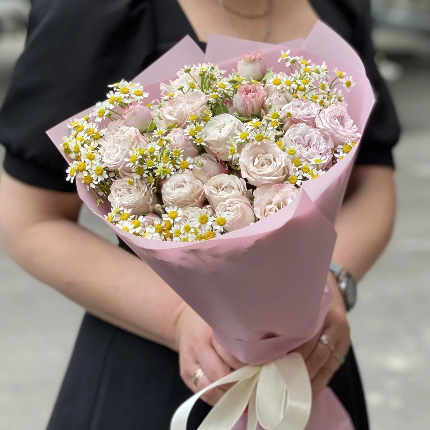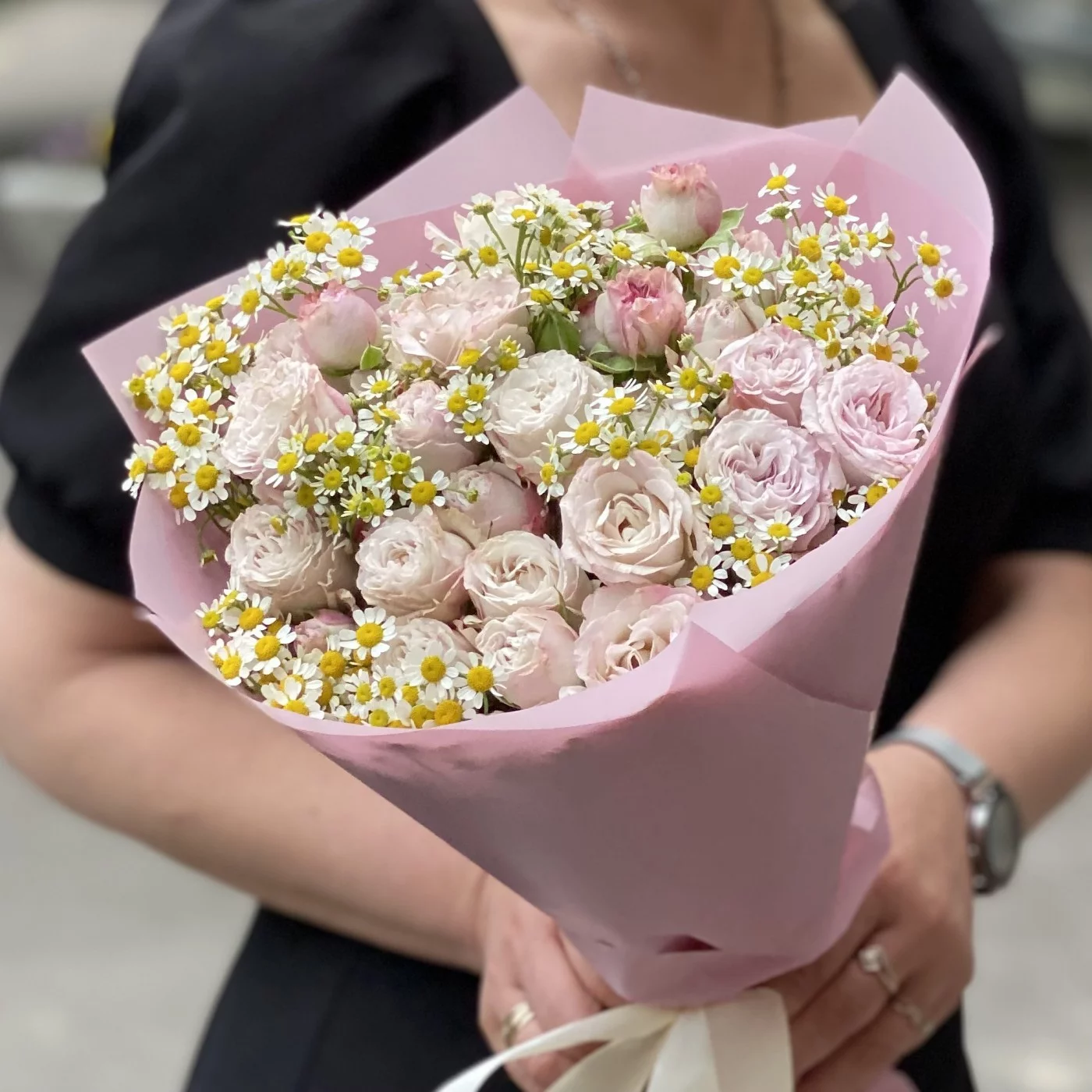 Букет из кустовых роз Энджел бомбастик с ромашкой