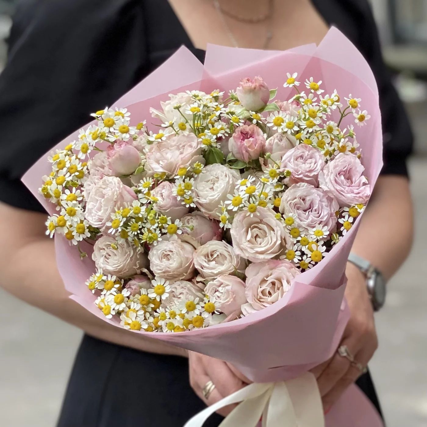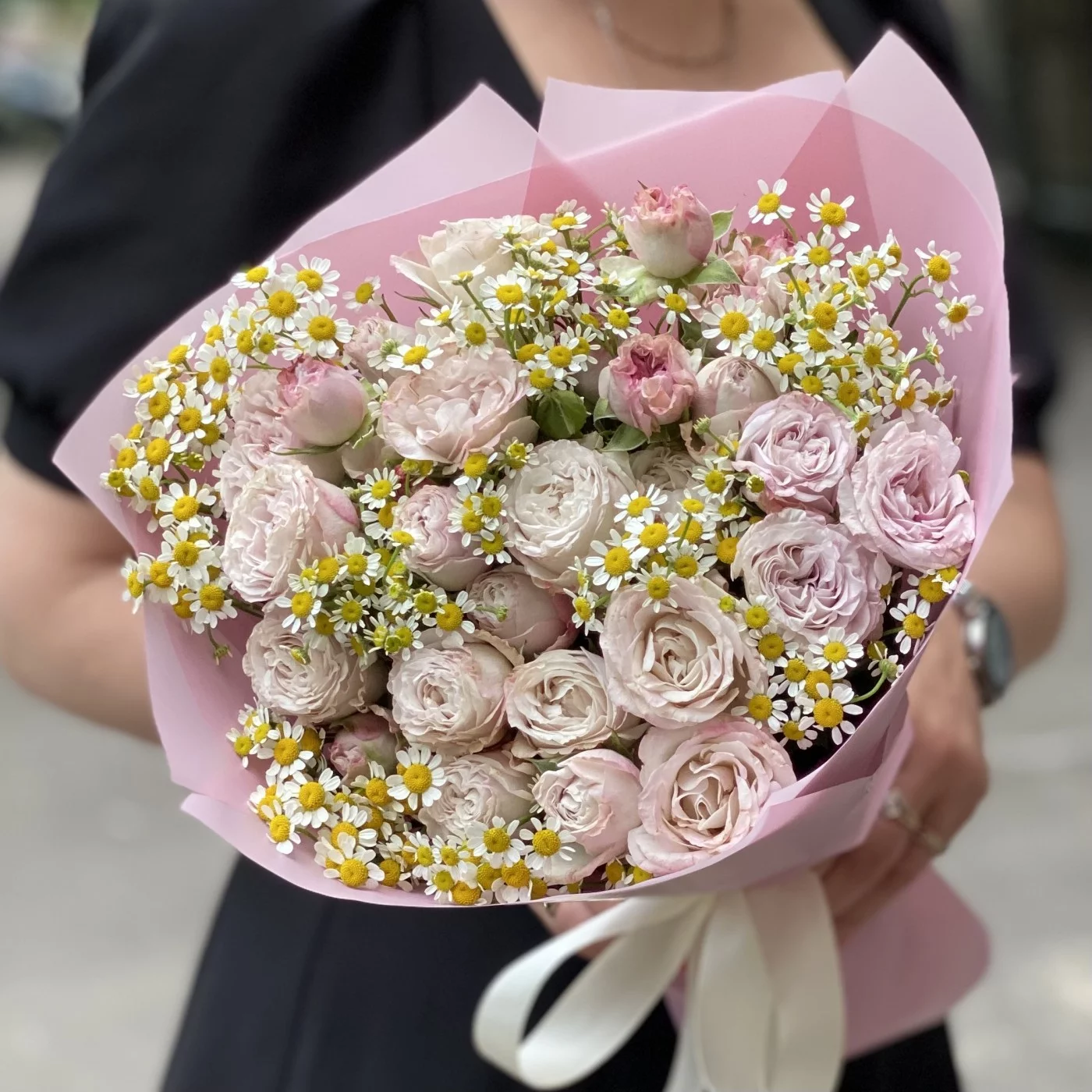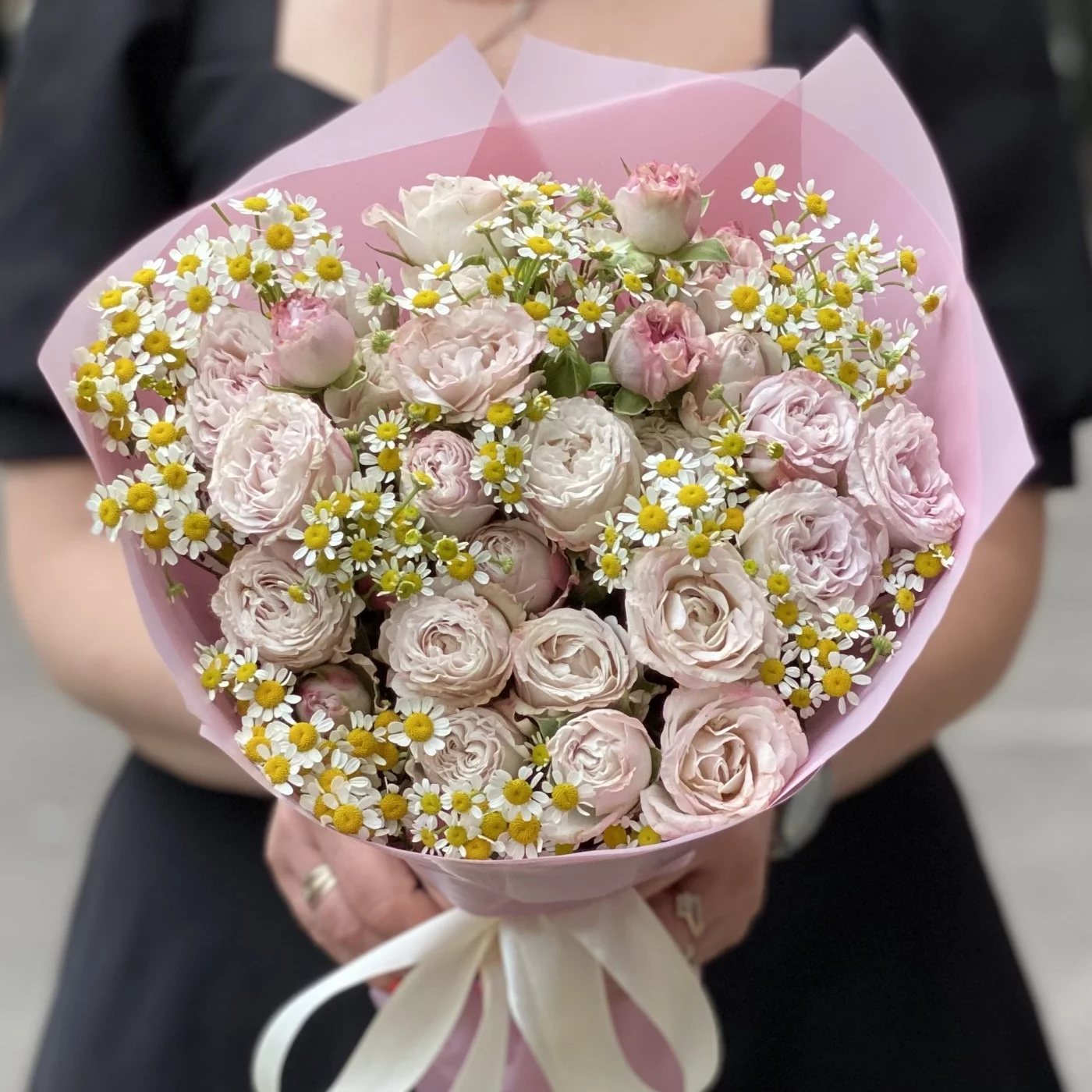 Букет из пионовидных кустовых роз Энджел Бомбастик с ромашками - прекрасный вариант для подарка по любому случаю. Простота и легкость ромашек прекрасно оттеняют элегантность роз сиренево-розового оттенка. Доставляем букеты по Москве и области.