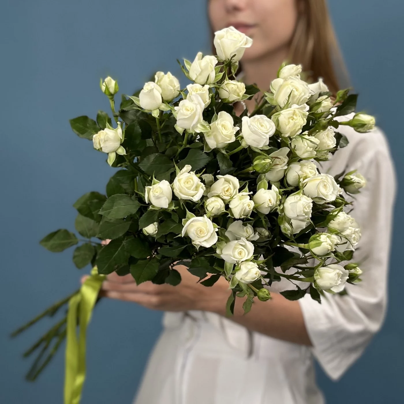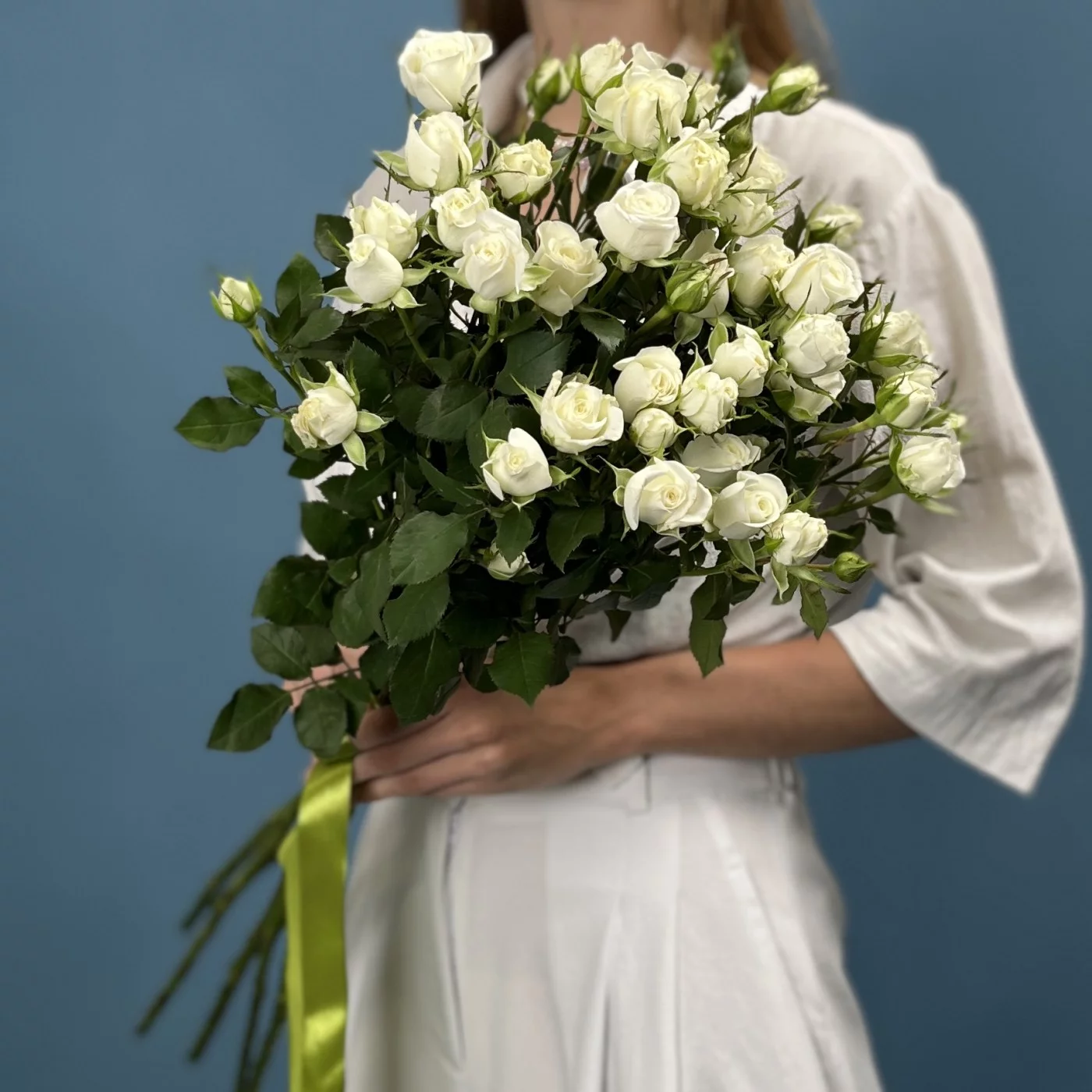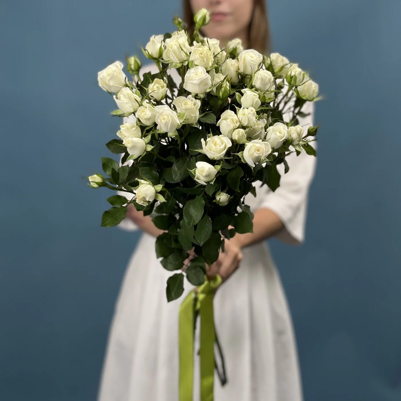 Очаровательный букет из 7 кустовых роз сорта Сноу Бабл высотой 70 см - это изысканная и романтичная композиция, наполненная свежестью и нежностью.