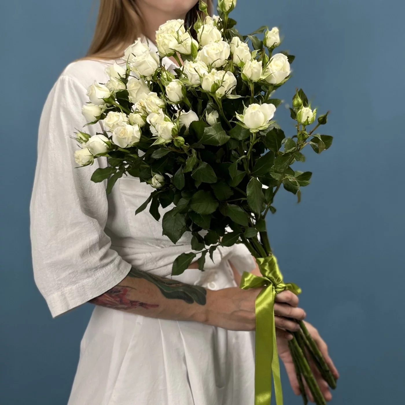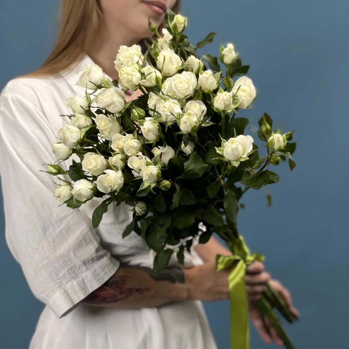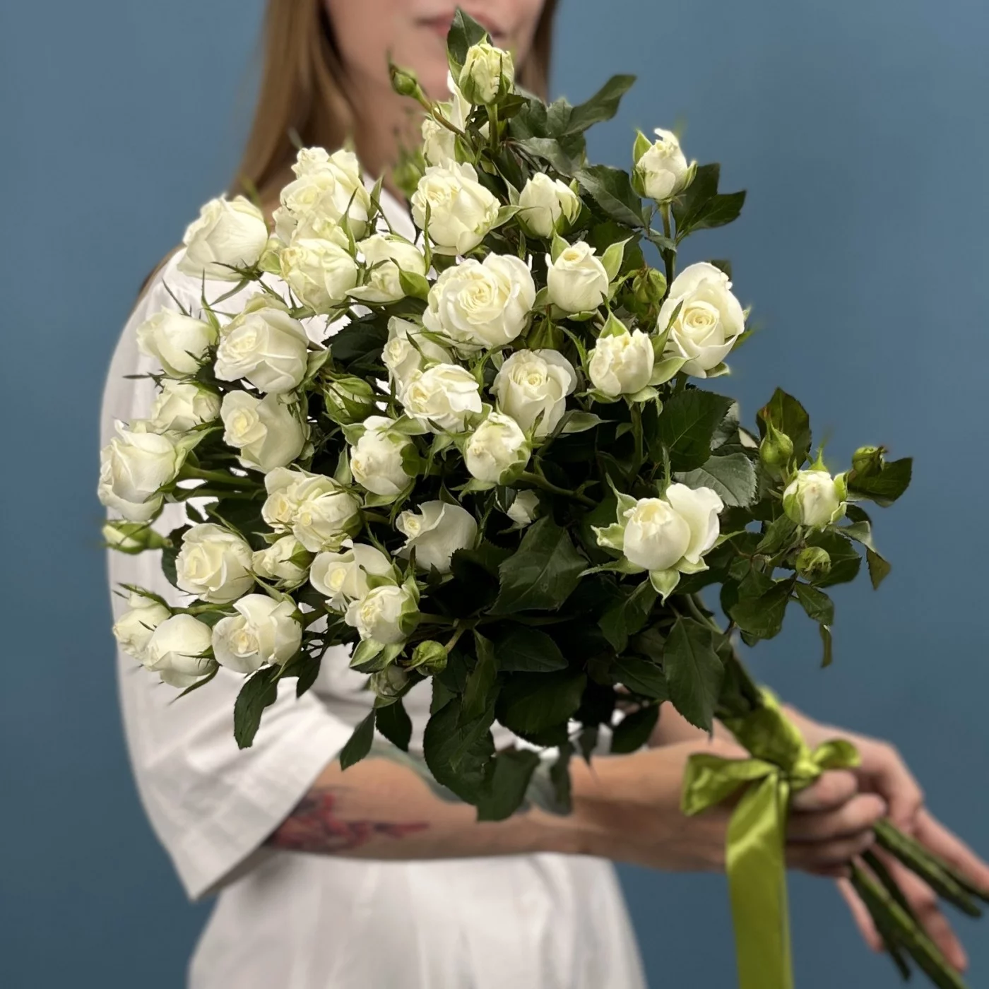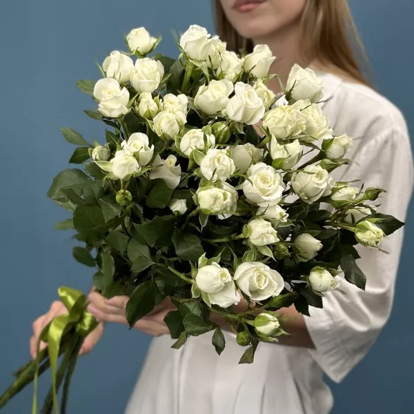Очаровательный букет из 7 кустовых роз сорта Сноу Бабл высотой 70 см - это изысканная и романтичная композиция, наполненная свежестью и нежностью.