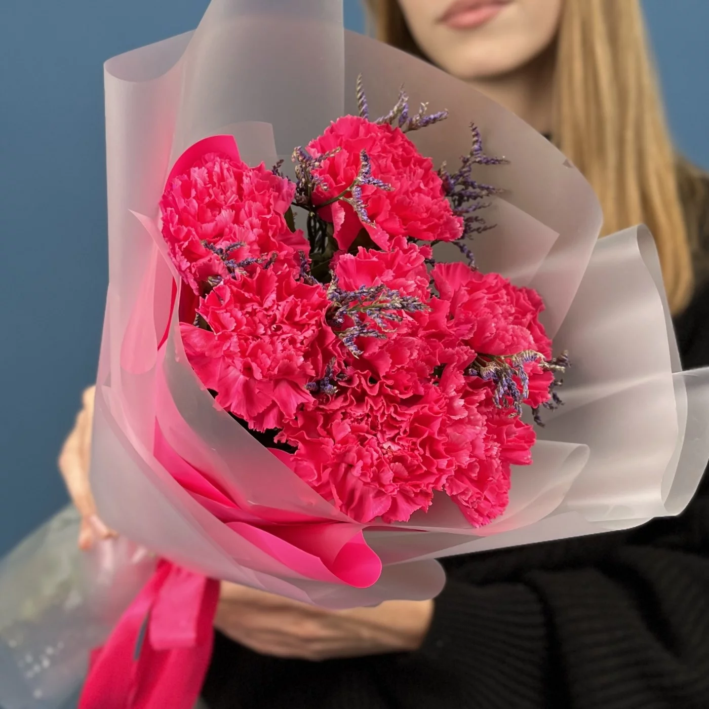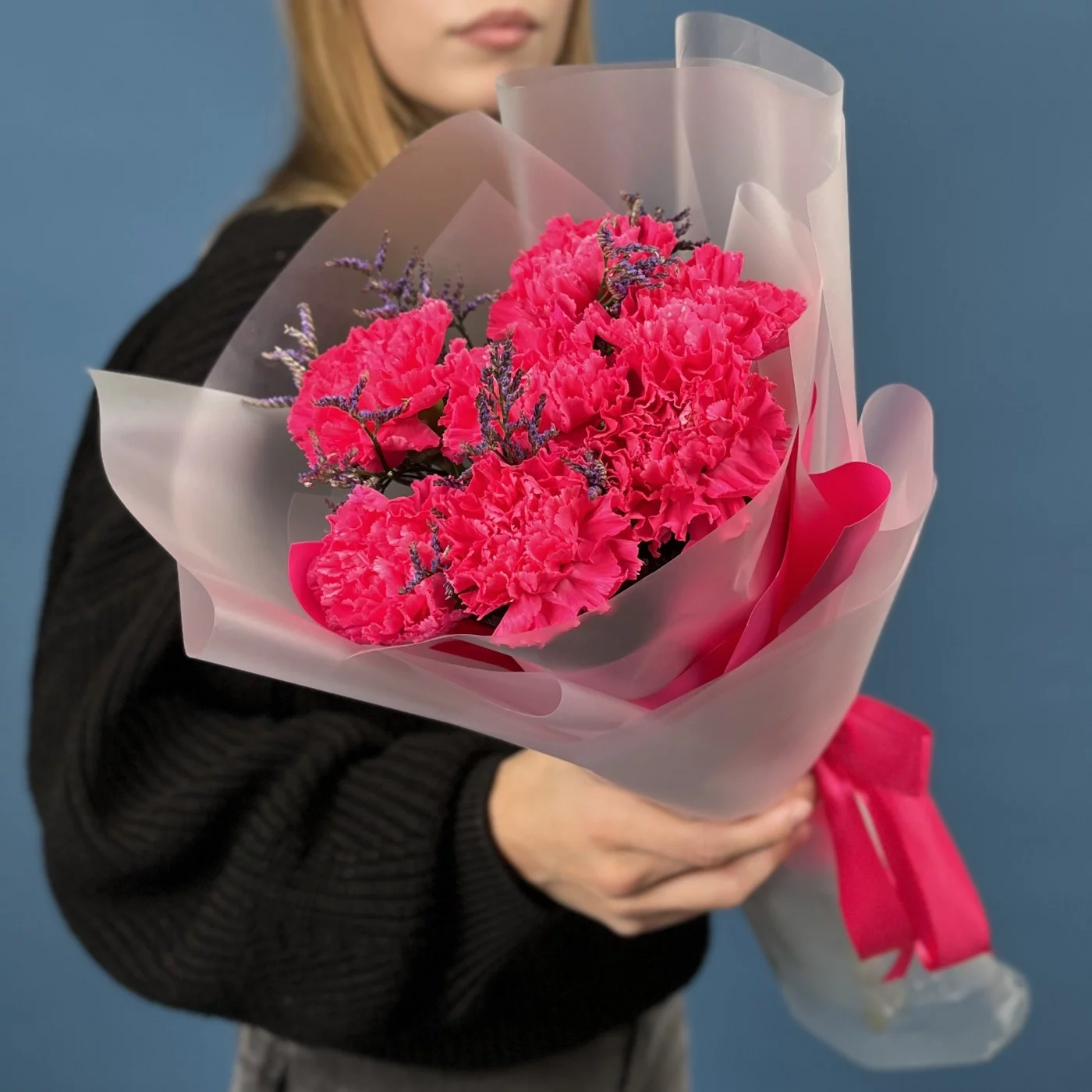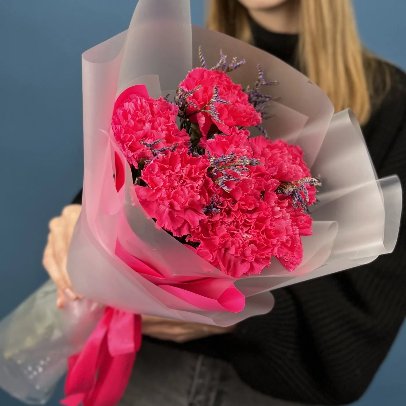 Букет из 7 малиновых гвоздик с лимониумом — это яркий и стильный подарок, который подчеркнет ваши чувства и создаст атмосферу радости и тепла.
