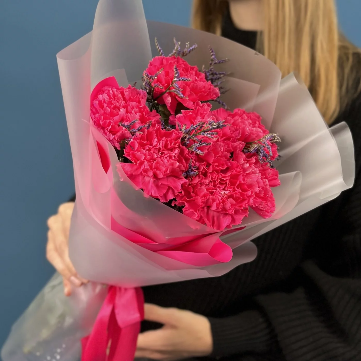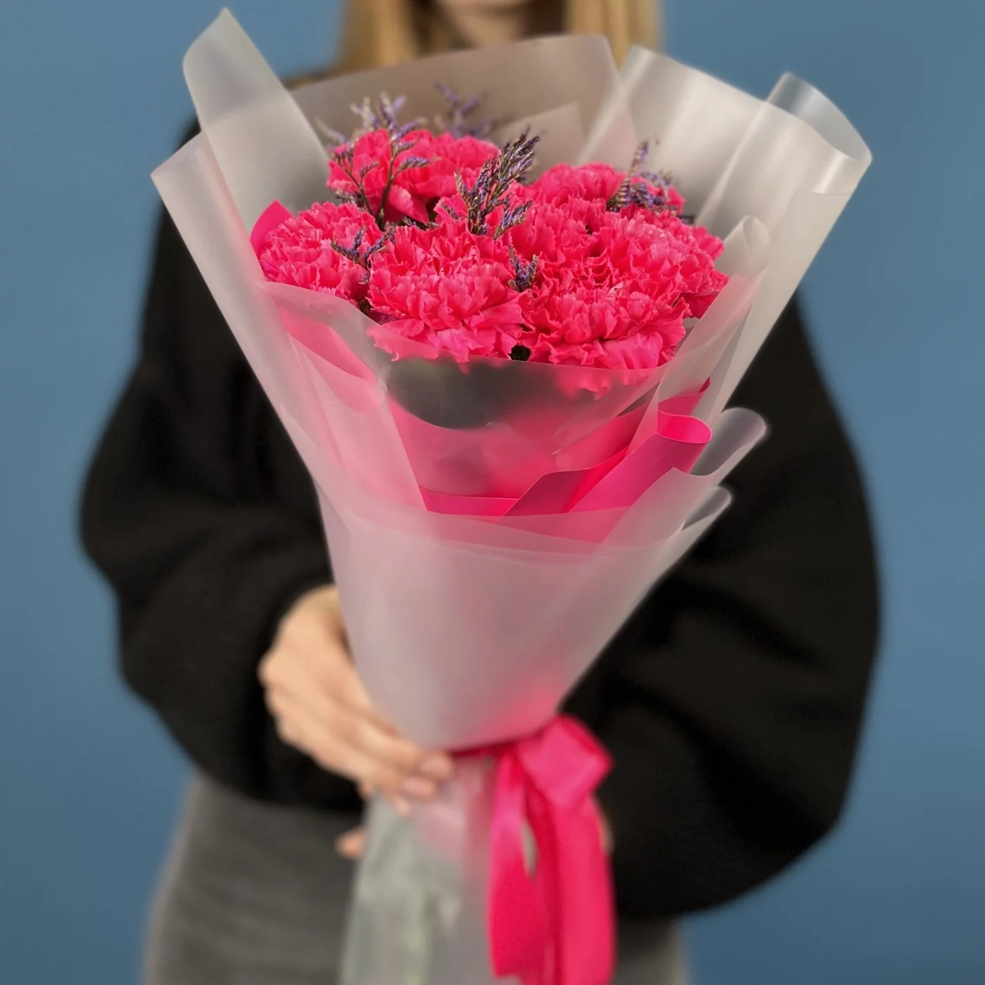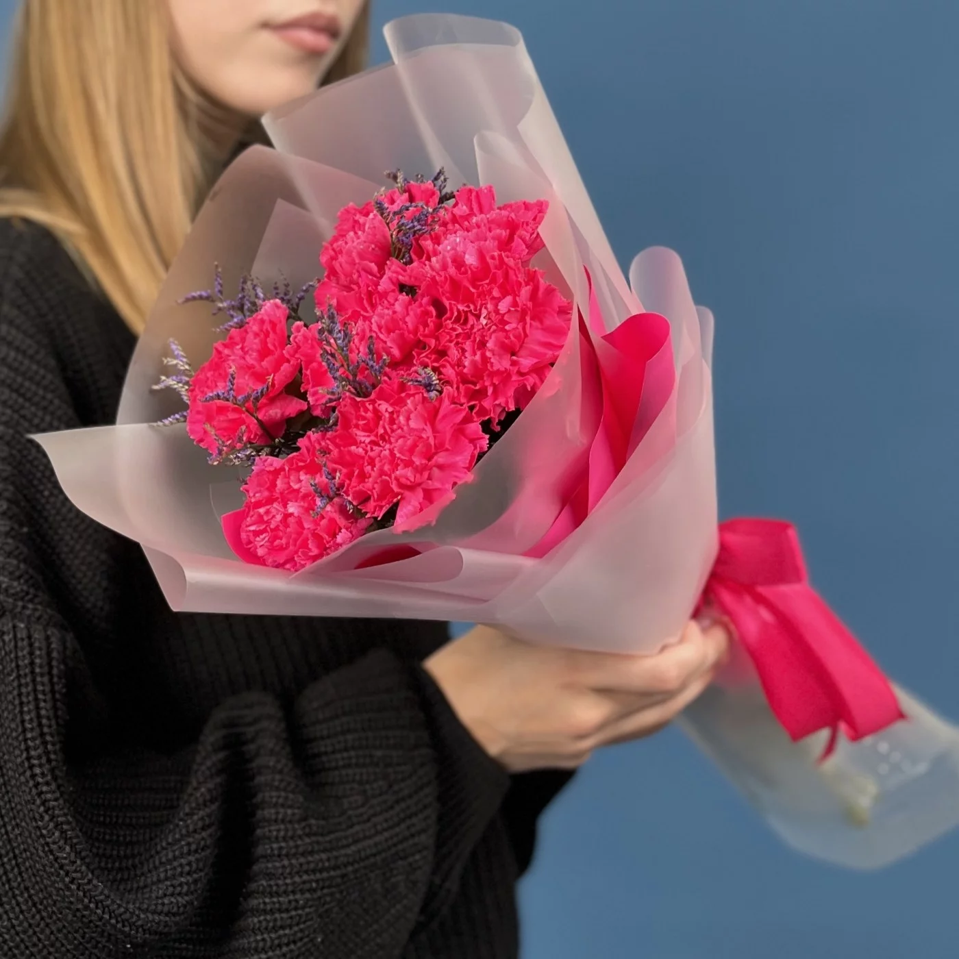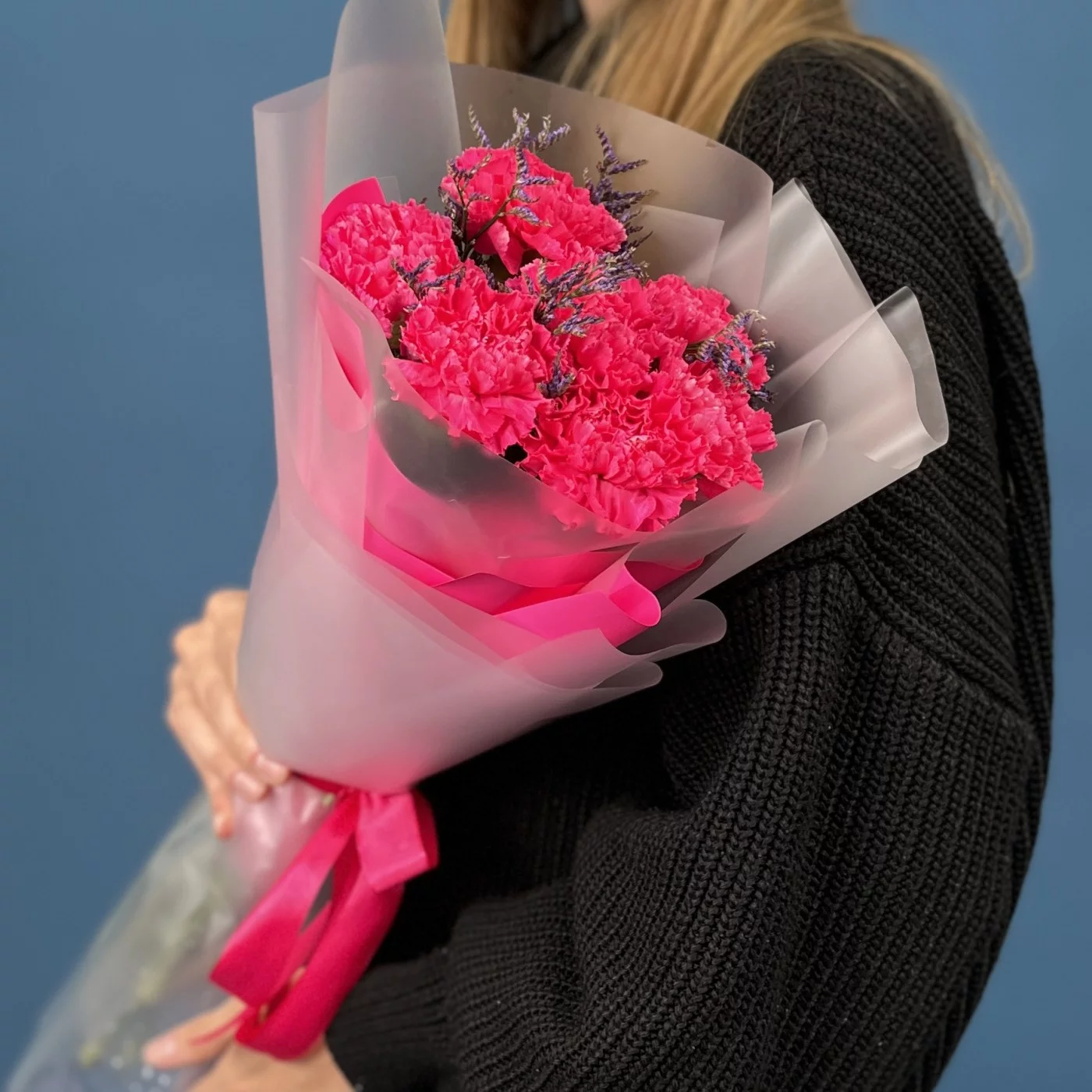 Букет из 7 малиновых гвоздик с лимониумом — это яркий и стильный подарок, который подчеркнет ваши чувства и создаст атмосферу радости и тепла.