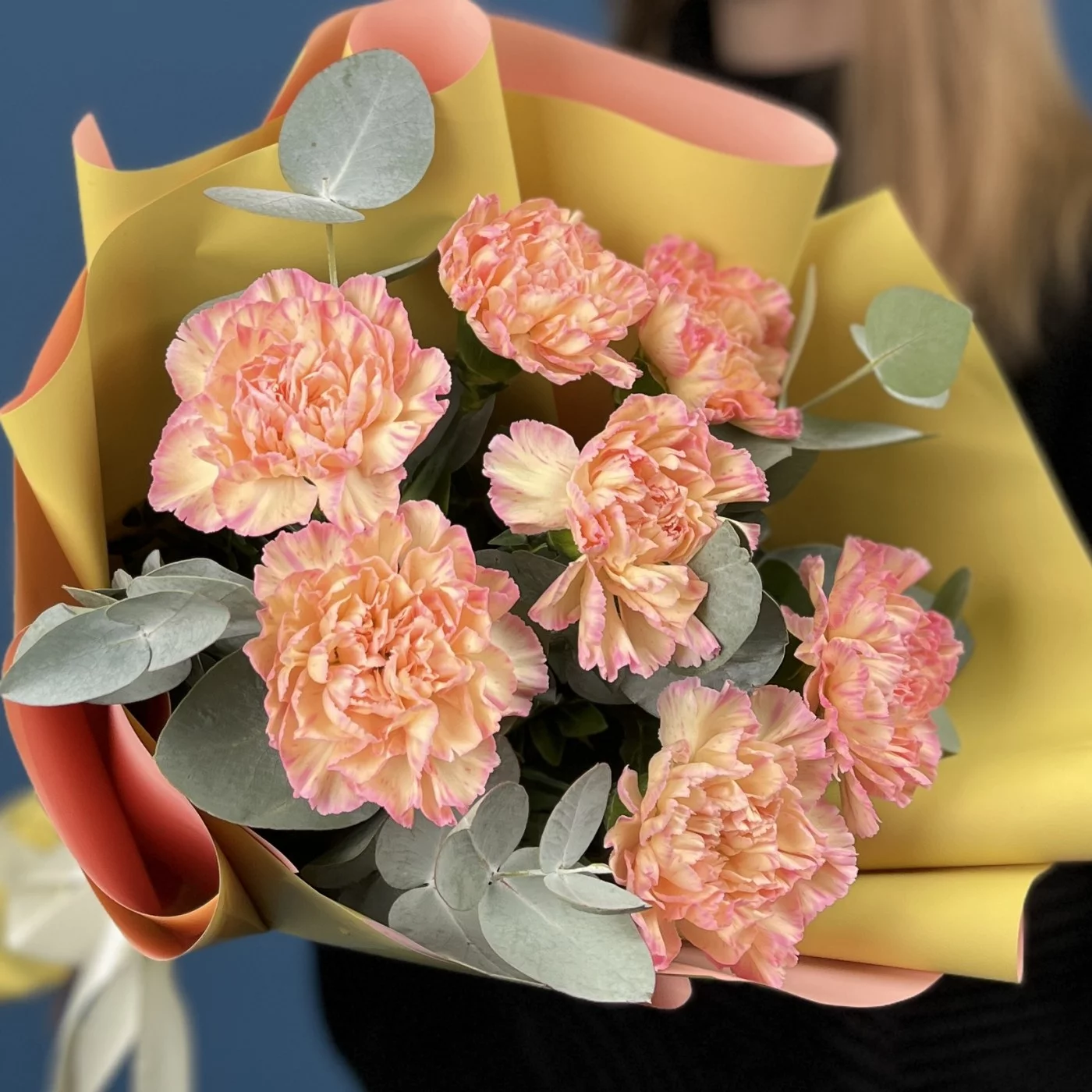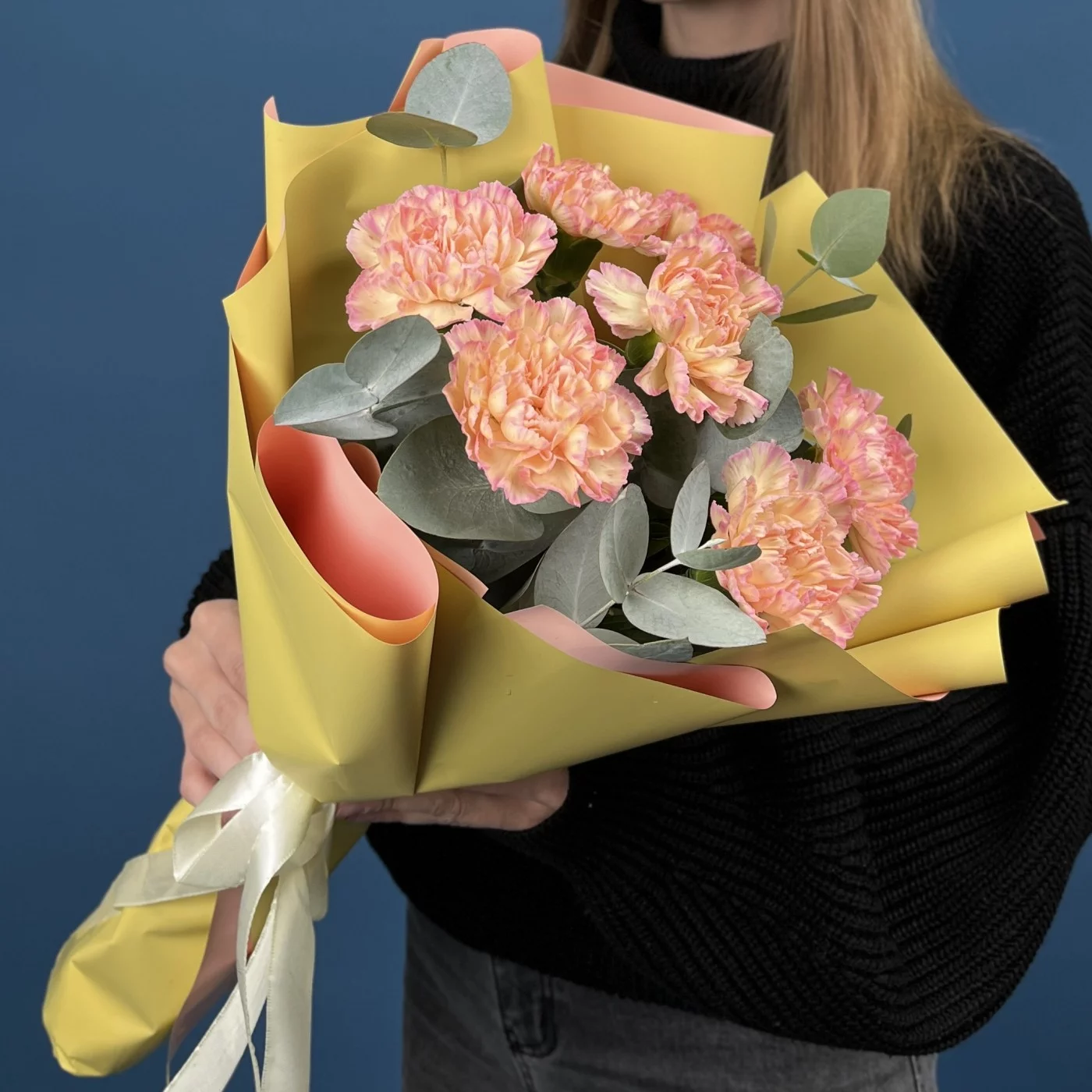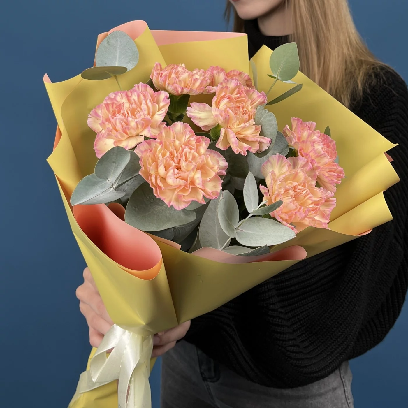 7 нежных персиковых гвоздик с эвкалиптом — это очень тёплый, душевный и солнечный подарок.