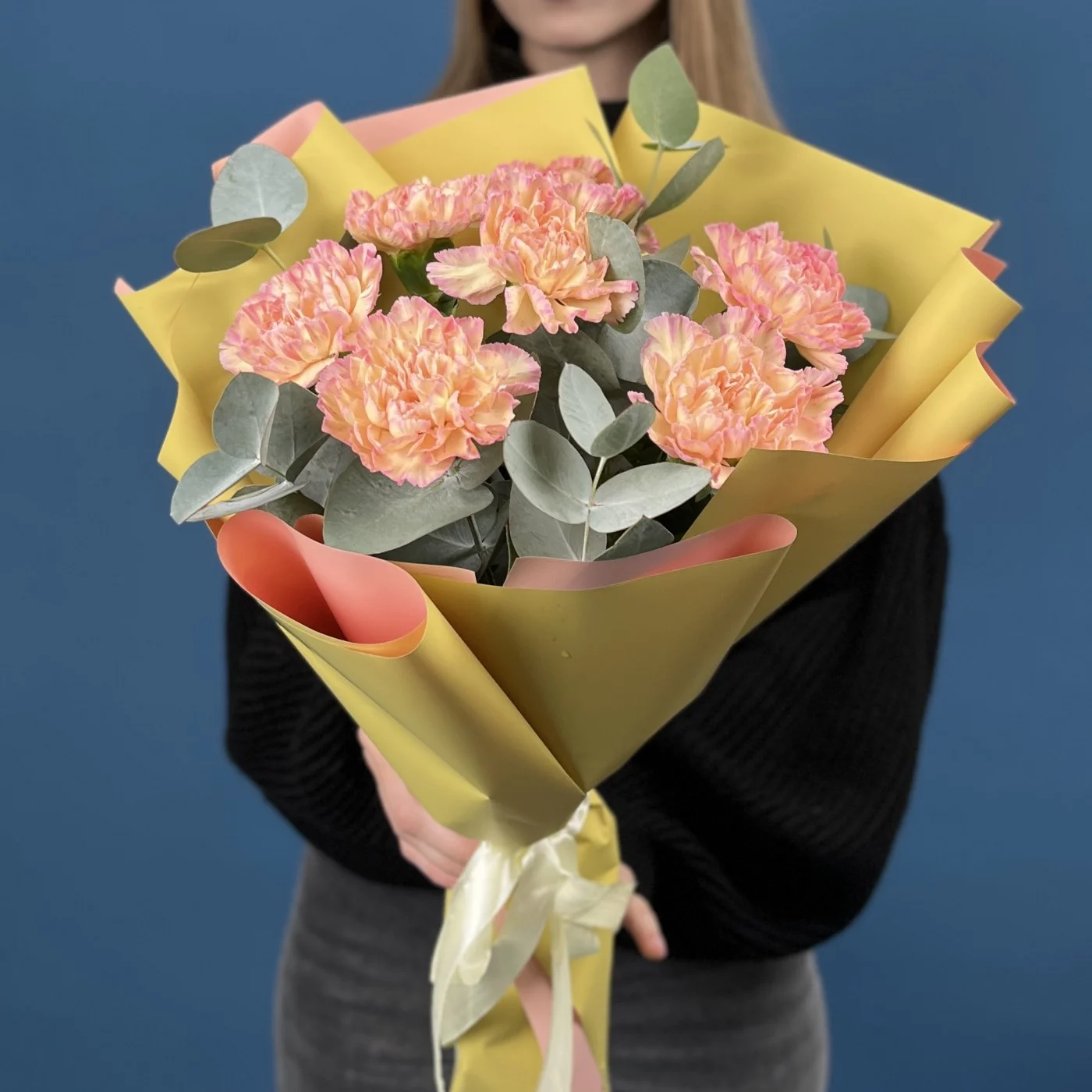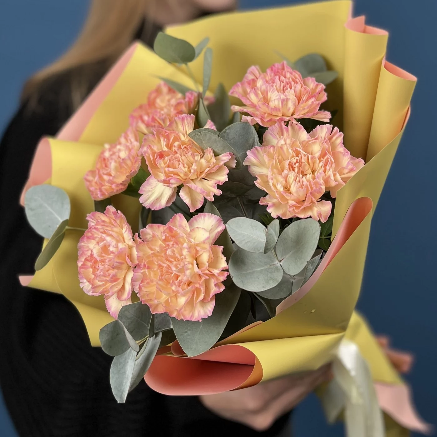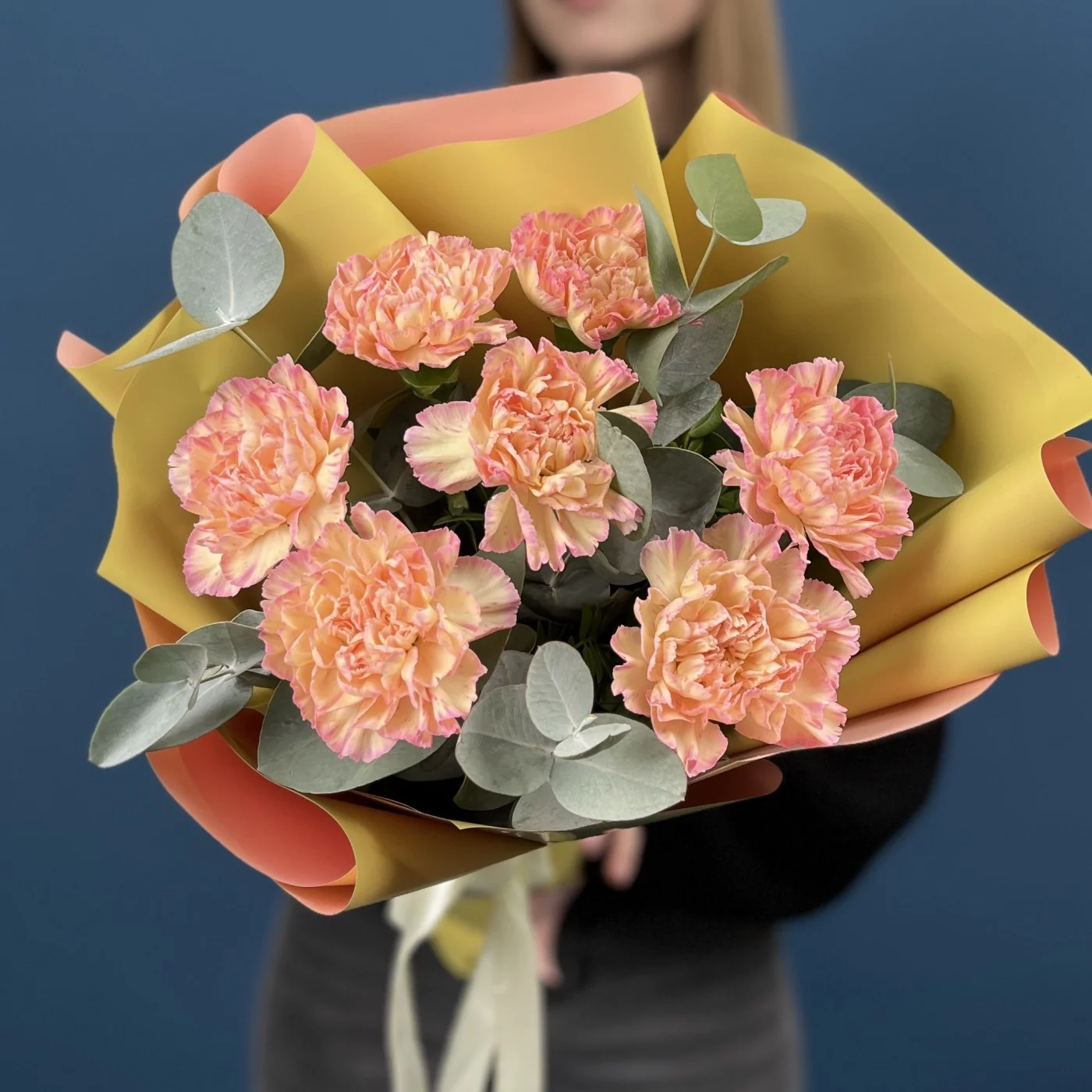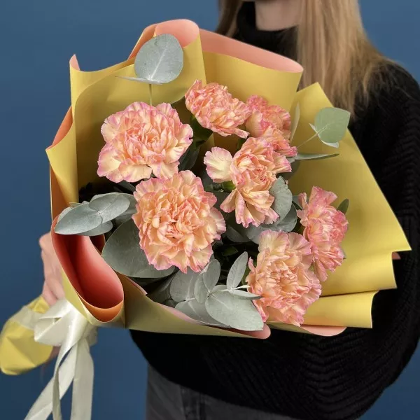 7 нежных персиковых гвоздик с эвкалиптом — это очень тёплый, душевный и солнечный подарок.