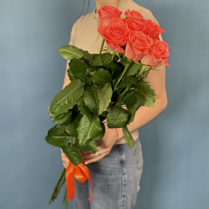 Букет из 7 оранжевых роз сорта Вау длиной 80 см — это эффектная и выразительная композиция, в которой гармонично сочетаются энергия и элегантность. Высокие стебли придают букету статусность и визуальную лёгкость, а крупные бутоны делают его по-настоящему впечатляющим.