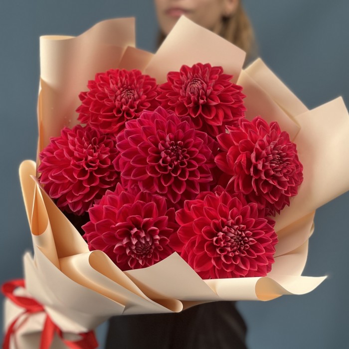 7 пышных красных георгин — это изысканная и страстная композиция, которая сразу привлекает внимание своей насыщенной глубиной цвета и объемной формой. Ярко-красные лепестки, многослойные и бархатистые, создают ощущение роскоши и тепла, символизируя любовь, страсть и энергию. Такой букет идеально подходит для выражения сильных чувств, будь то романтическое признание или торжественное поздравление.