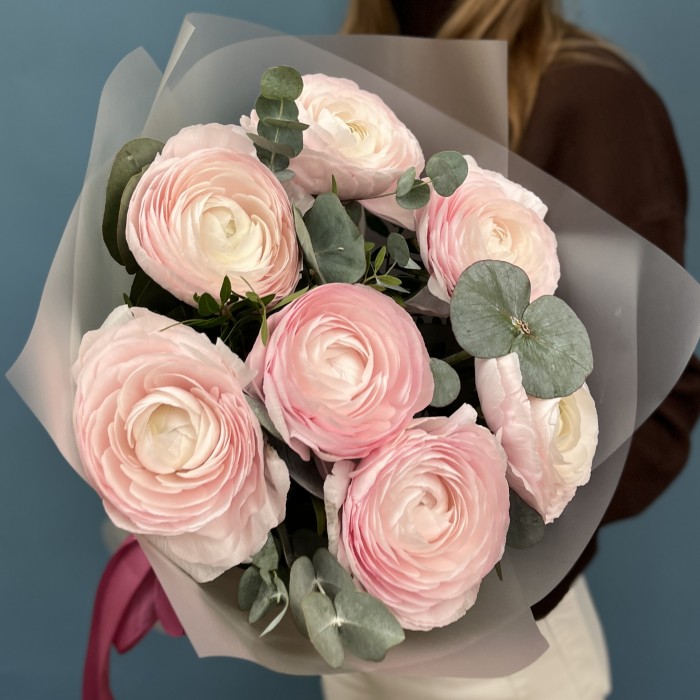 Композиция из 7 пышных розовых ранункулюсов с эвкалиптом — это яркое выражение заботы и любви. Такой нежный и стильный букет обязательно принесет радость и умиротворение тому, кто его получит!