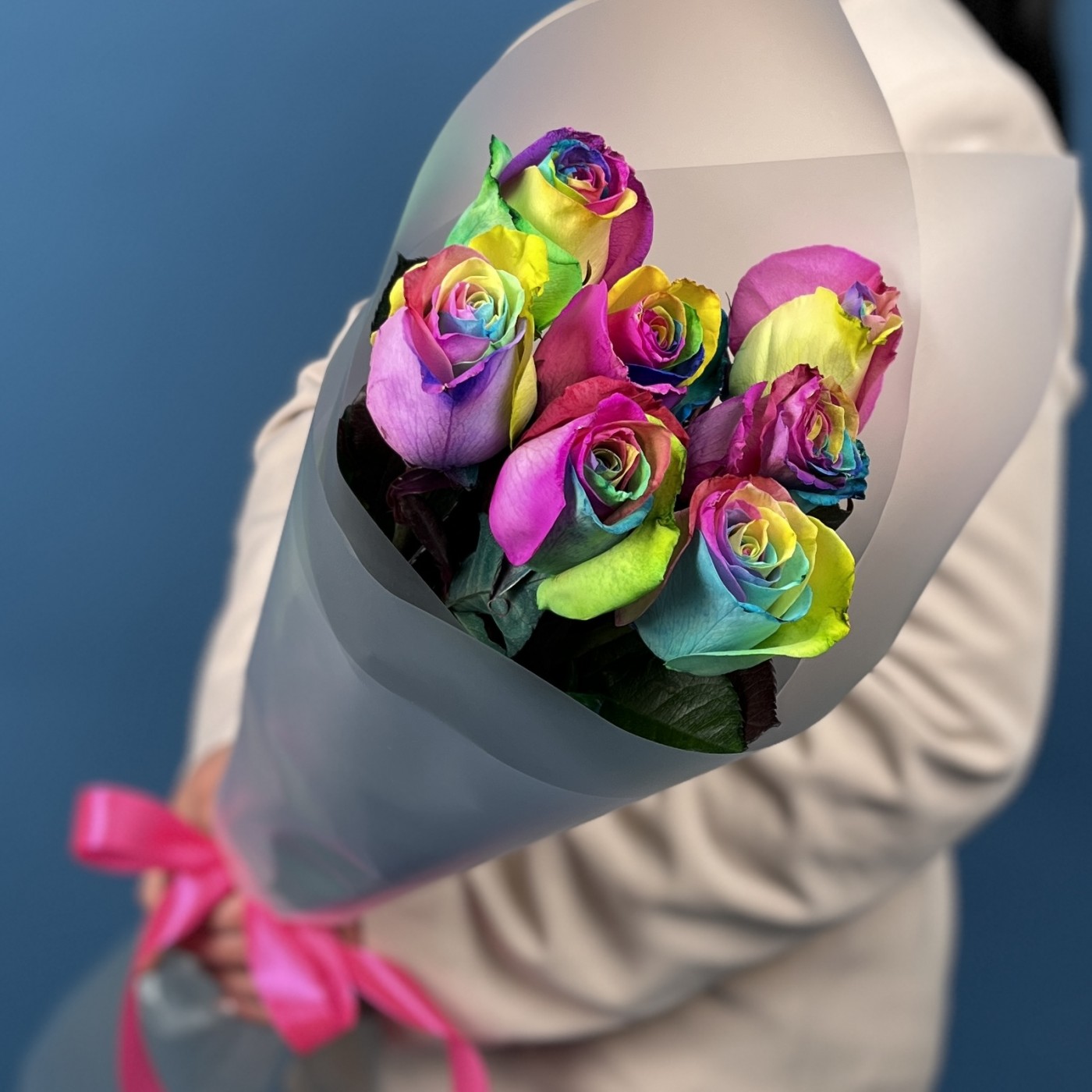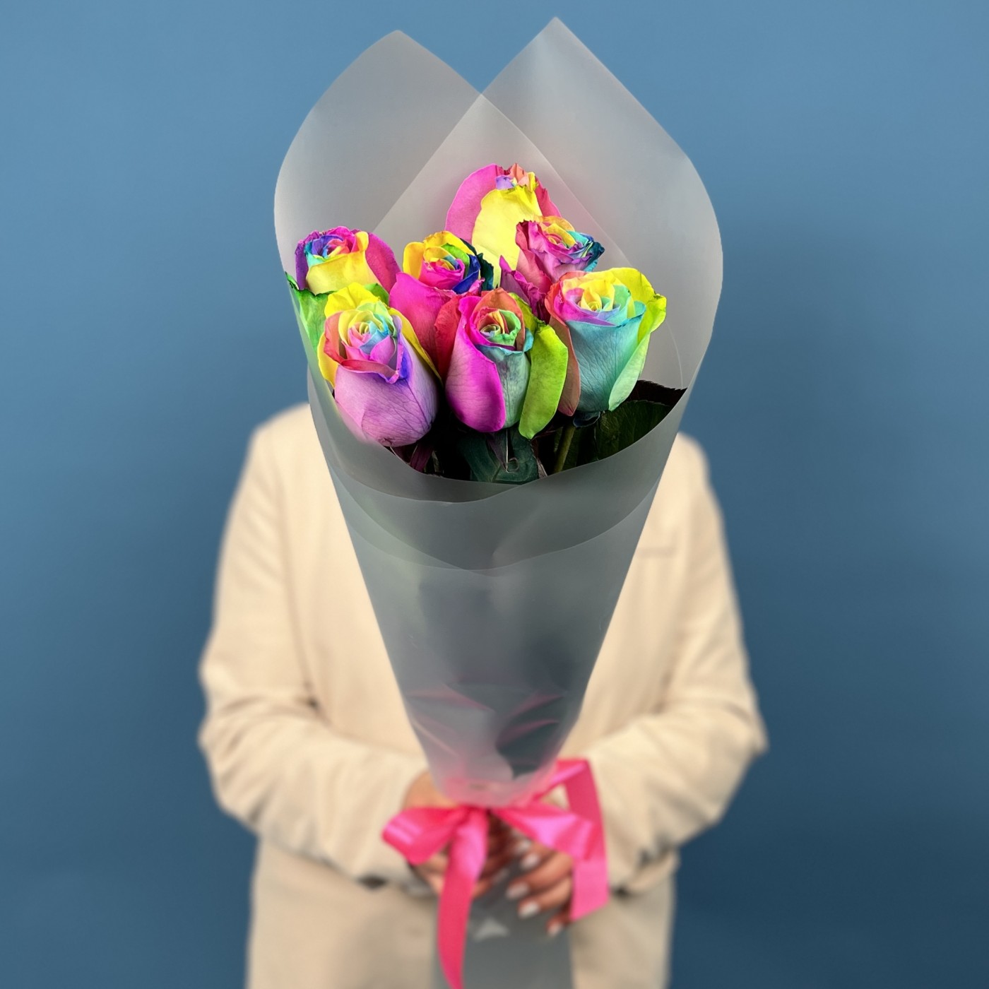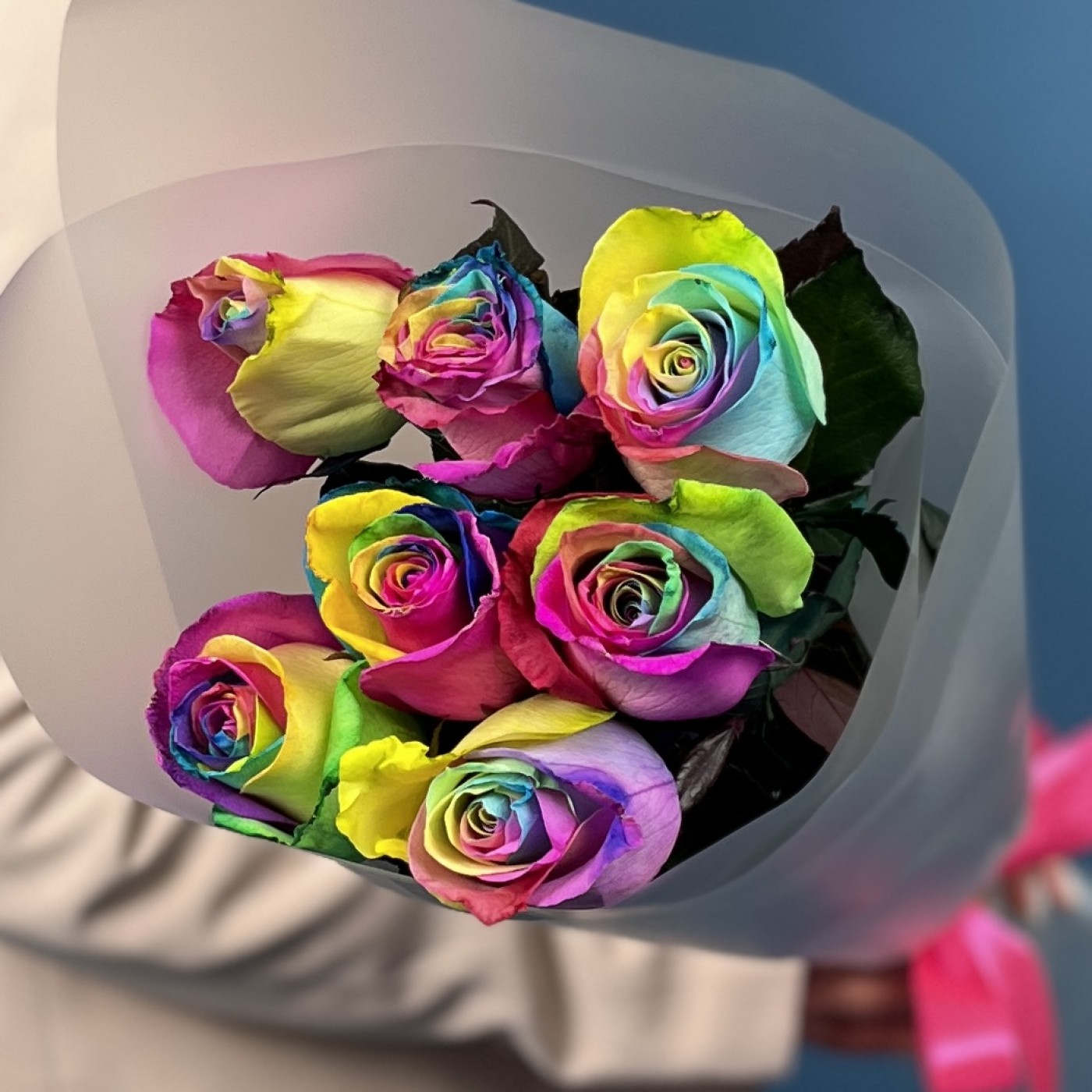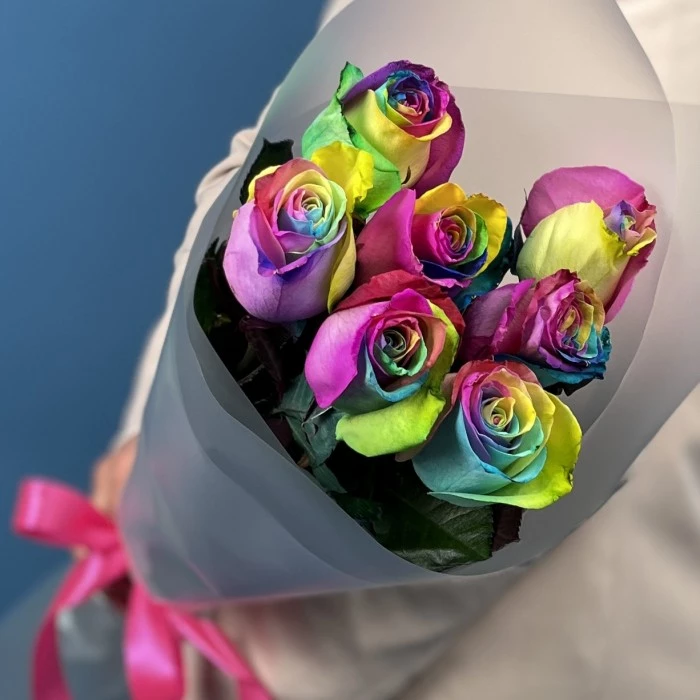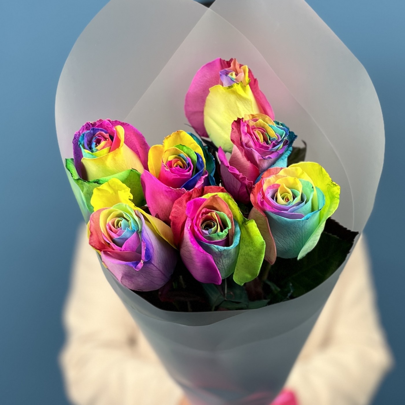 Очаровательный и яркий букет из 7 радужных роз с длиной стебля 60 см. Каждая роза украшена разноцветными лепестками, создающими эффект радуги и привлекающими внимание своей необычностью. Такой букет станет ярким акцентом на празднике или оригинальным подарком, эффектно выражая радость, позитив и индивидуальность.Очаровательный и яркий букет из 7 радужных роз с длиной стебля 60 см. Каждая роза украшена разноцветными лепестками, создающими эффект радуги и привлекающими внимание своей необычностью. Такой букет станет ярким акцентом на празднике или оригинальным подарком, эффектно выражая радость, позитив и индивидуальность.