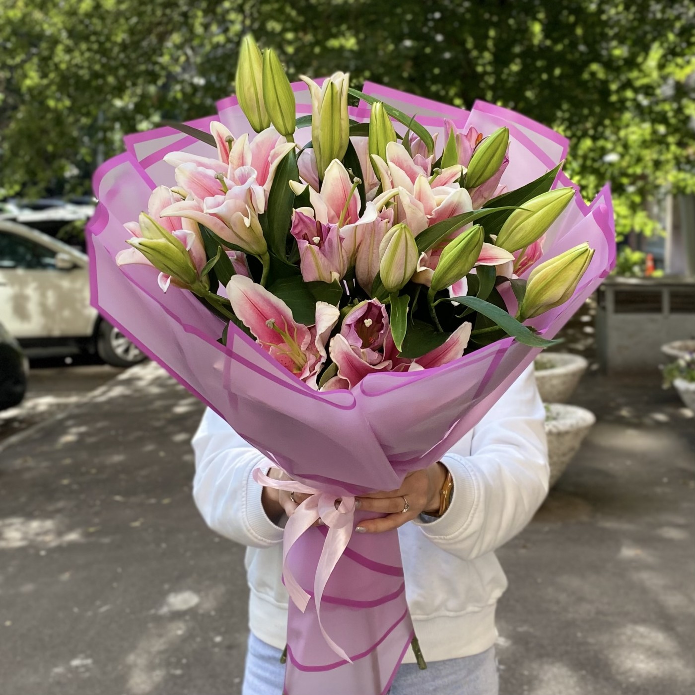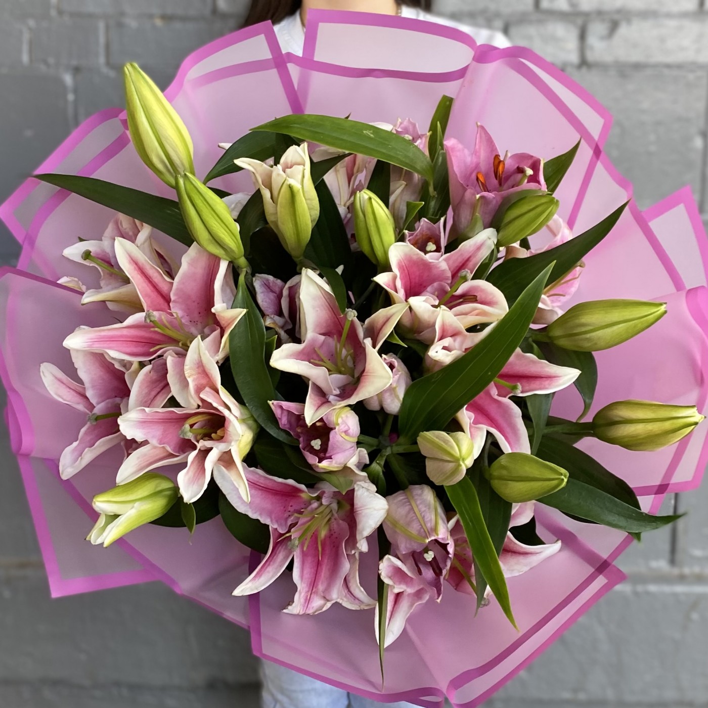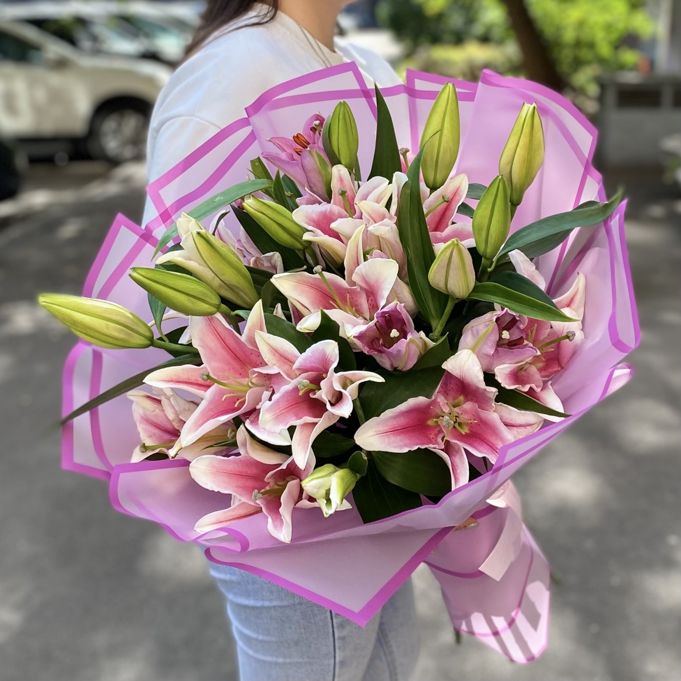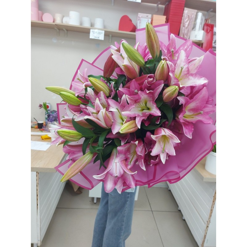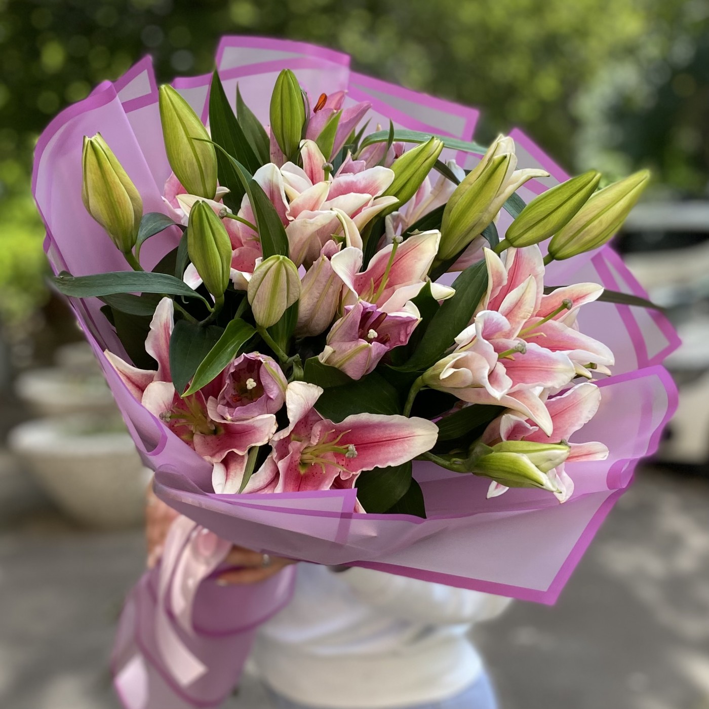 Ароматный букет из 7 розовых лилий в красивой упаковке.