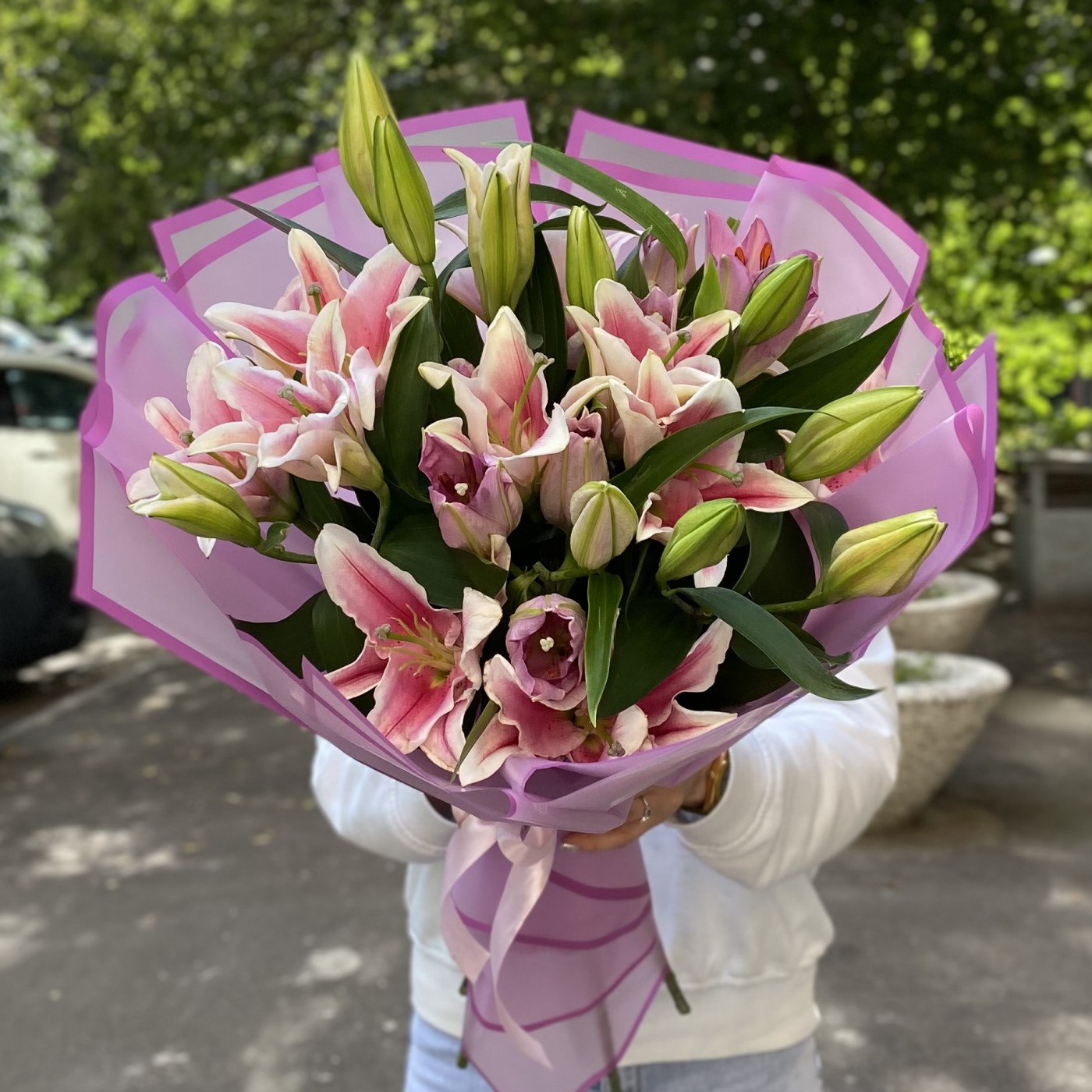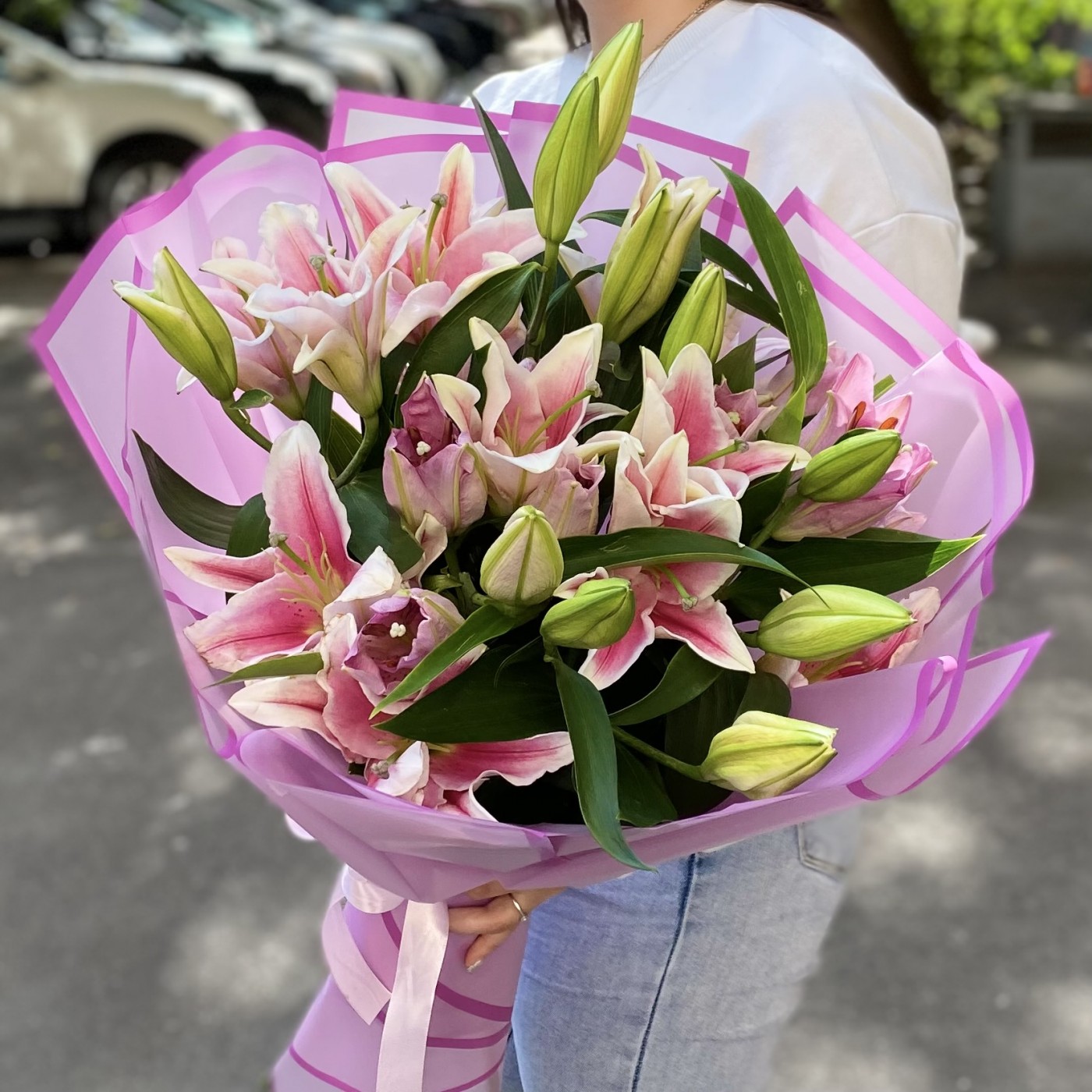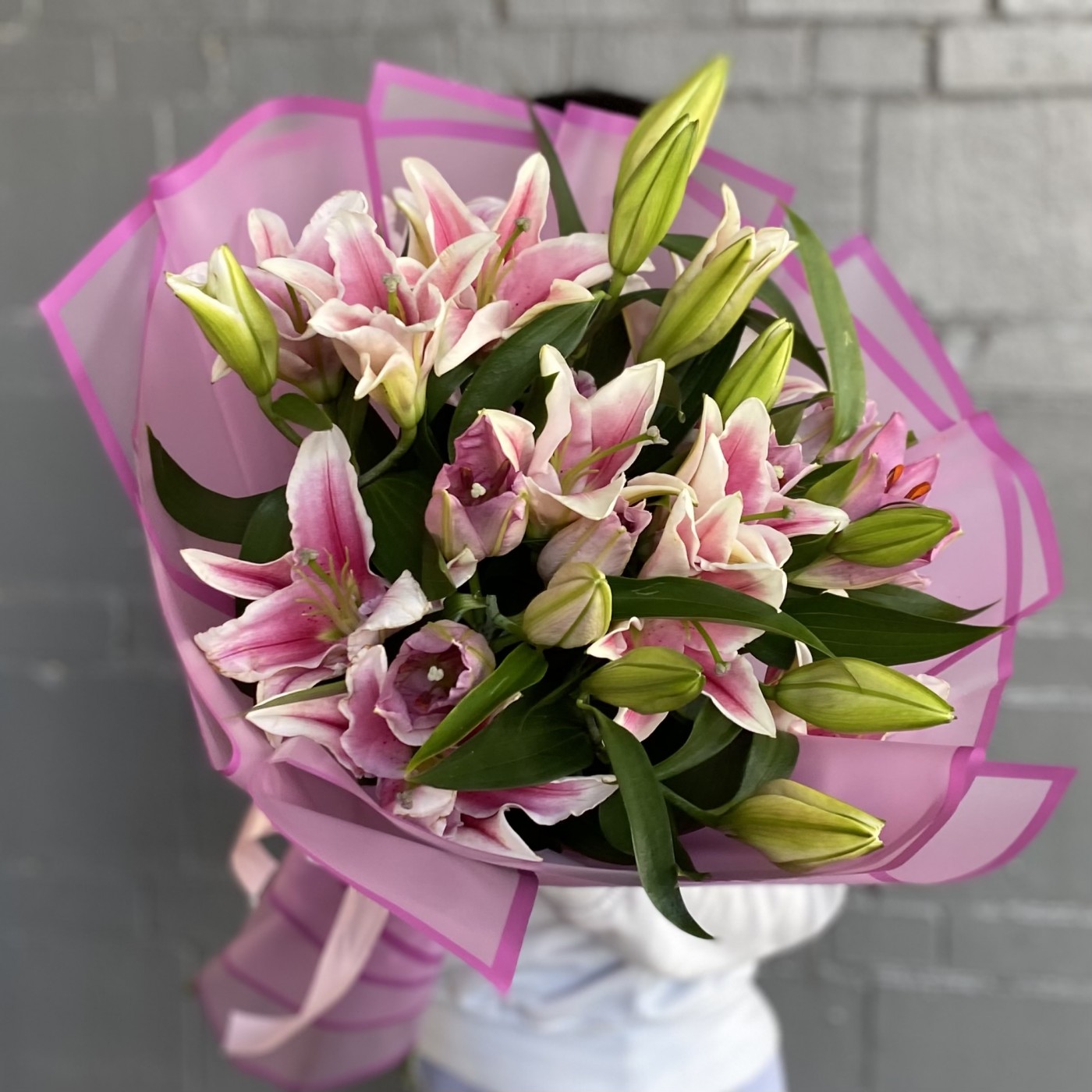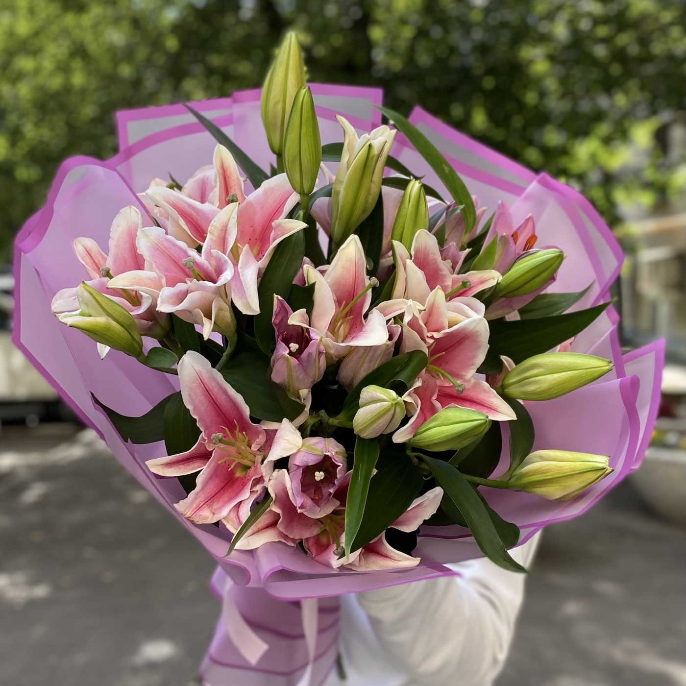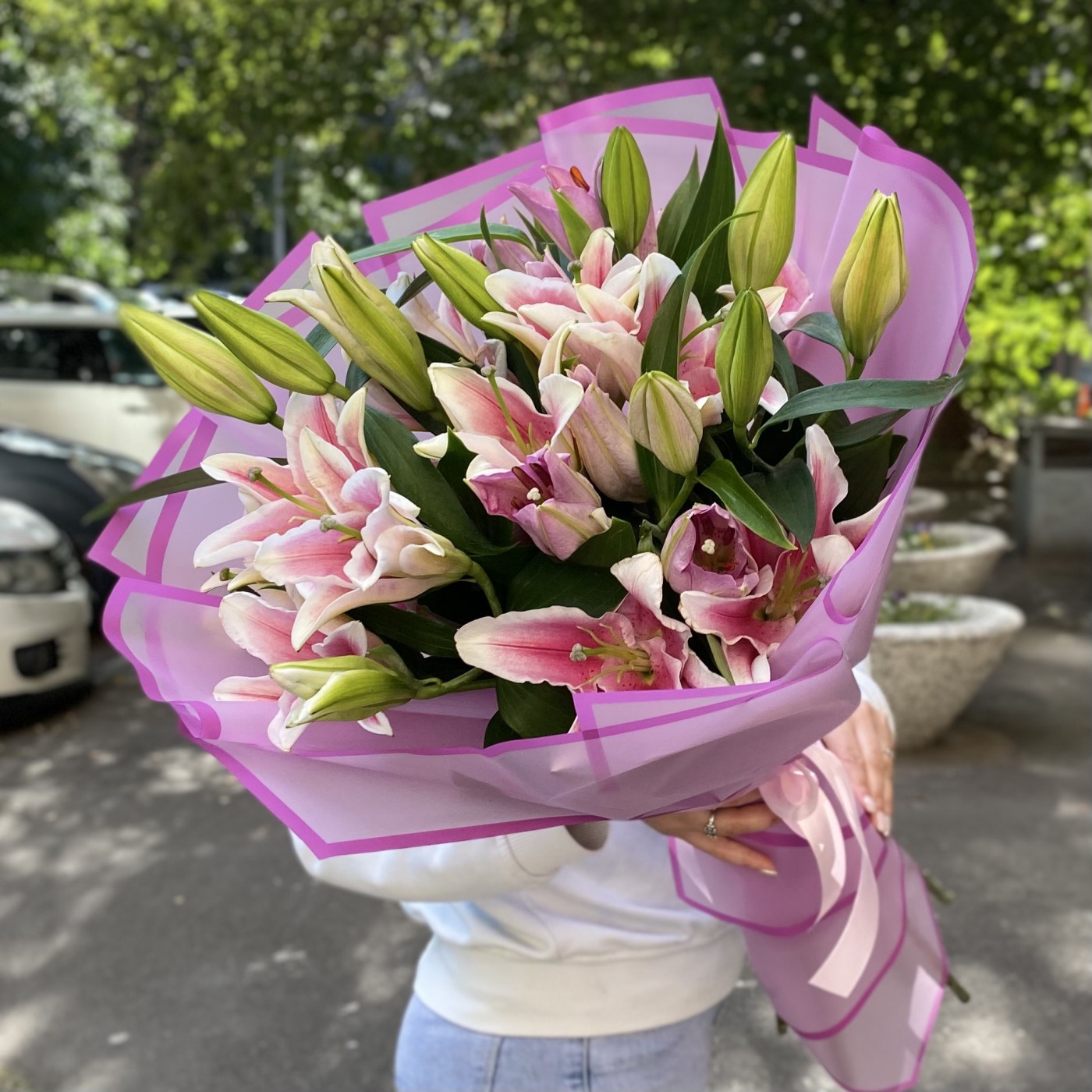 Ароматный букет из 7 розовых лилий в красивой упаковке.