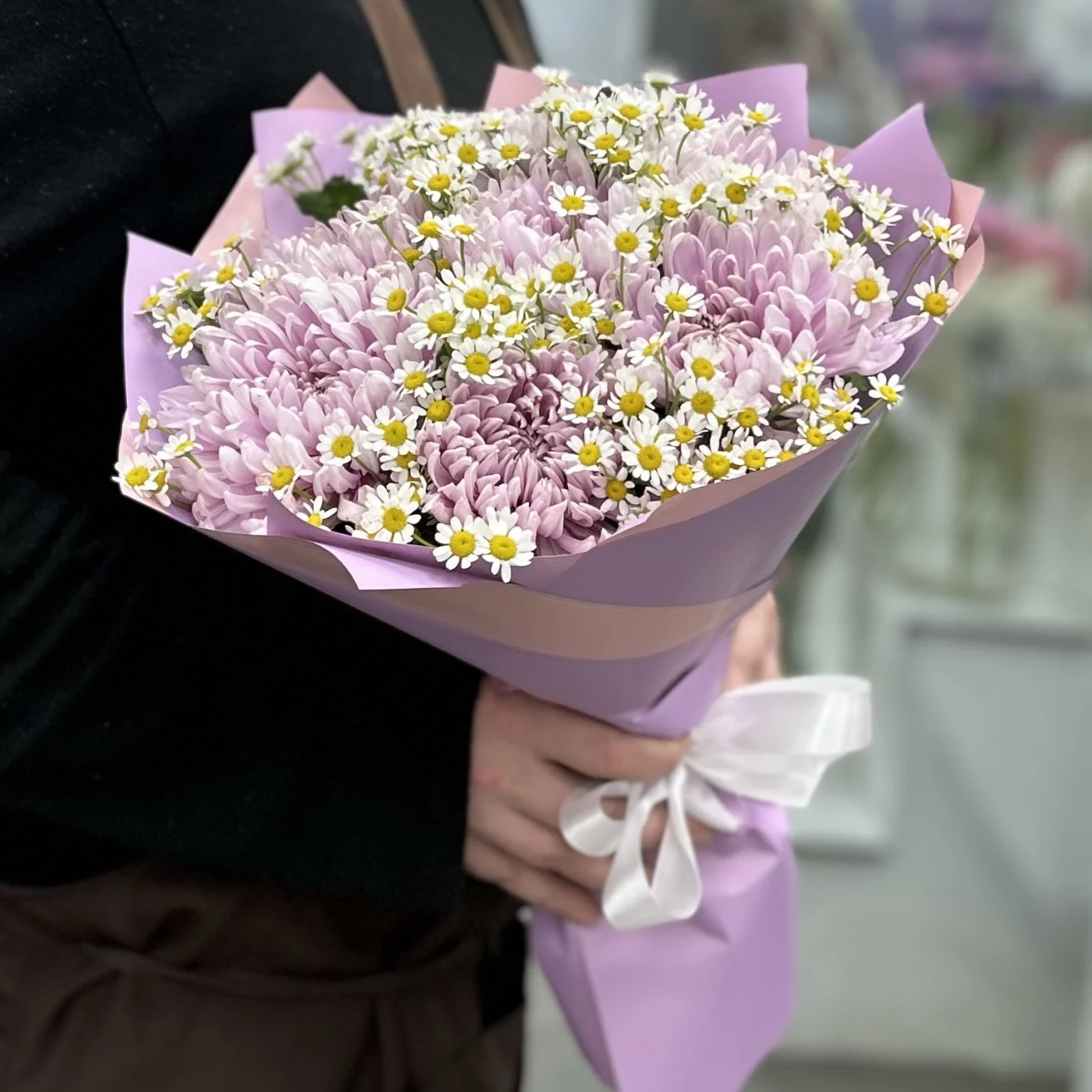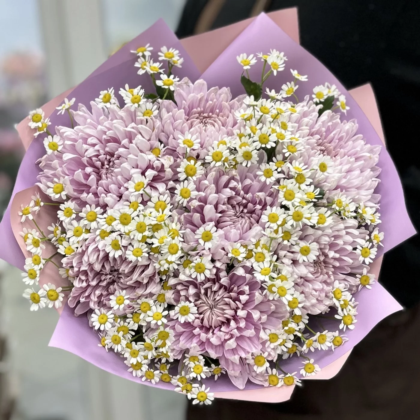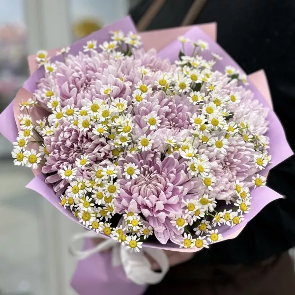 Букет из 7 сиреневых хризантем с ромашками — это не только красивое, но и символичное украшение, которое принесет радость и положительные эмоции. Он станет ярким акцентом в вашем доме или прекрасным подарком для близких.