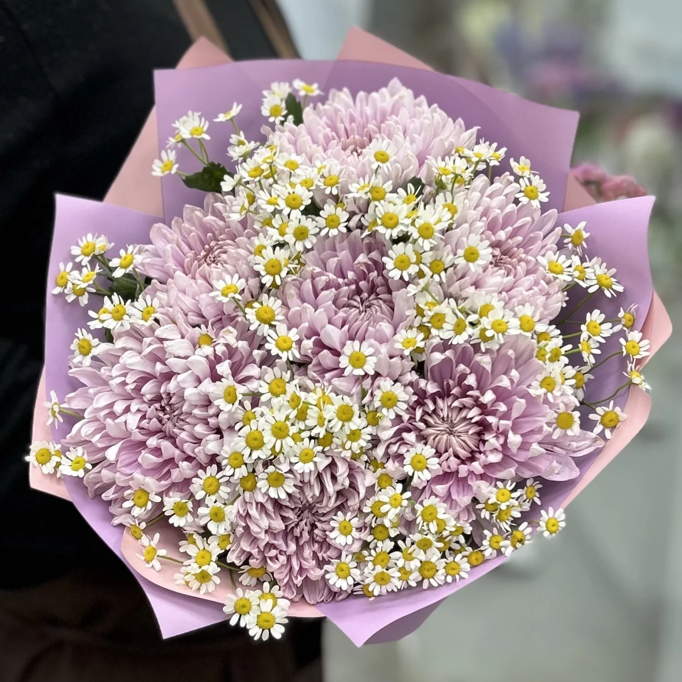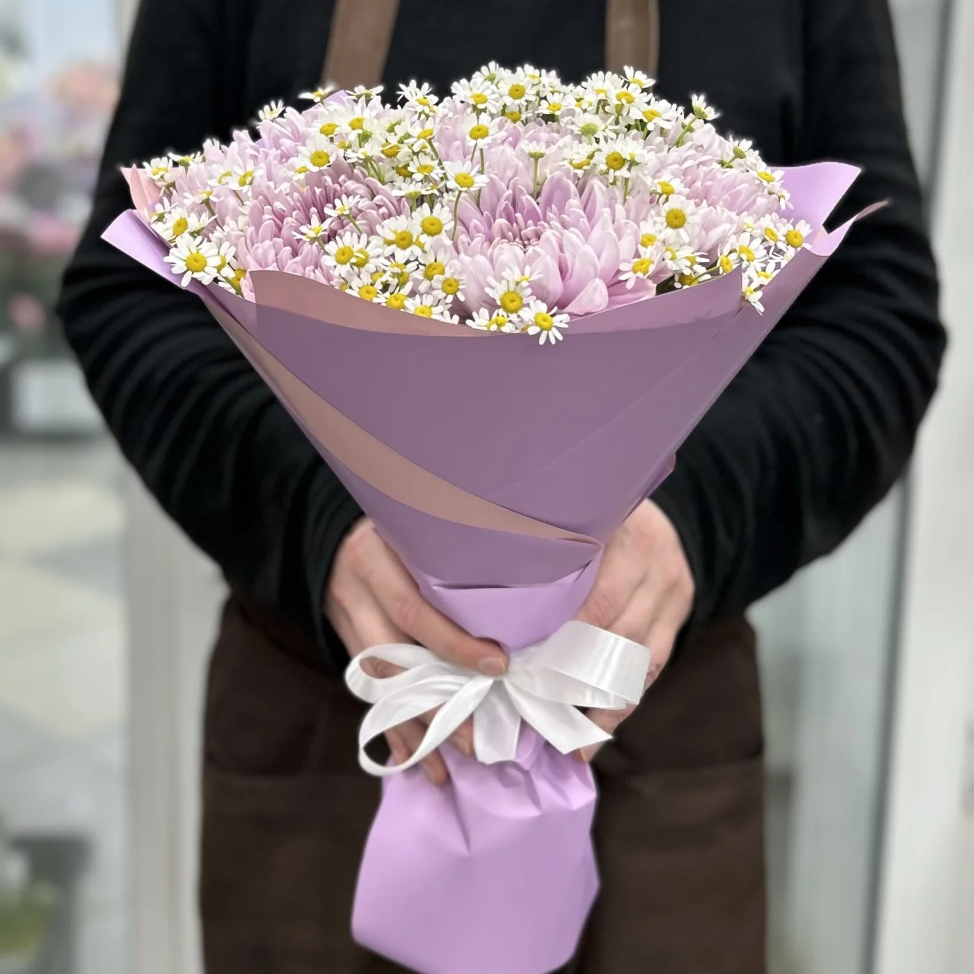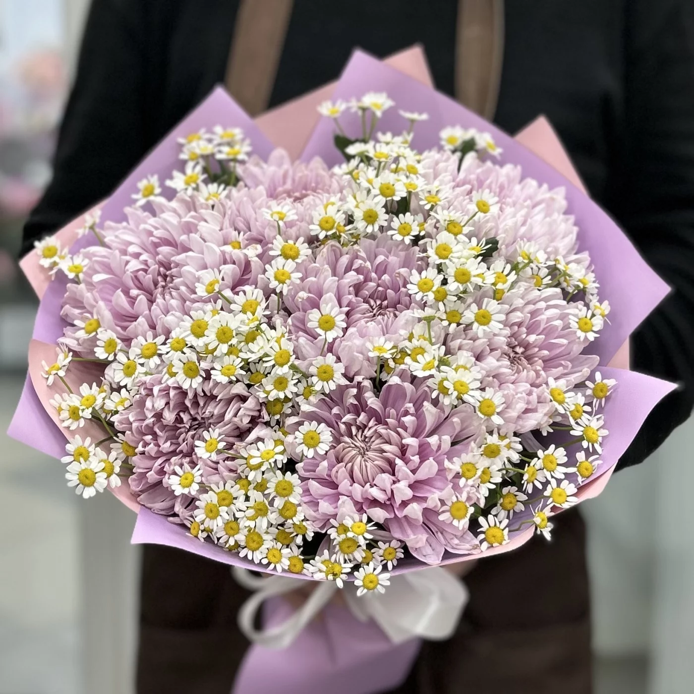Букет из 7 сиреневых хризантем с ромашками — это не только красивое, но и символичное украшение, которое принесет радость и положительные эмоции. Он станет ярким акцентом в вашем доме или прекрасным подарком для близких.