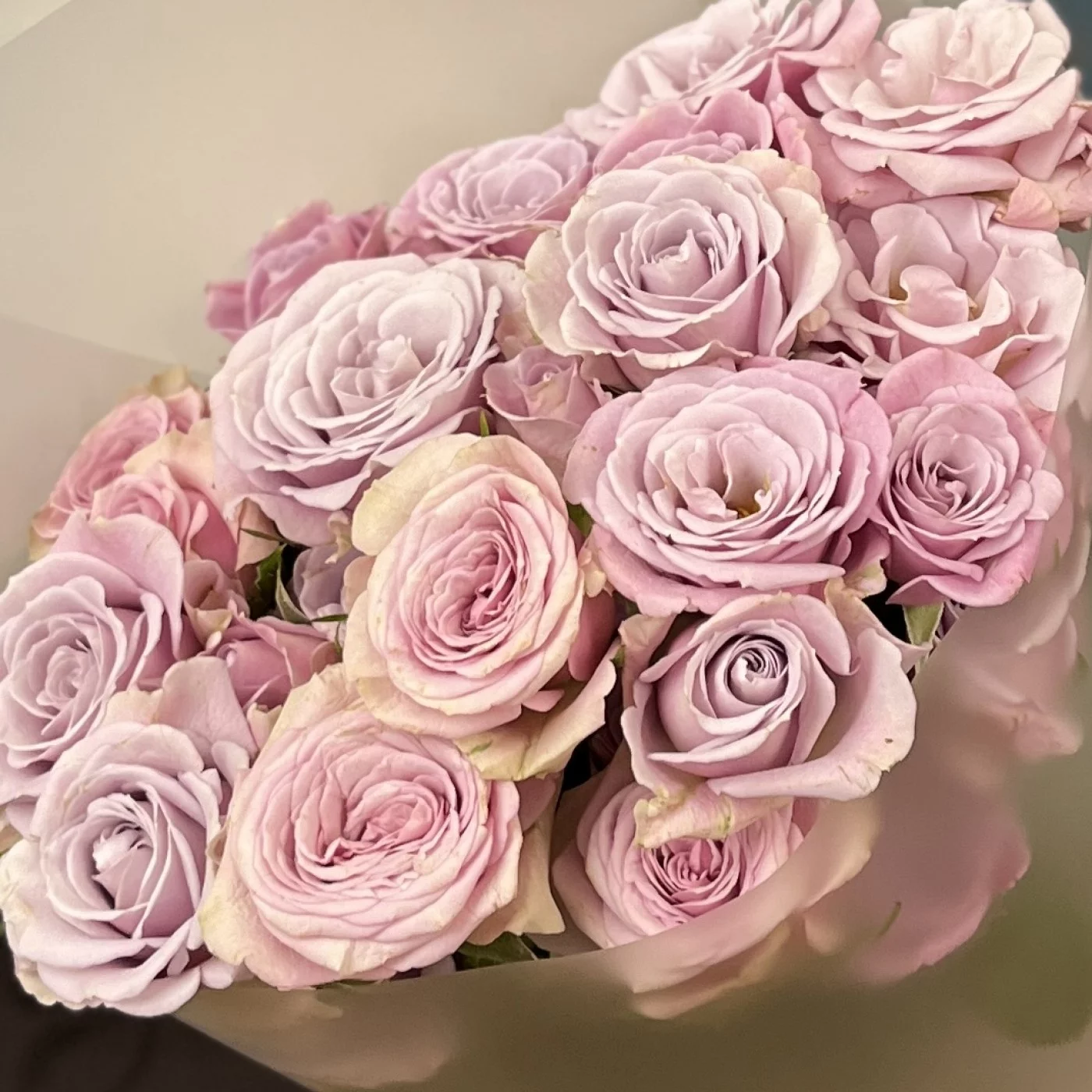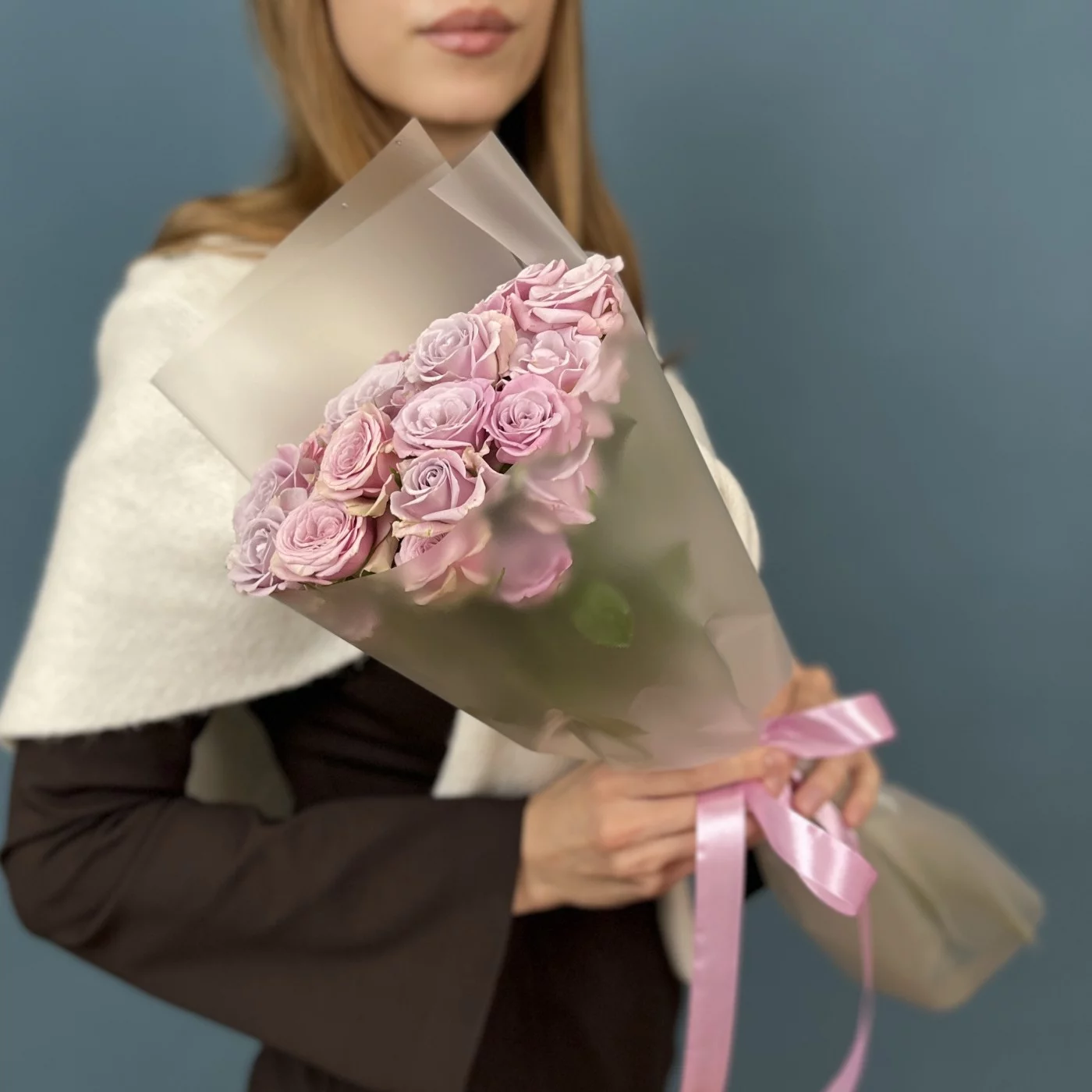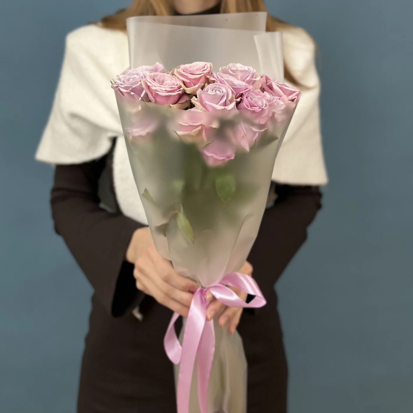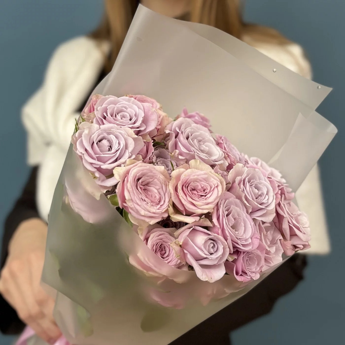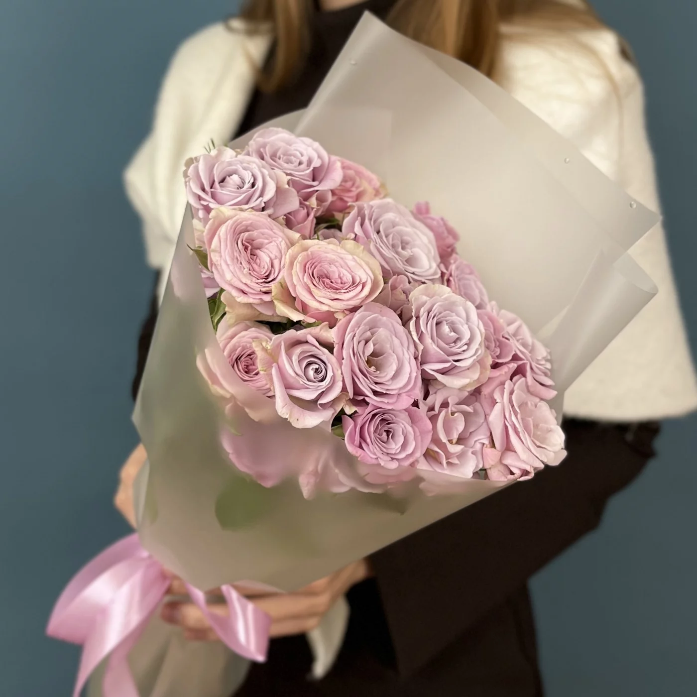 Каждая роза в букете достигает высоты 40 см и восхищает своим утонченным сиреневым оттенком, который привлекает внимание и создает романтичную атмосферу.