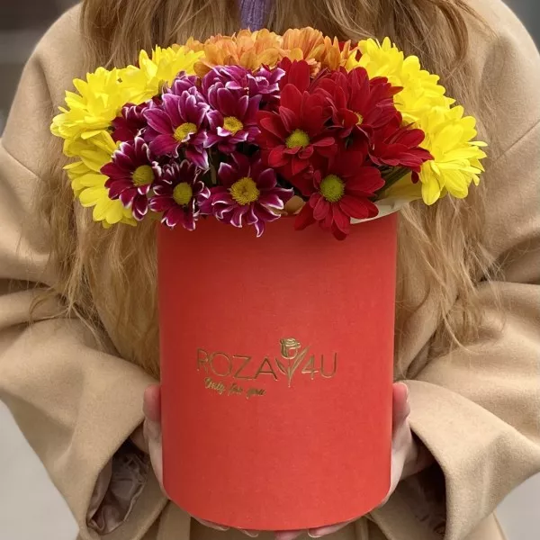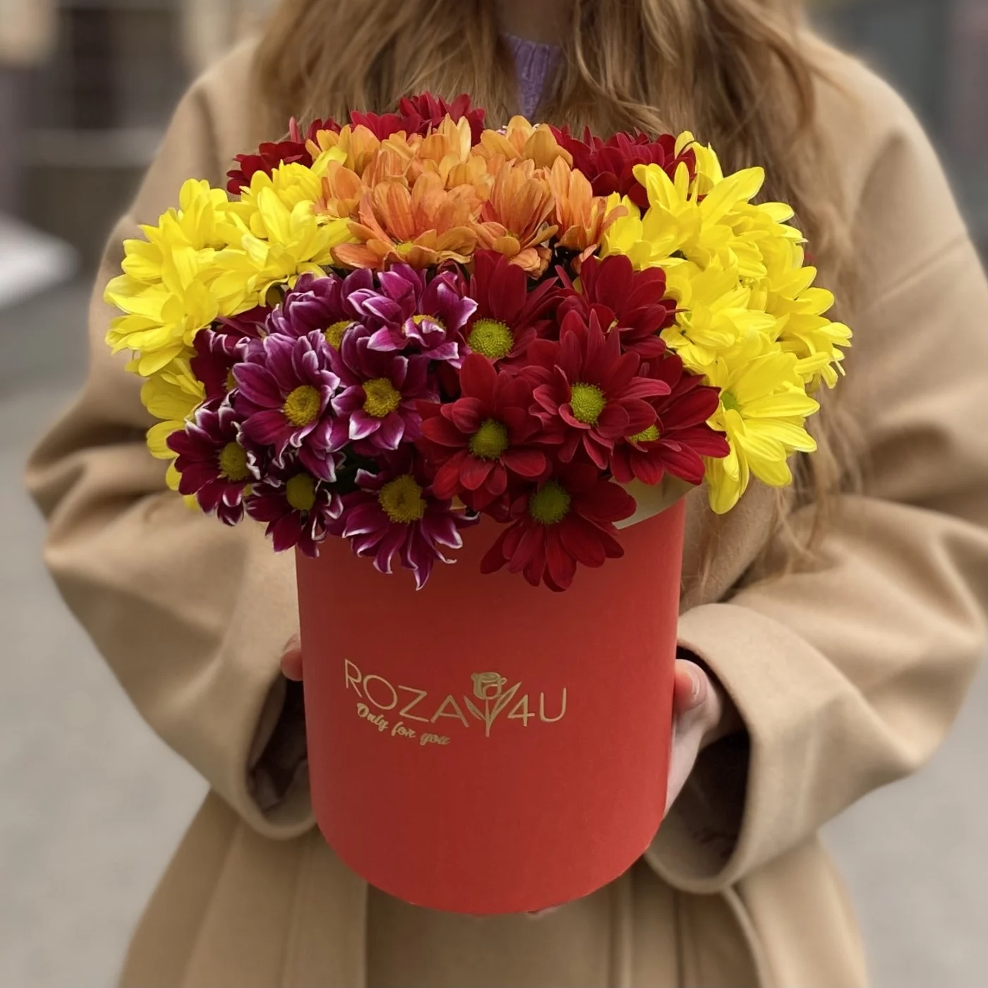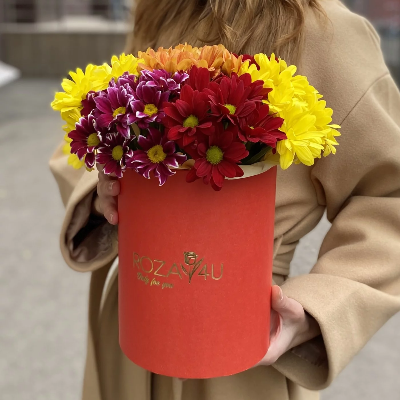 7 ярких кустовых хризантем микс в коробке станет оригинальным подарком.