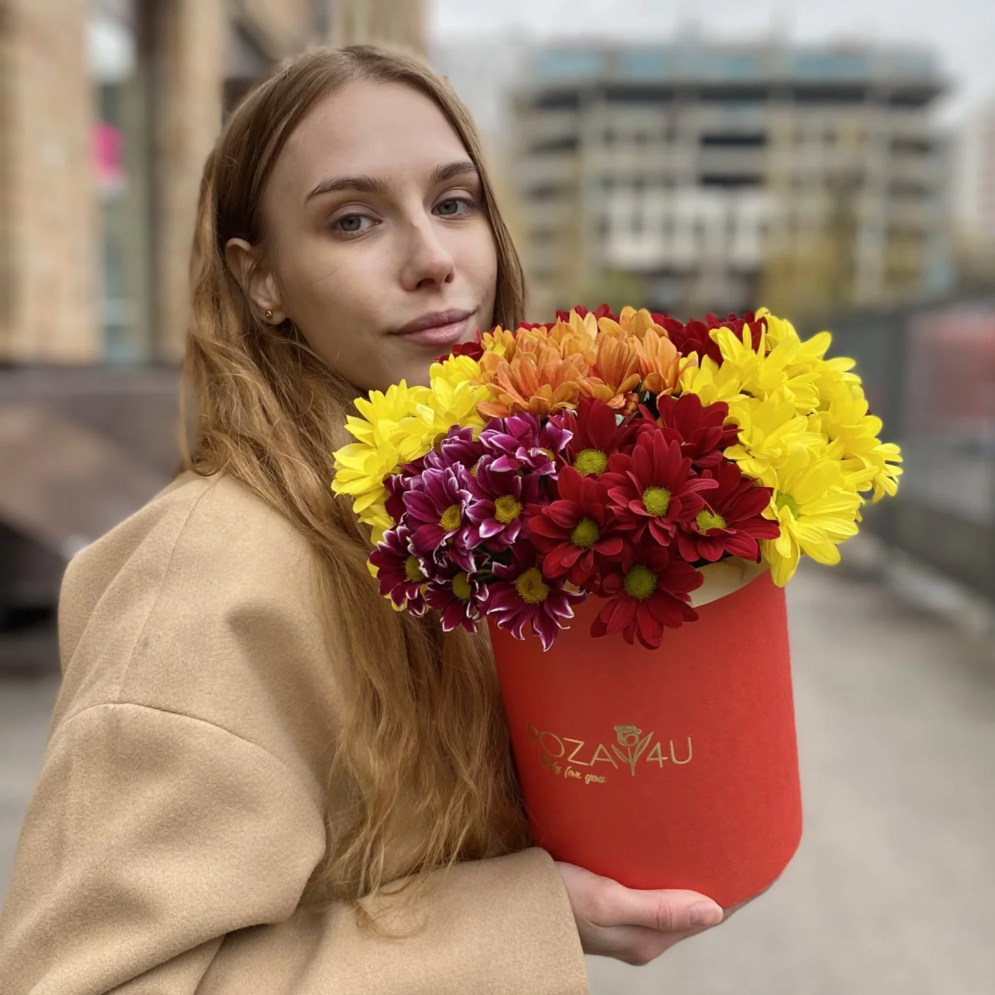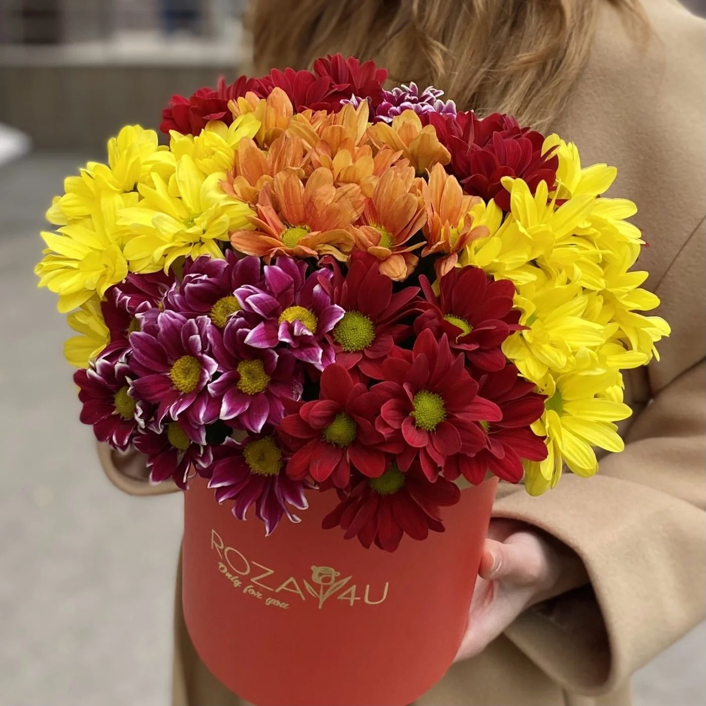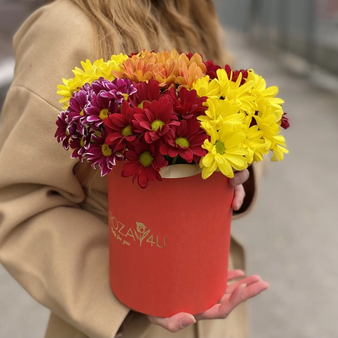 7 ярких кустовых хризантем микс в коробке станет оригинальным подарком.