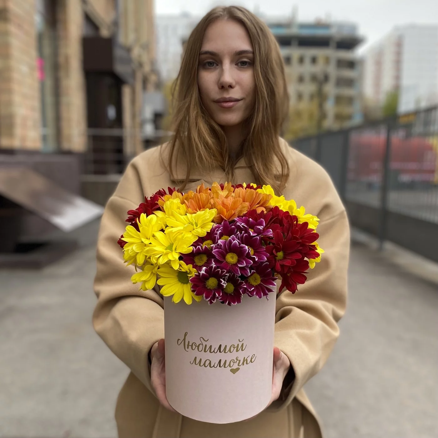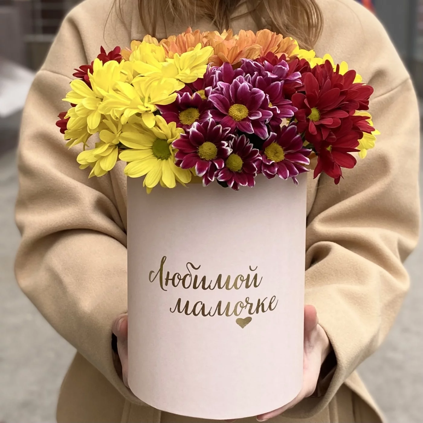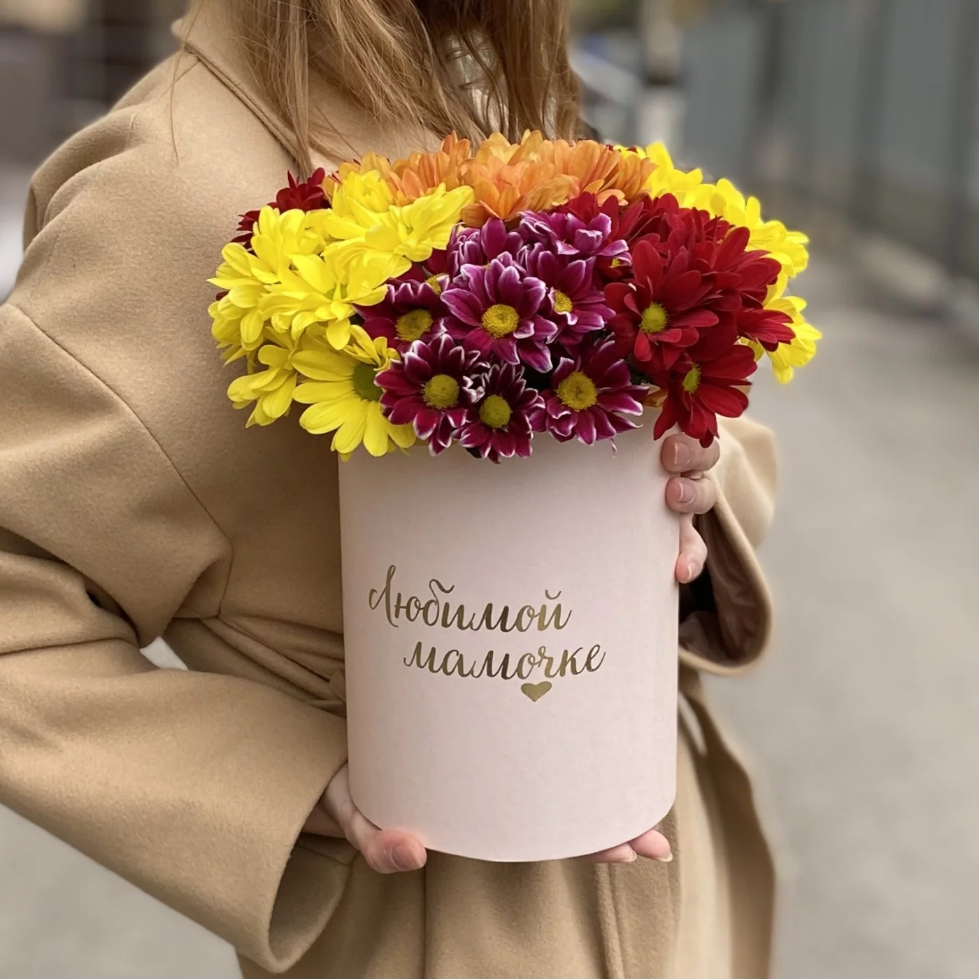 7 ярких кустовых хризантем микс в коробке Любимой Мамочке станет оригинальным подарком на День Матери.