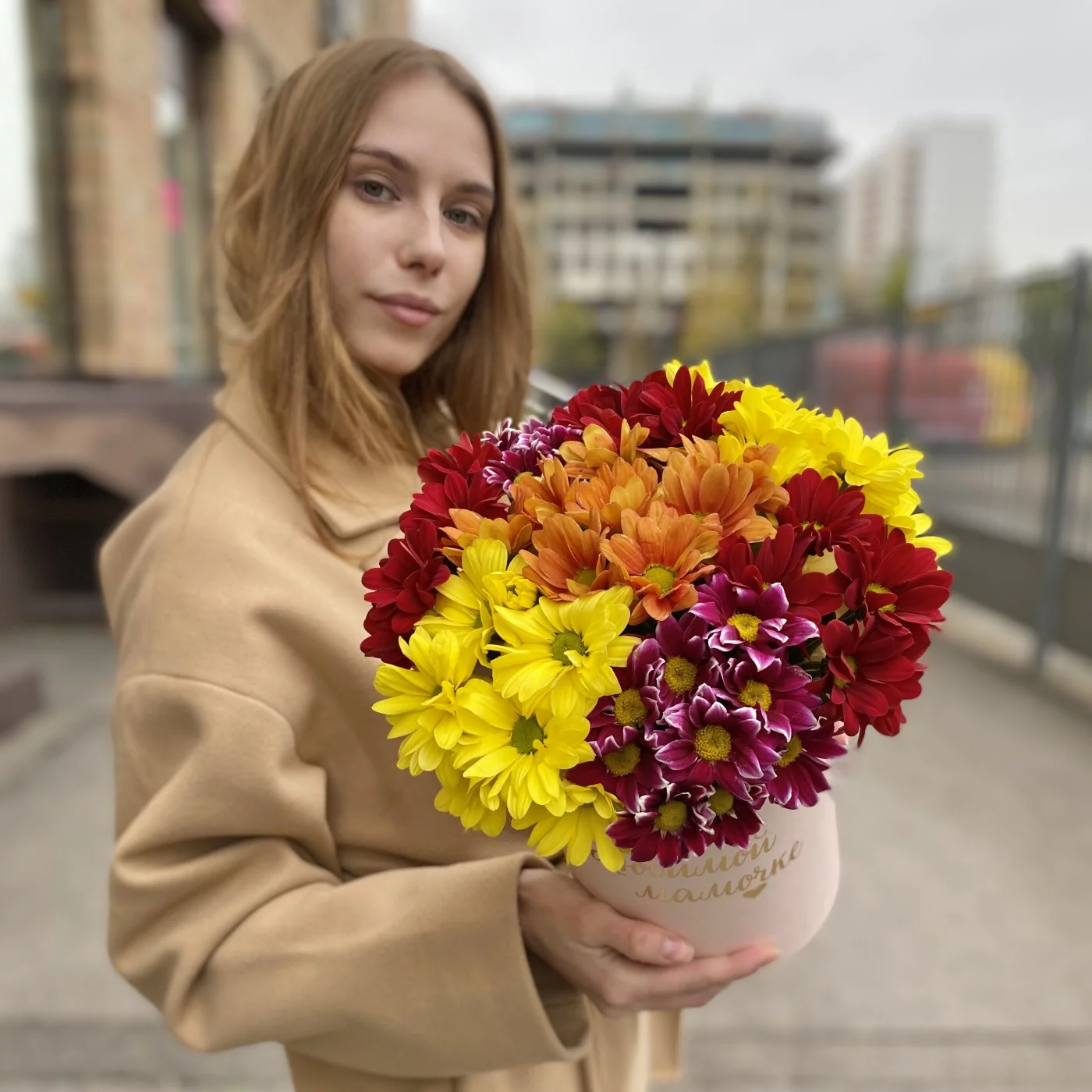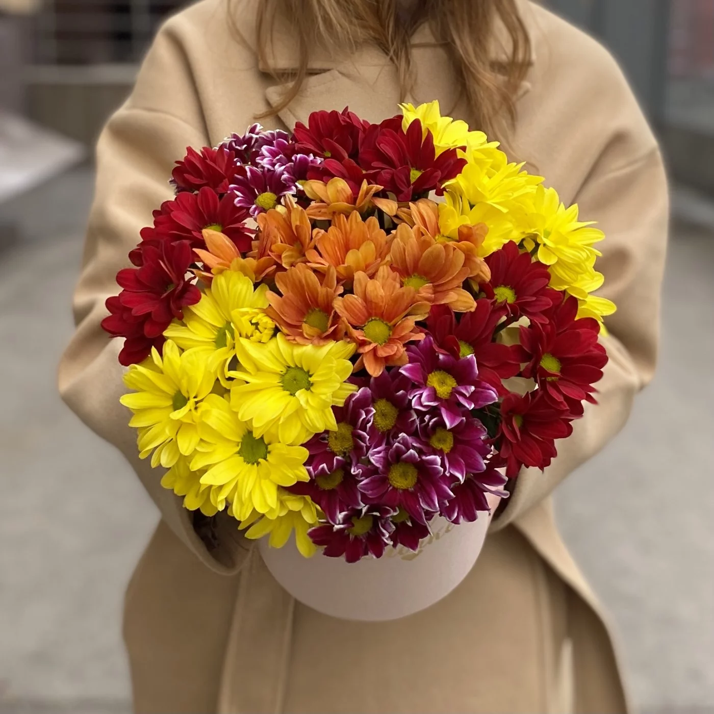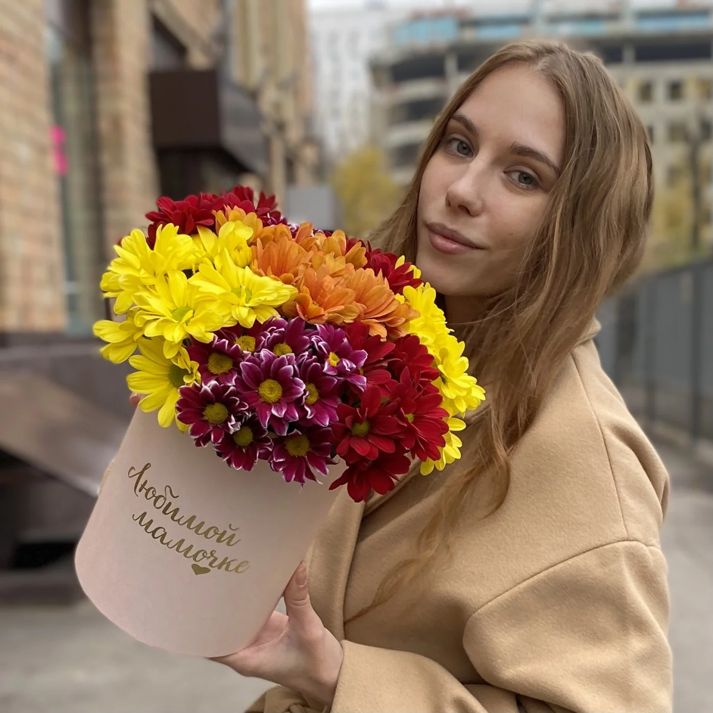 7 ярких кустовых хризантем микс в коробке Любимой Мамочке станет оригинальным подарком на День Матери.