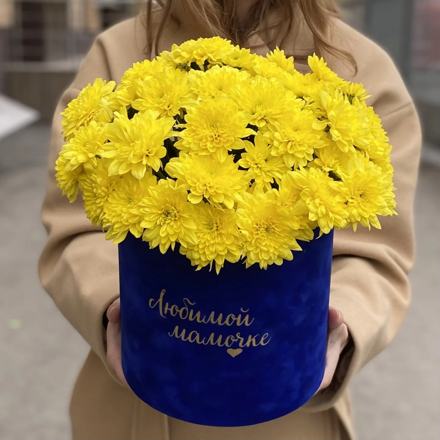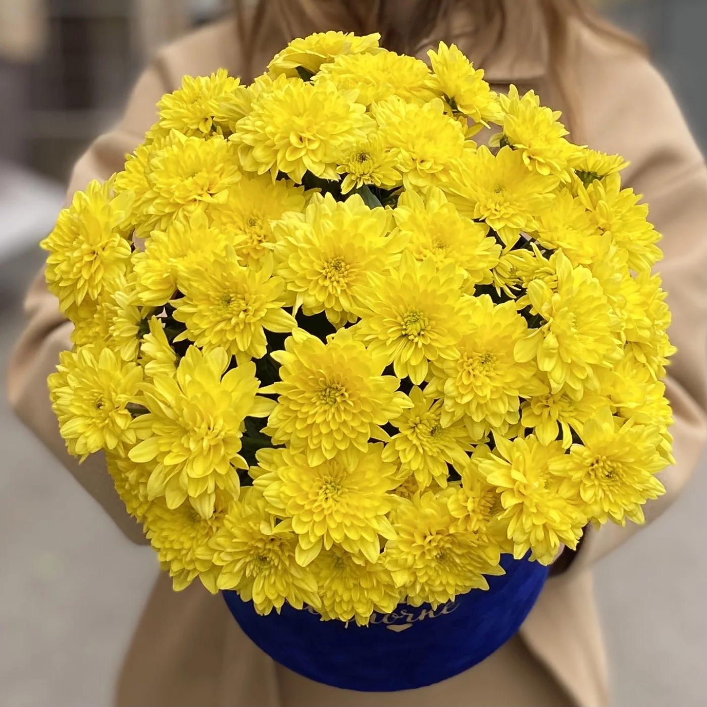 Букет из 7 желтых кустовых хризантем сорта «Балтика» в коробке — это солнечная и радостная цветочная композиция, которая станет прекрасным подарком для любого повода.