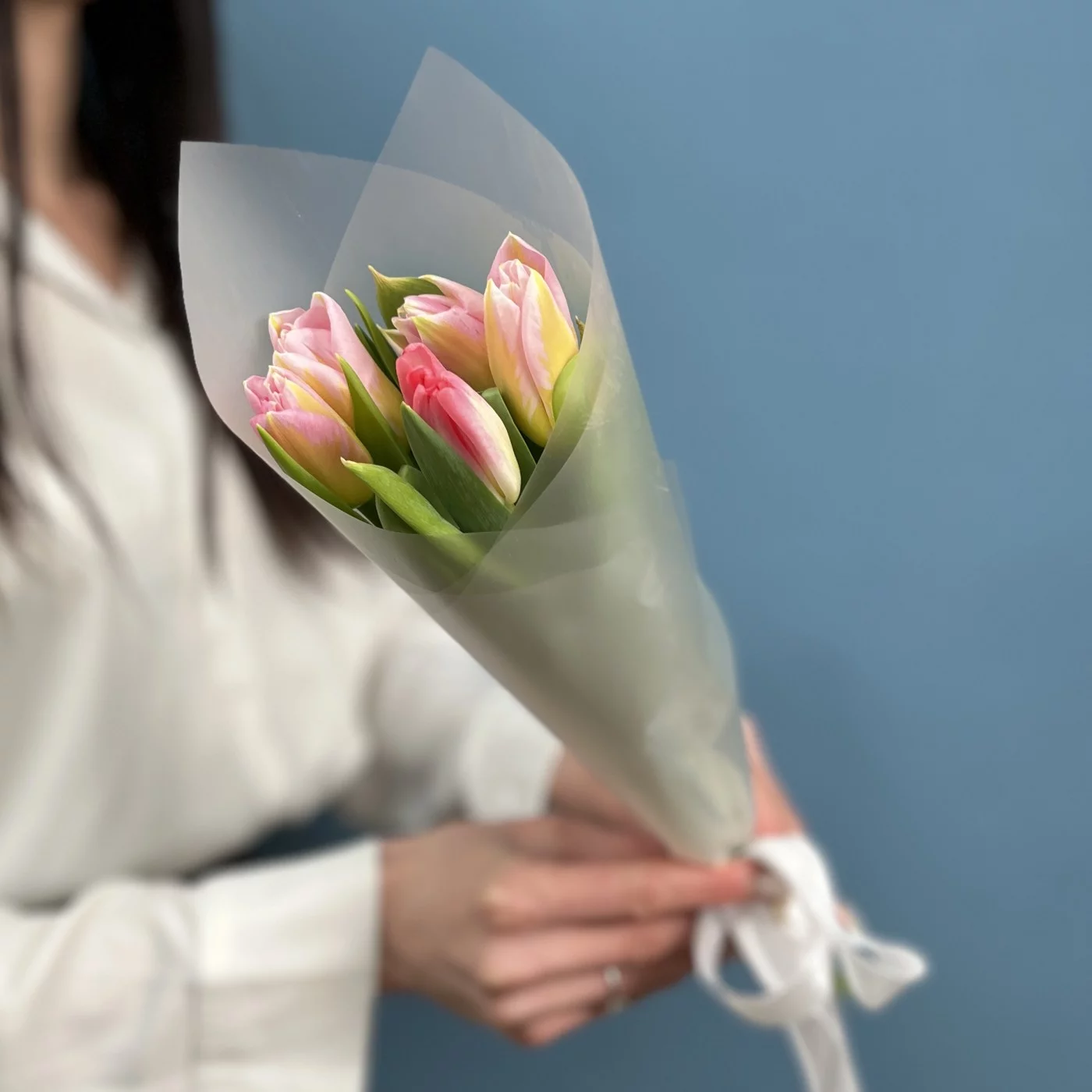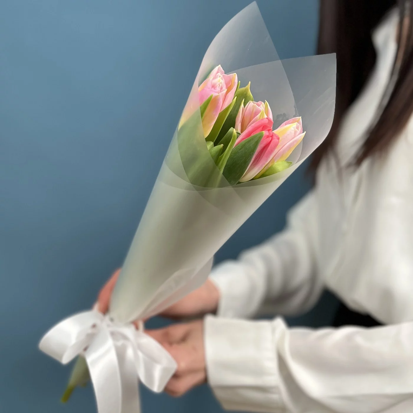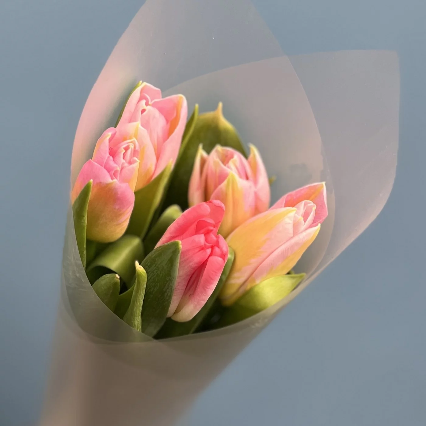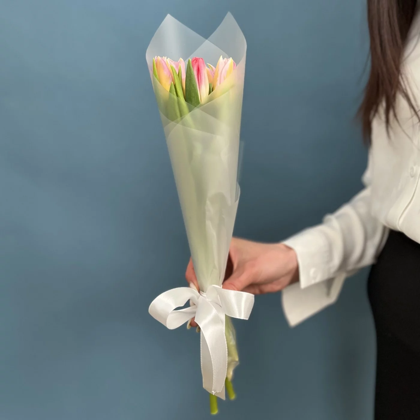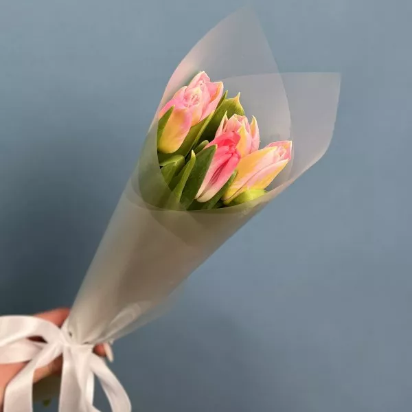 Мини букет из тюльпанов розового цвета в стильной упаковке. Прекрасный корпоративный вариант подарка на 8 марта.