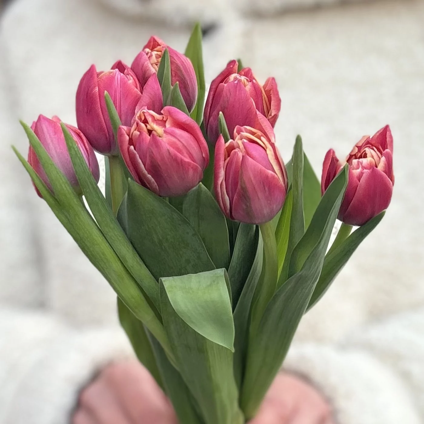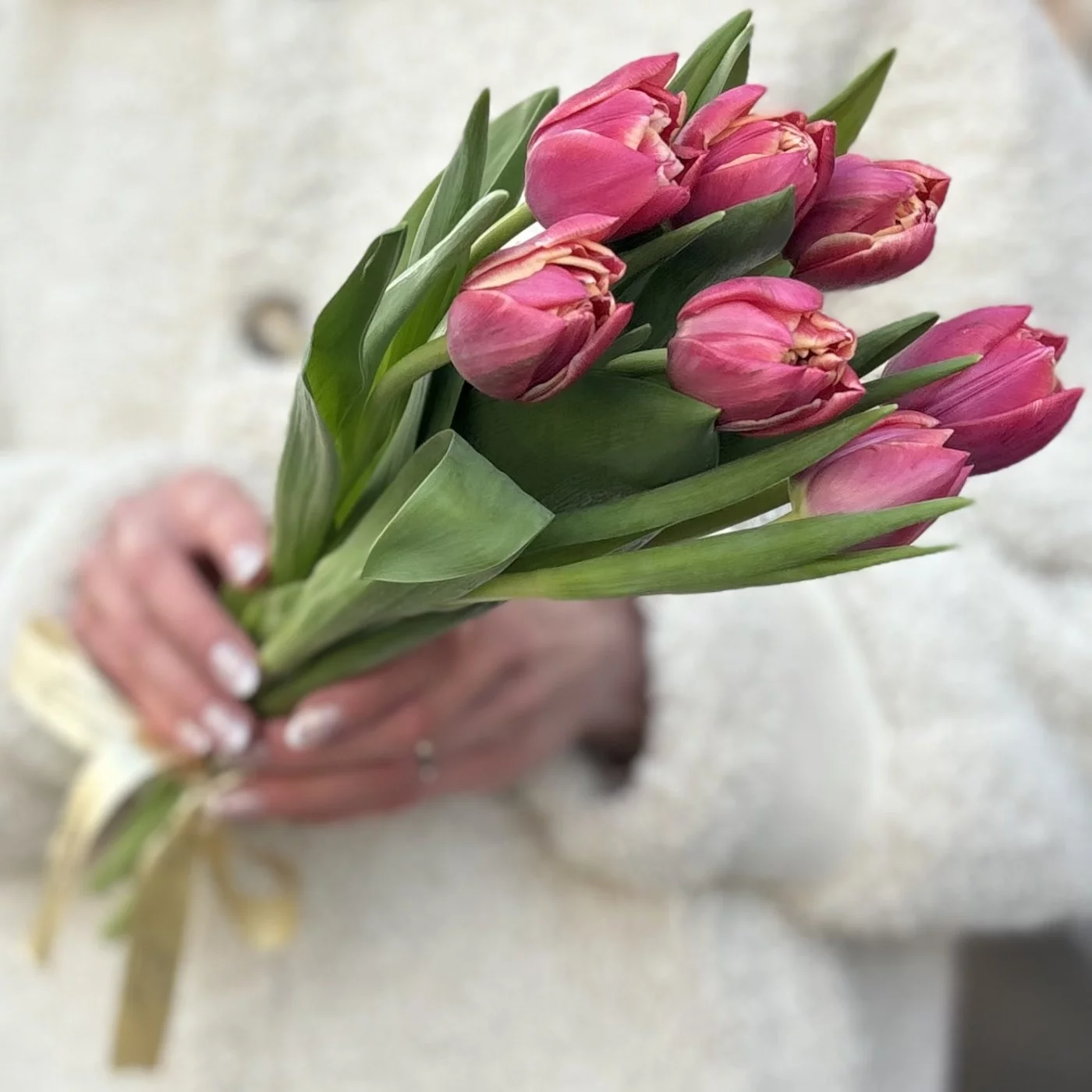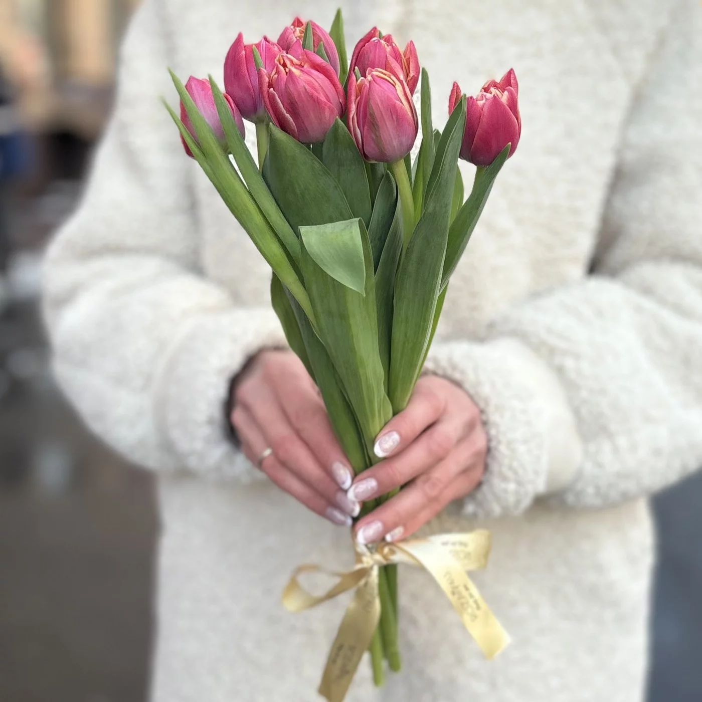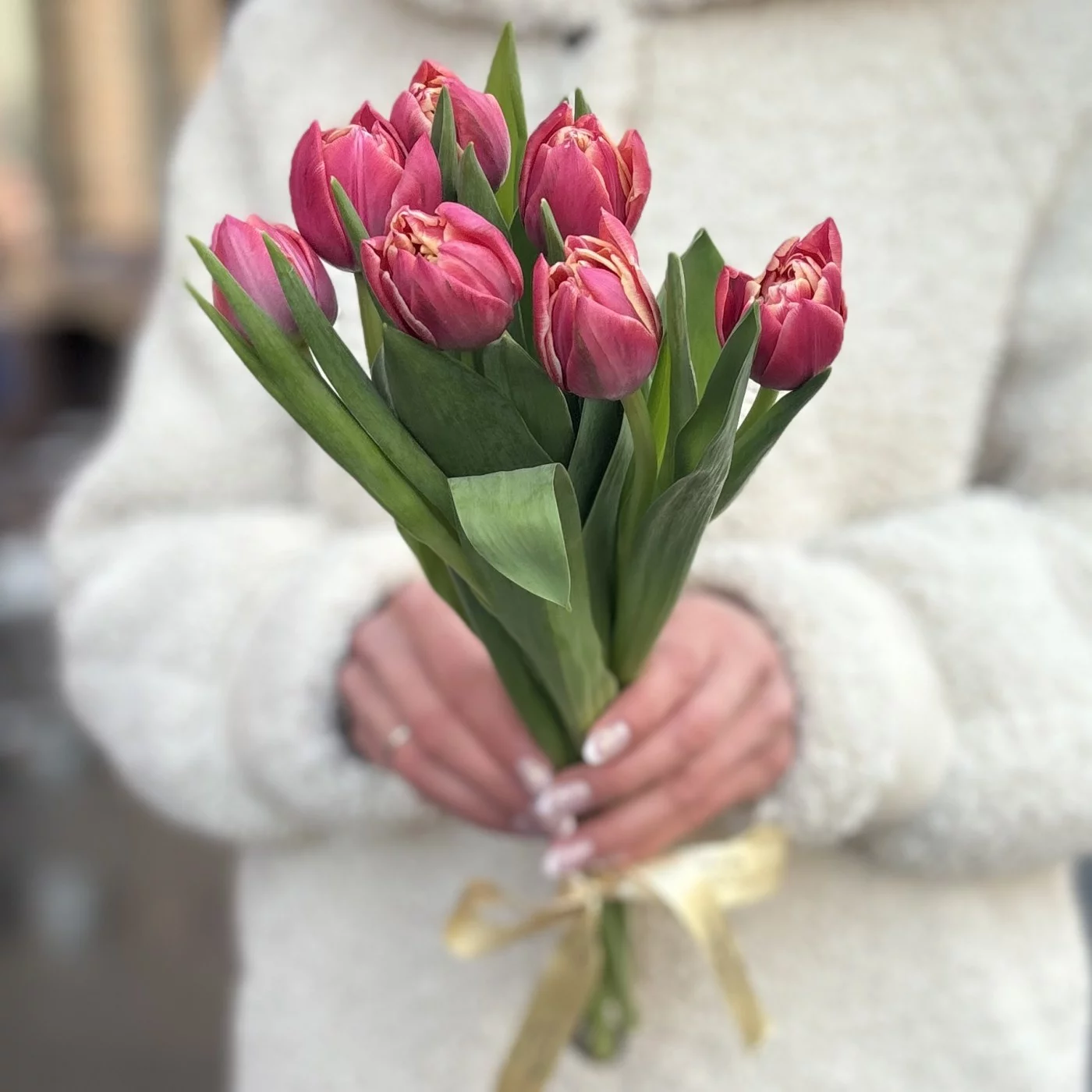 Корпоративный букет из весенних пионовидных тюльпанов сорта Коламбус. Букет прекрасно подойдет в качестве подарка на 8 марта.