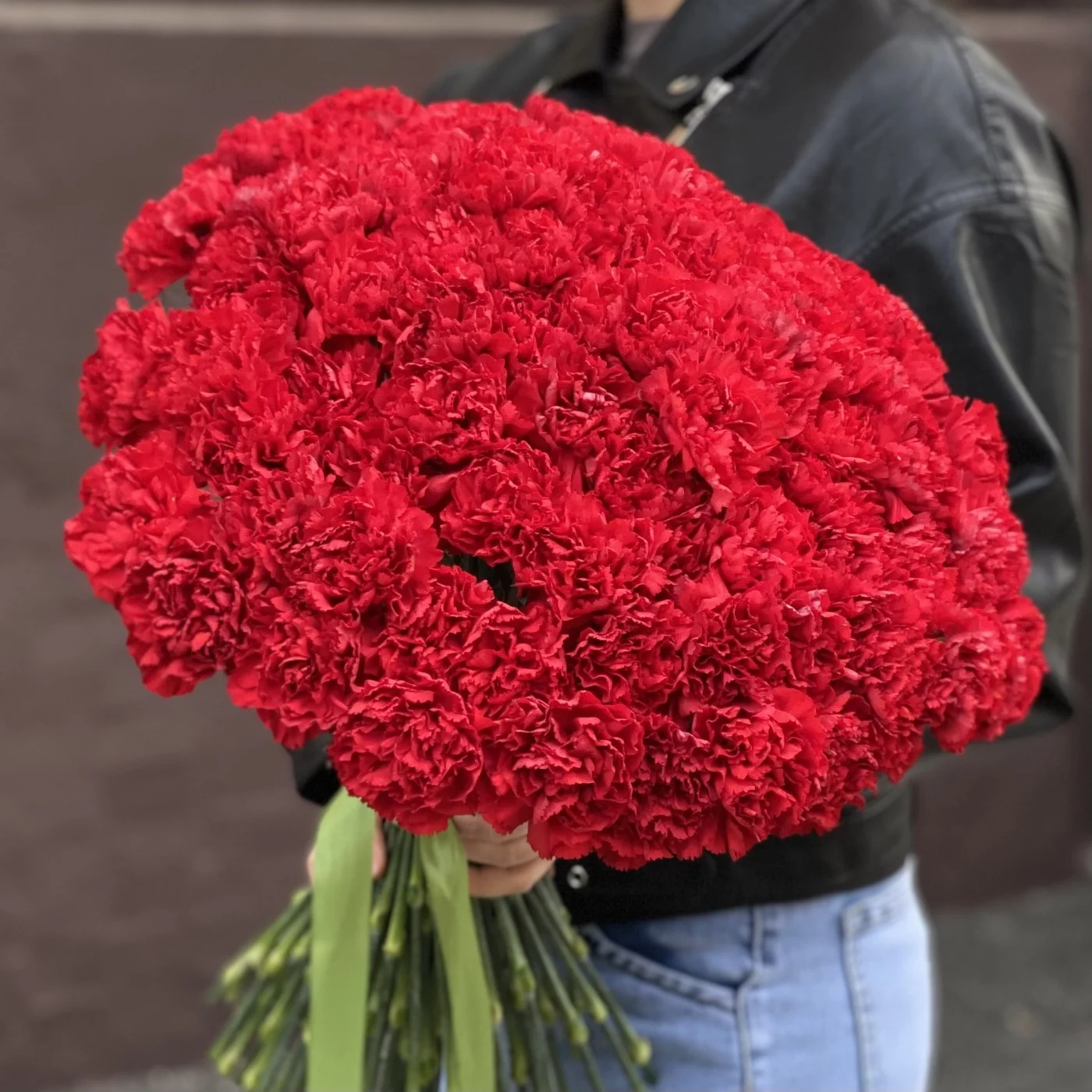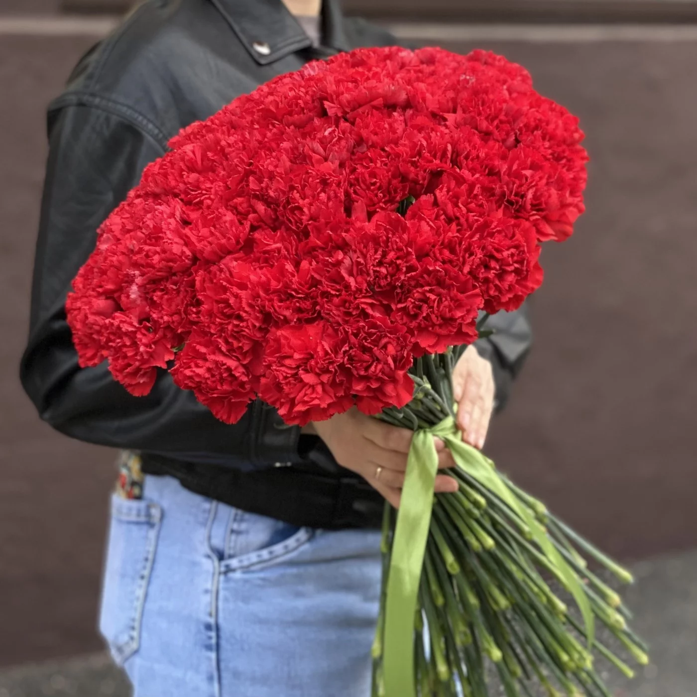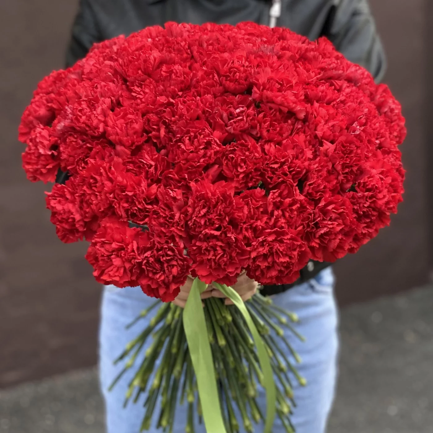 Букет из 80 красных гвоздик перевязанный зеленой ленточкой в цвет стебля.