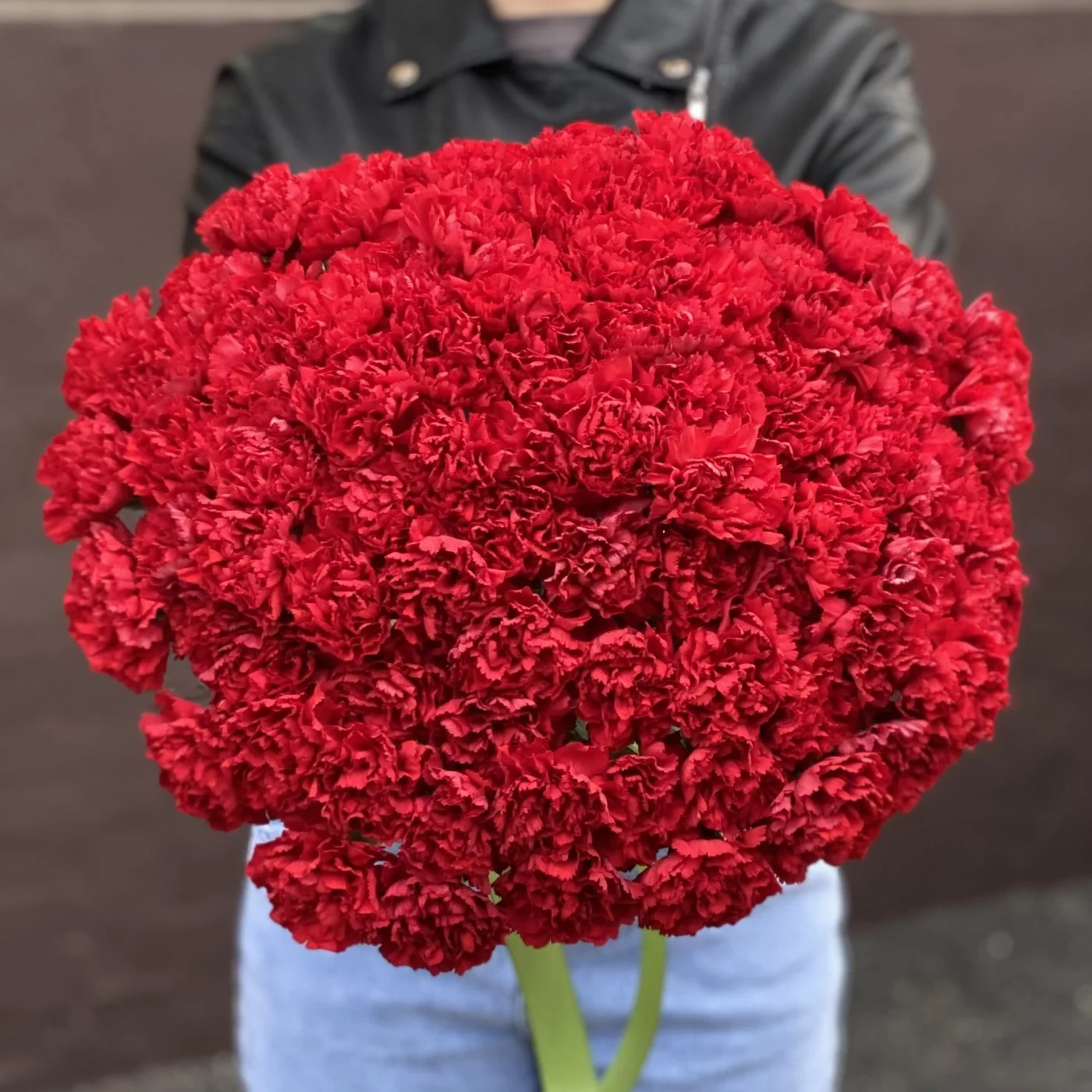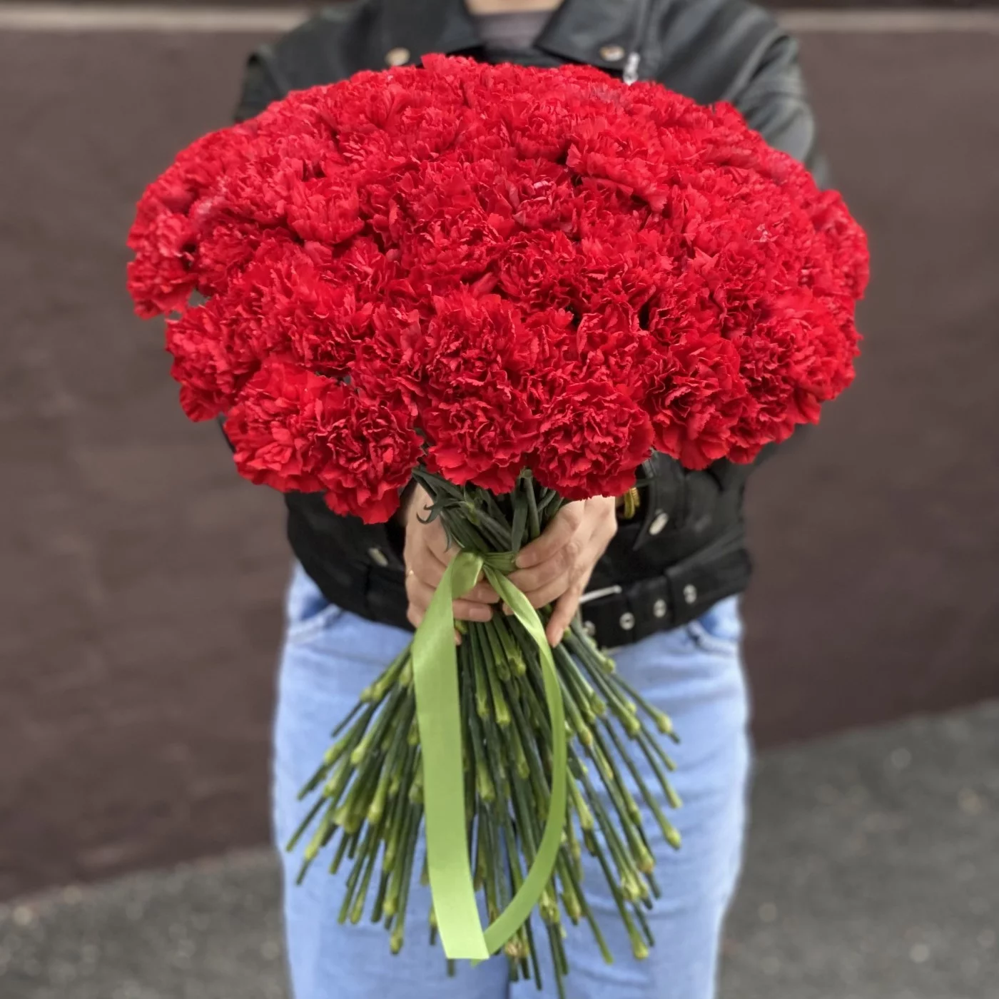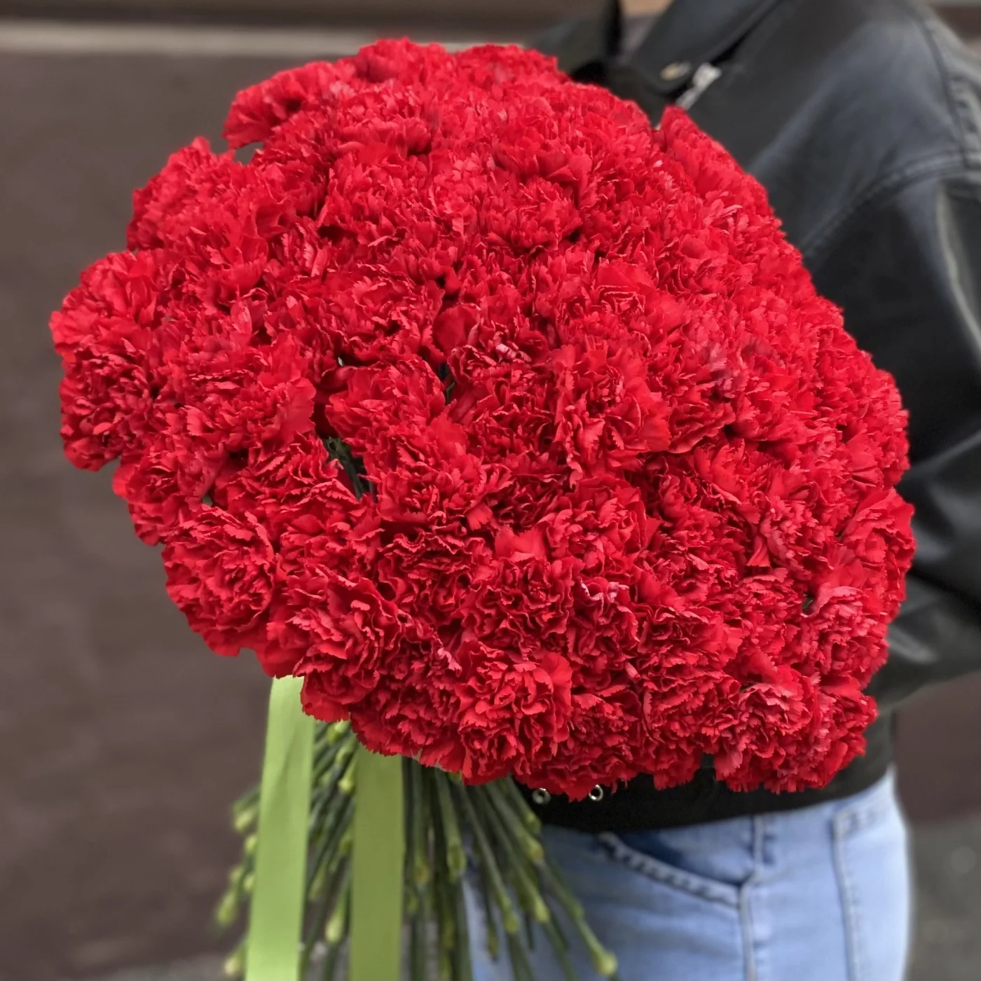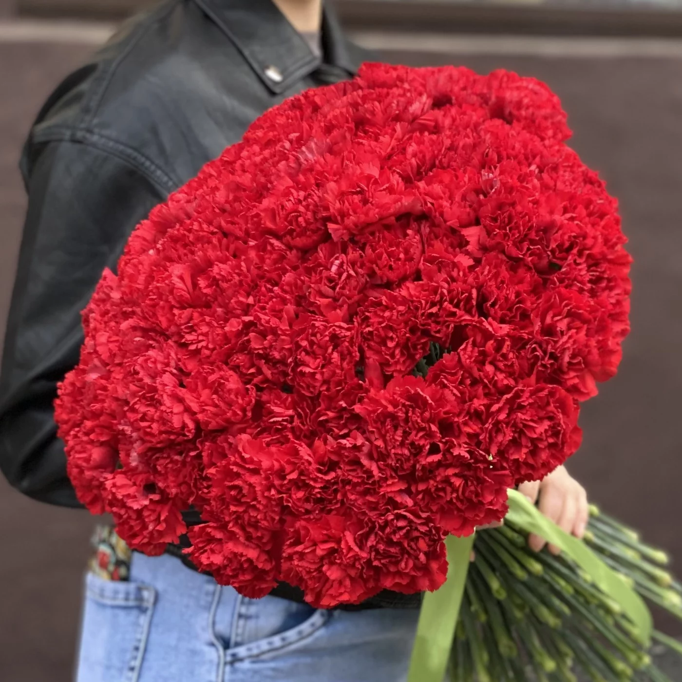 Букет из 80 красных гвоздик перевязанный зеленой ленточкой в цвет стебля.