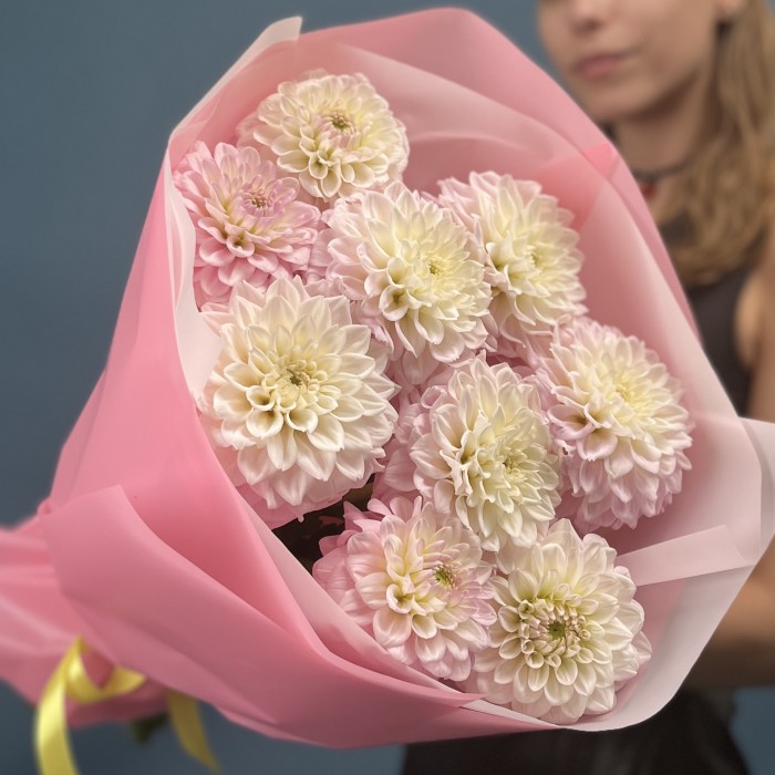 9 бело-розовых георгин помпон — это нежная и утончённая композиция, которая сочетает в себе мягкость белого и легкую розовую дымку.