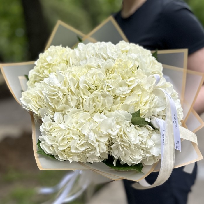 Чудесное легкое облачко из белой гортензии — это идеальный комплимент для самой нежной девушки на свете. Букет состоит из девяти крупных белых гортензий, которые вместе создают воздушную и пышную композицию. Каждый цветок состоит из множества мелких лепестков, образующих плотные и объемные соцветия, словно маленькие облака. Нежный белый цвет символизирует чистоту, невинность и элегантность, делая этот букет по-настоящему изысканным.