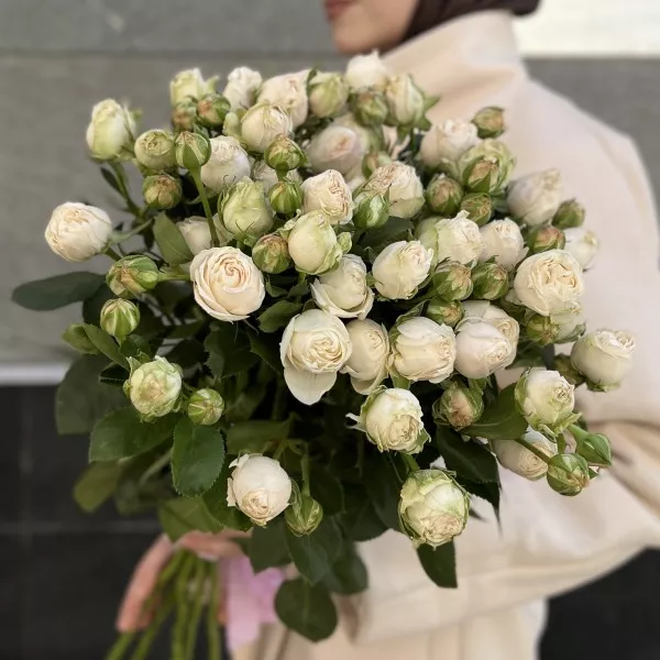 Букет из 9 кустовых белых роз Принцесс Бомбастик высотой 60 см, станет замечательным украшением любого праздника или торжества, а также прекрасно дополнит ваш интерьер, добавляя в него нотки изысканности и стиля.