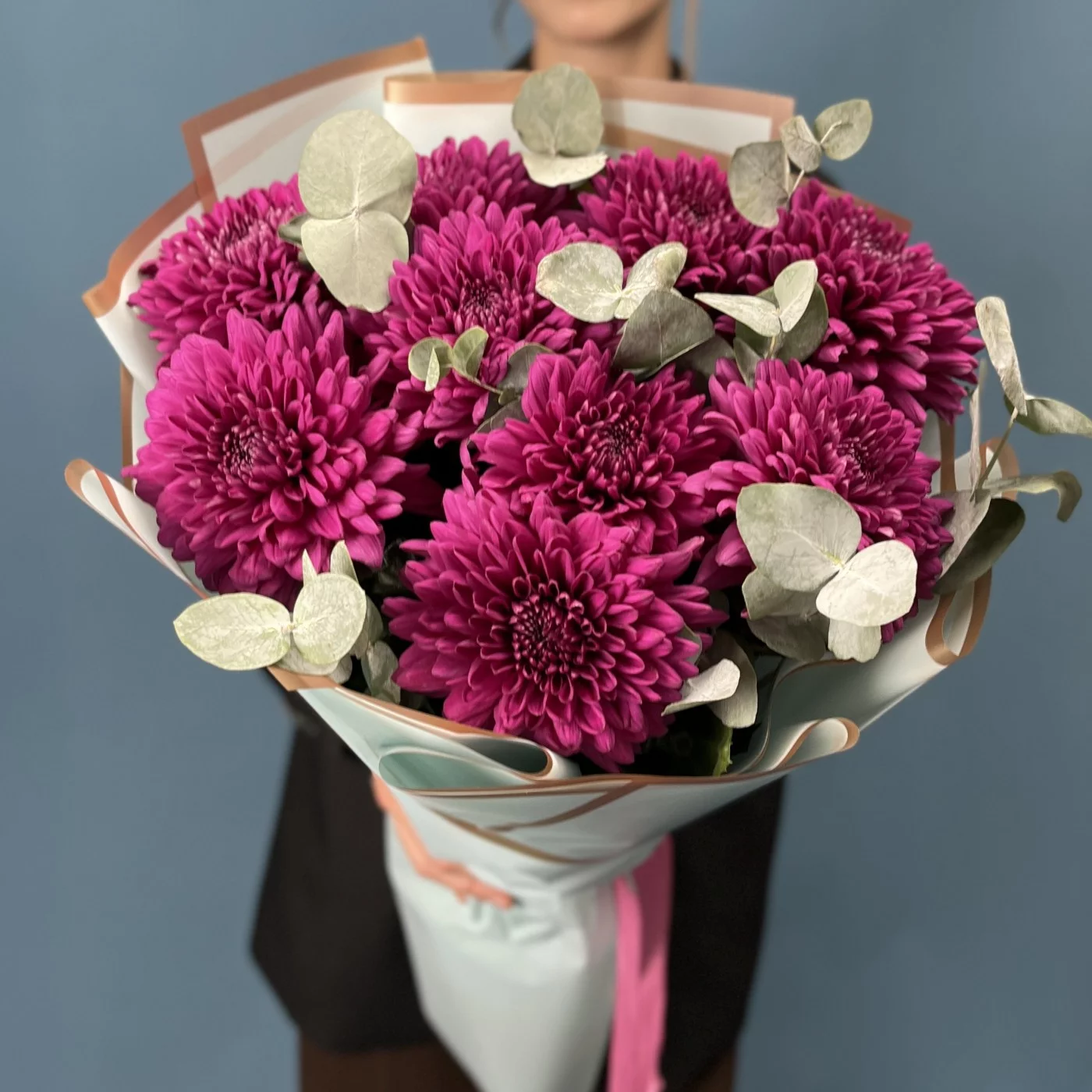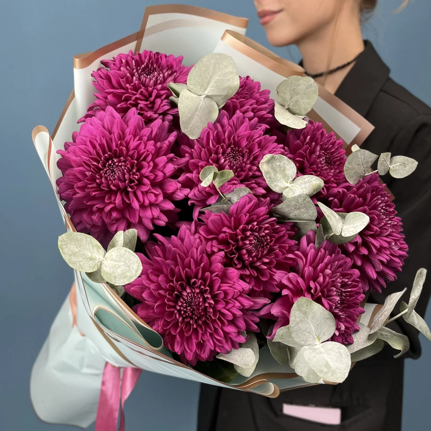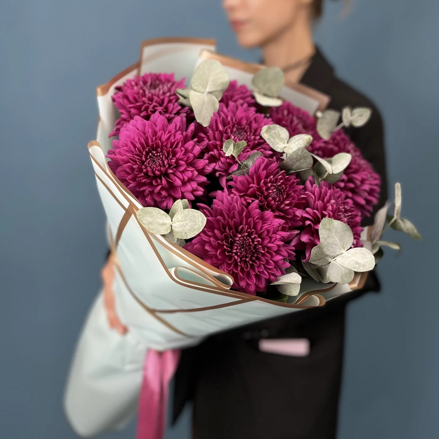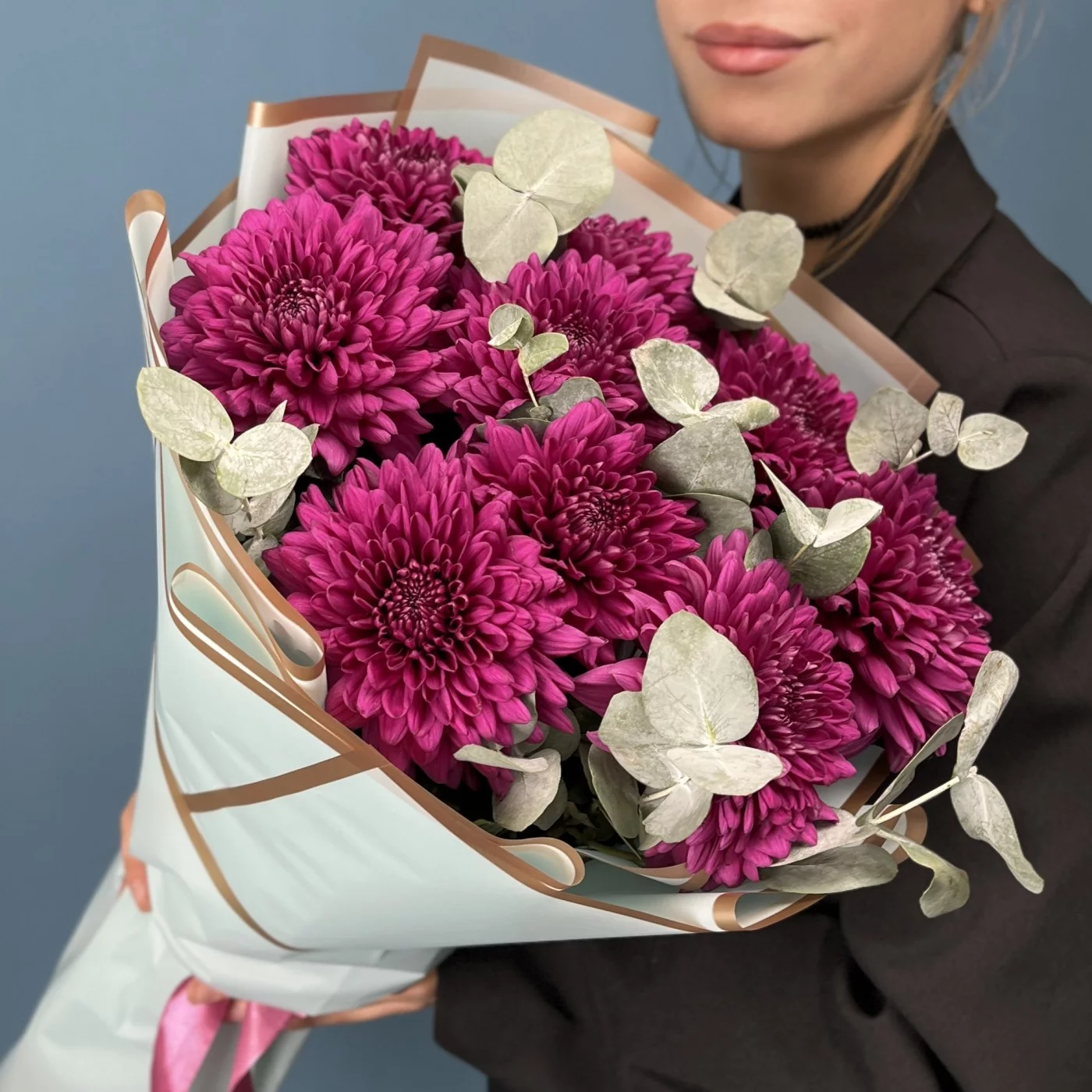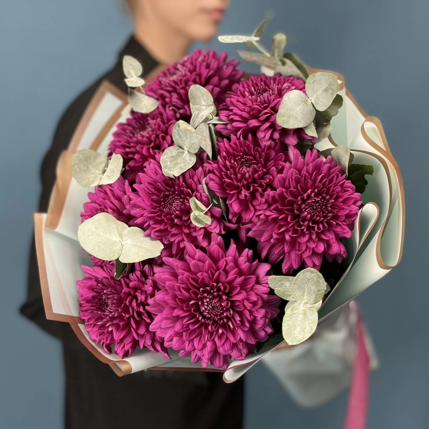 Букет из 9 фиолетовых хризантем сорта Ламира в сочетании с ароматным эвкалиптом — это элегантная и выразительная композиция, которая подчеркнет вашу утонченность и оригинальный вкус.