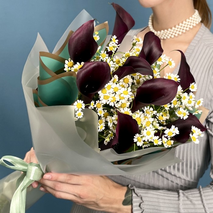Элегантный букет из 9 фиолетовых калл с ромашкой — это гармоничное сочетание утонченности и свежести. Глубокий фиолетовый цвет калл в сочетании с нежными белыми ромашками создает романтичную и выразительную композицию, которая подчеркнет особое настроение и добавит уюта. Такой букет станет прекрасным подарком для тех, кто ценит красоту природы и искренние чувства, а также украсит любой интерьер своей изысканностью.