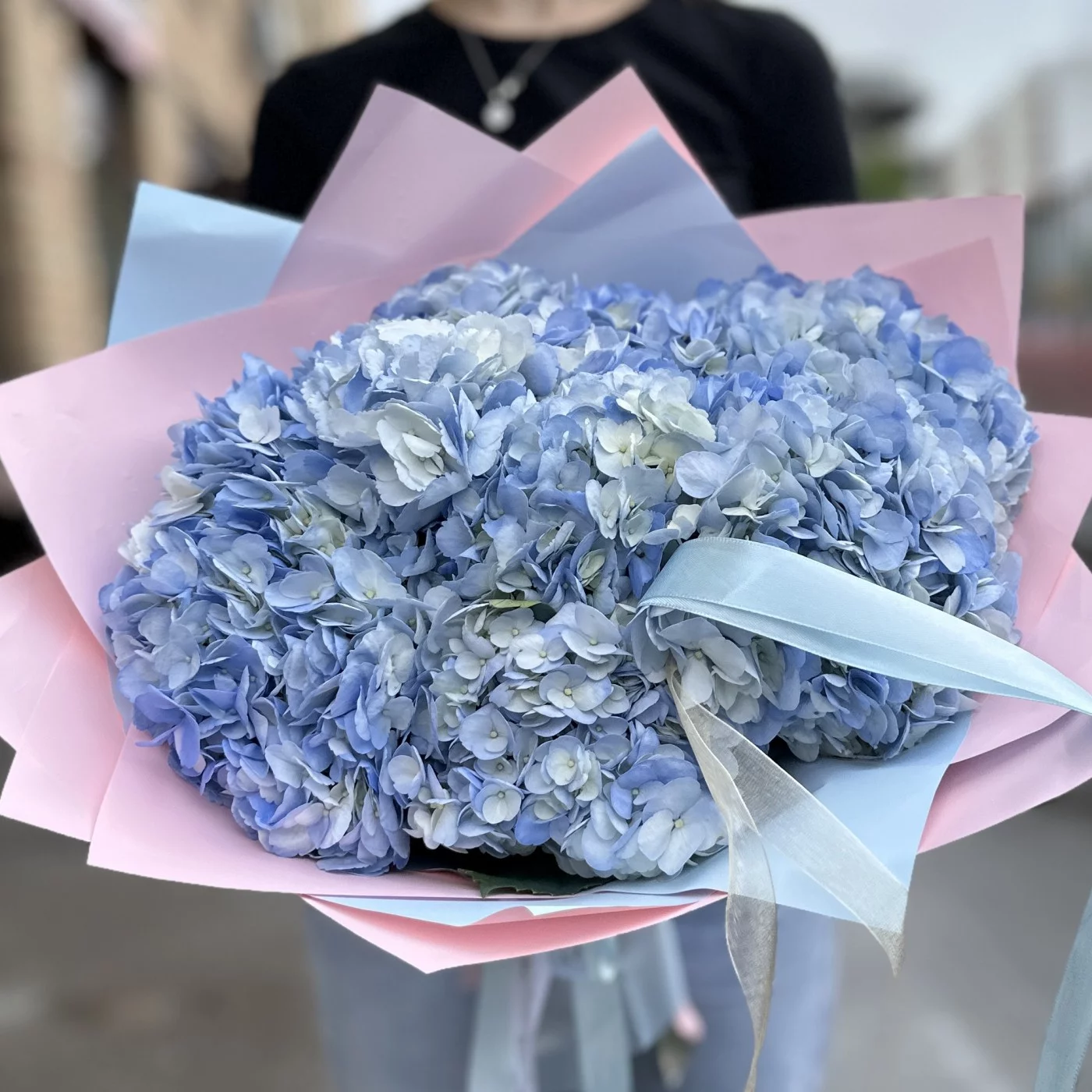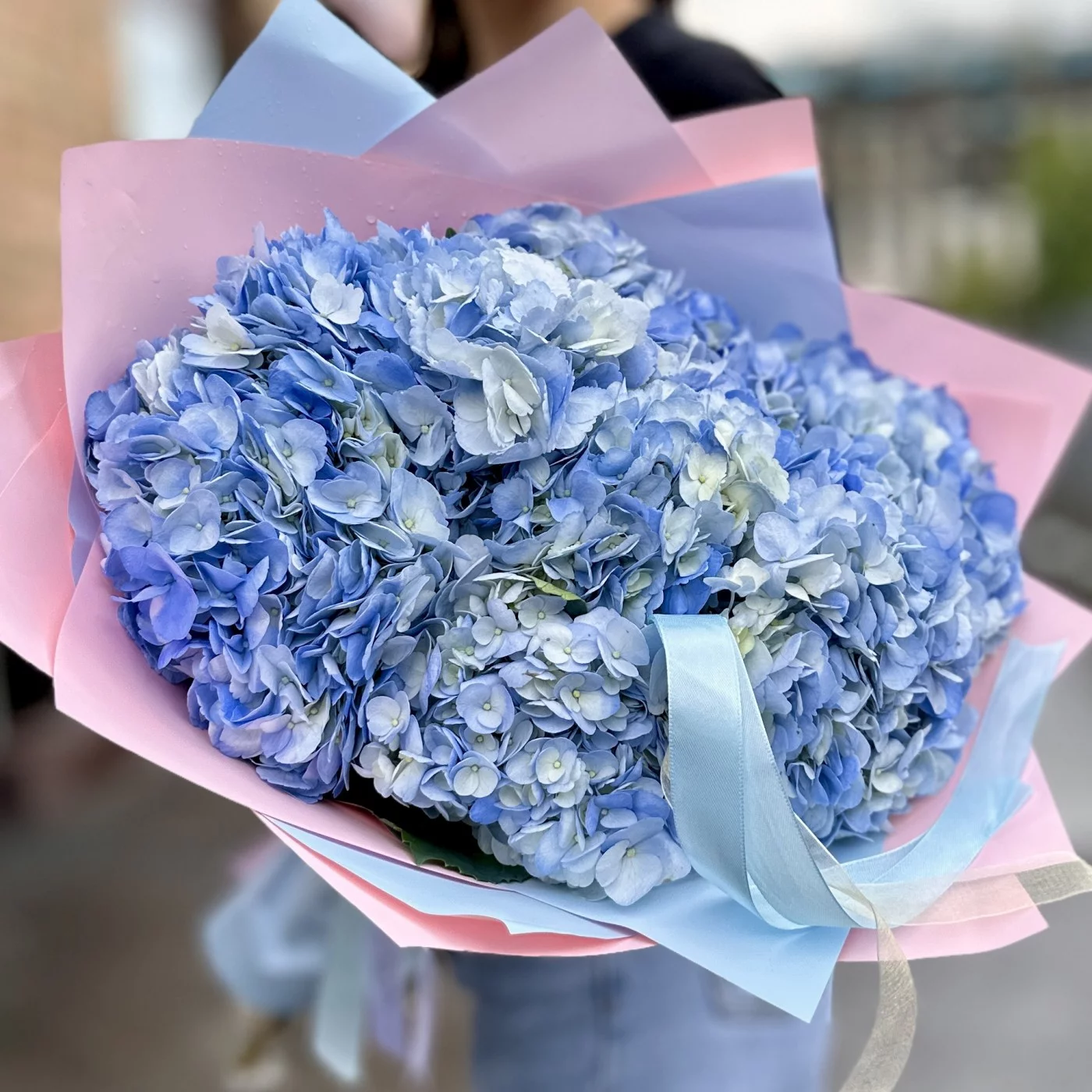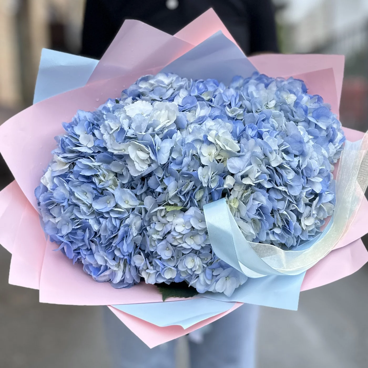 Пышное облачко из голубой гортензии — это воплощение нежности и элегантности. Девять великолепных голубых гортензий собраны в пышную композицию, напоминающую воздушное облако. Каждый цветок в букете обладает крупными соцветиями, состоящими из множества мелких цветков, создавая ощущение объемности и легкости. Нежные голубые оттенки гортензий символизируют чистоту и спокойствие, делая букет особенно утонченным.