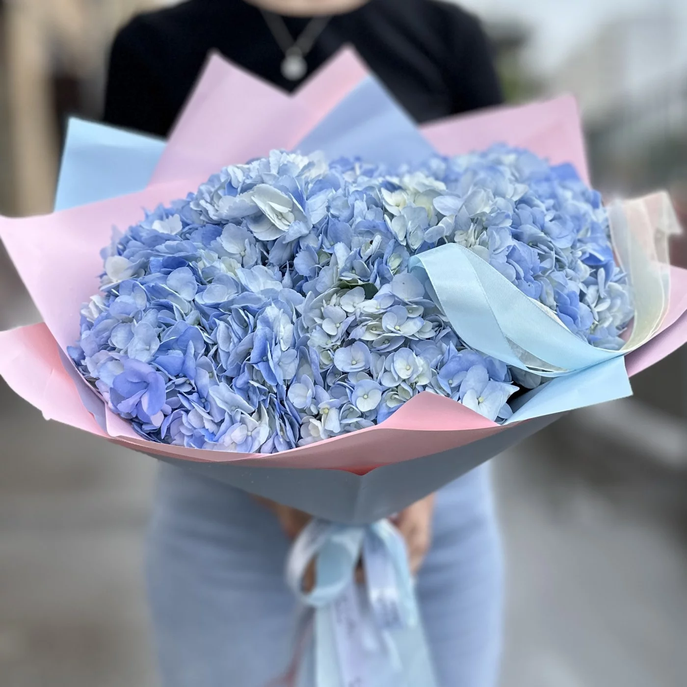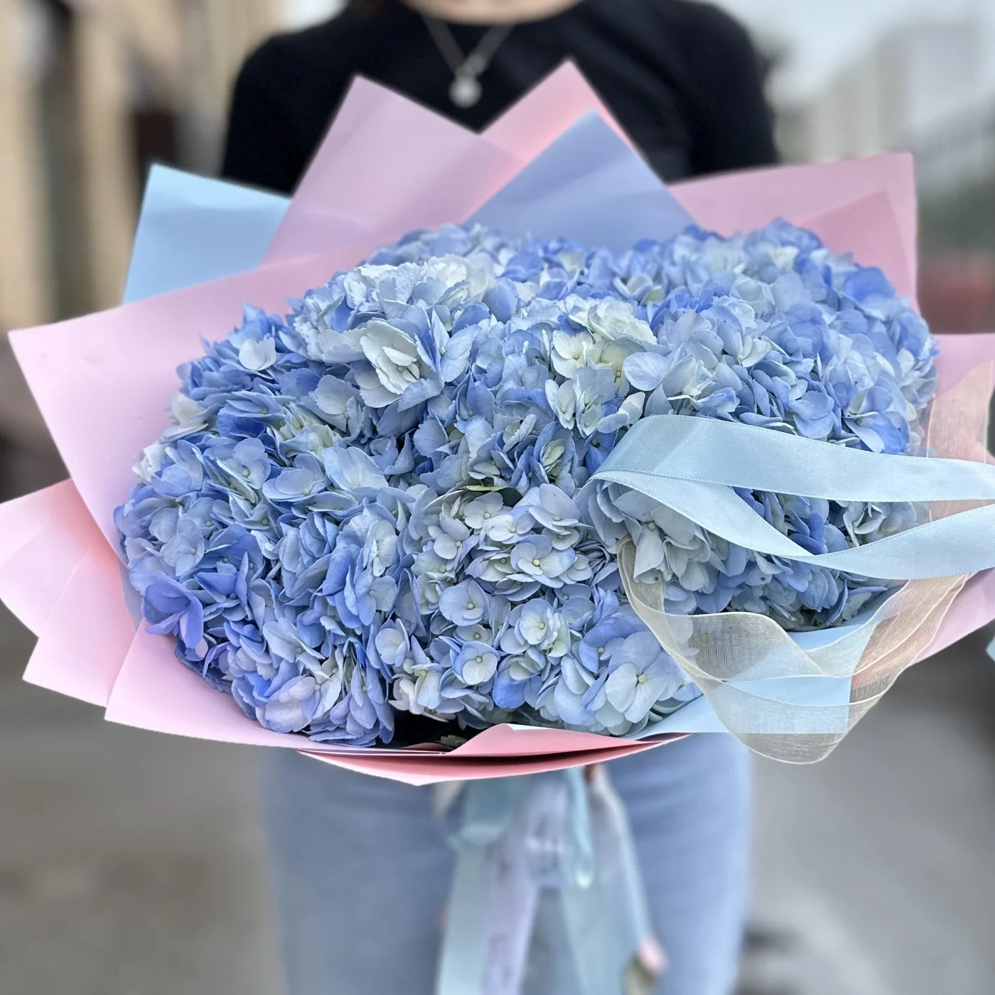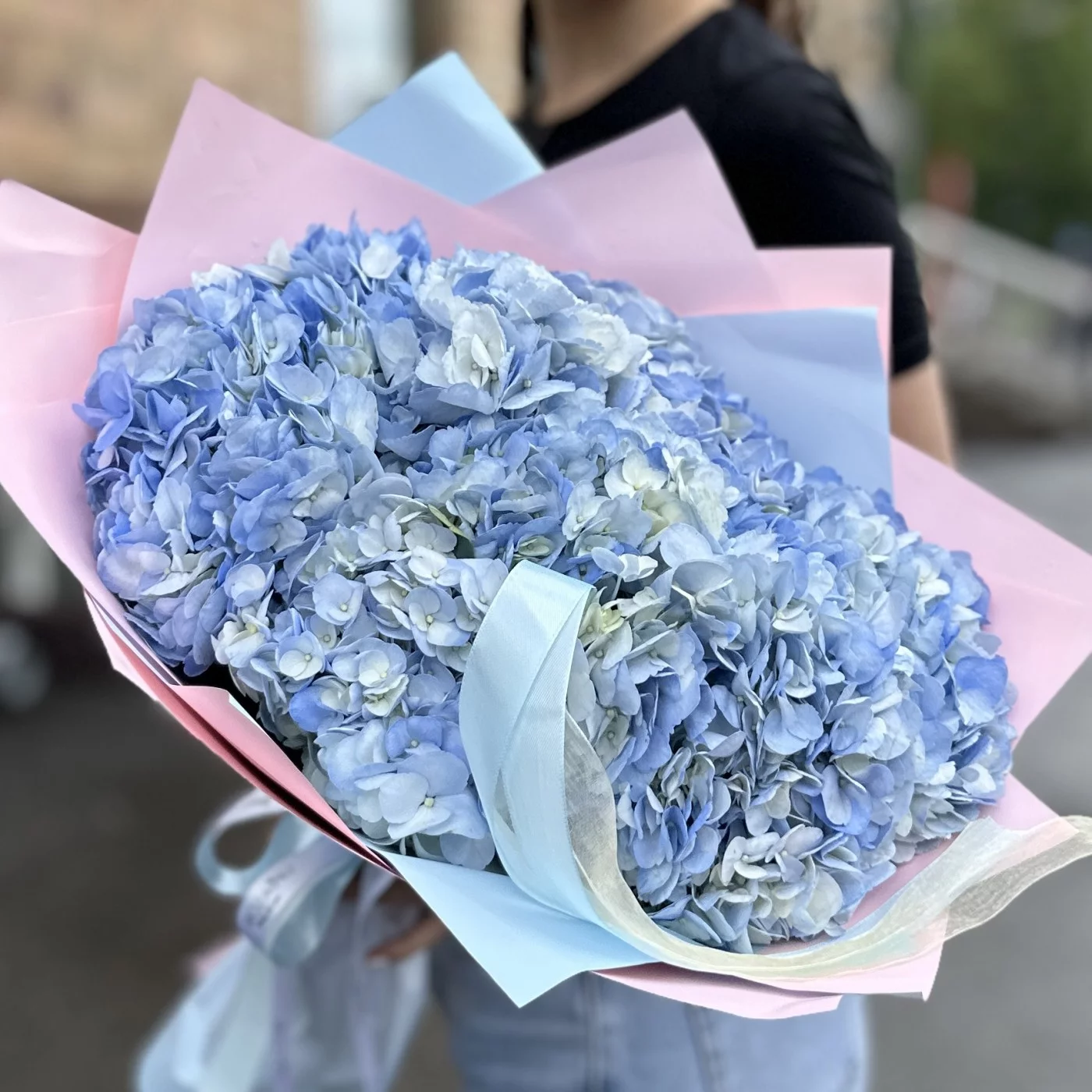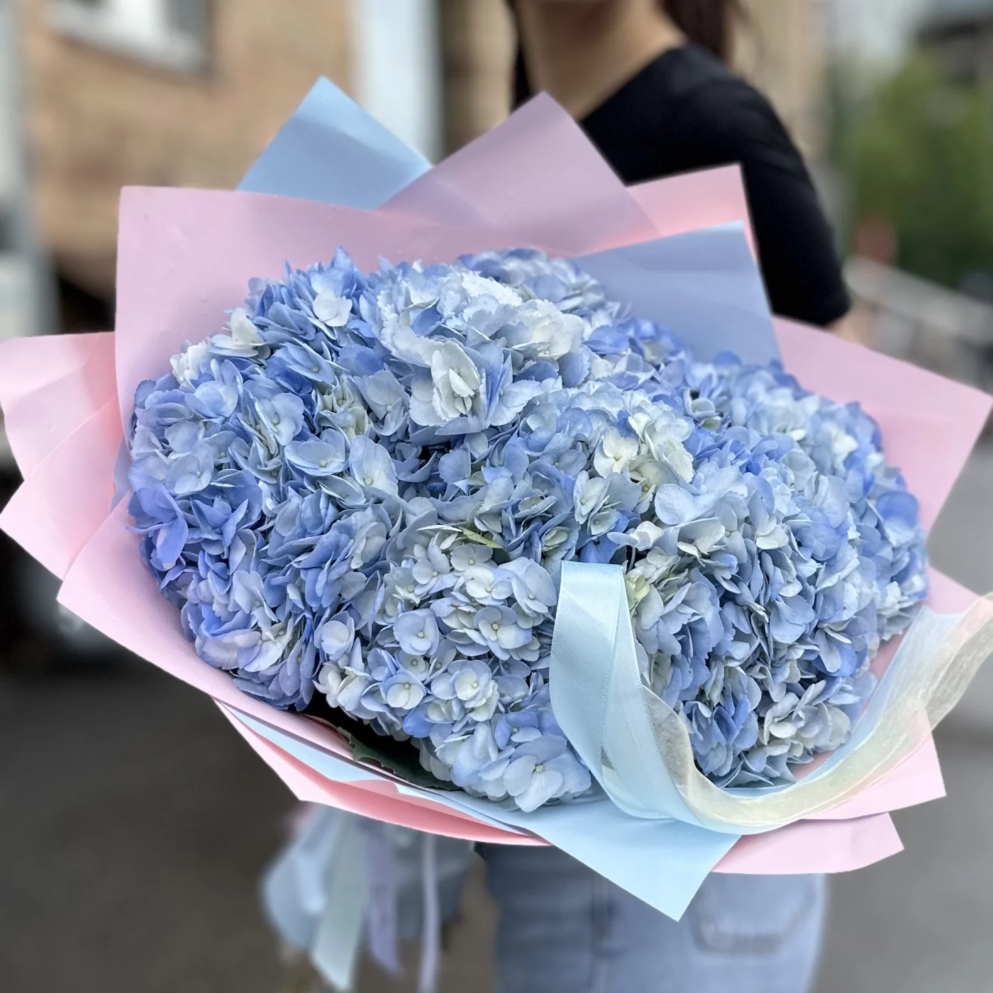 Пышное облачко из голубой гортензии — это воплощение нежности и элегантности. Девять великолепных голубых гортензий собраны в пышную композицию, напоминающую воздушное облако. Каждый цветок в букете обладает крупными соцветиями, состоящими из множества мелких цветков, создавая ощущение объемности и легкости. Нежные голубые оттенки гортензий символизируют чистоту и спокойствие, делая букет особенно утонченным.