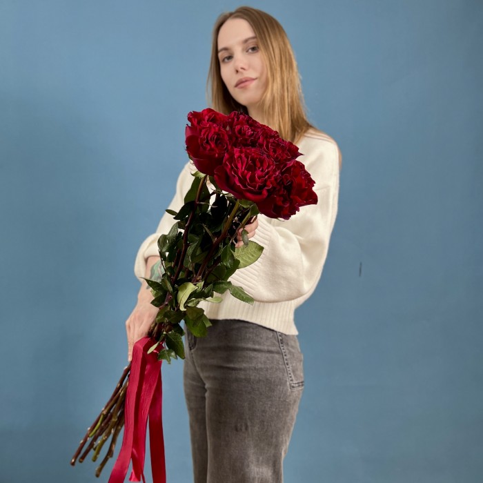 9 красных пионовидных роз Хартс 70 см