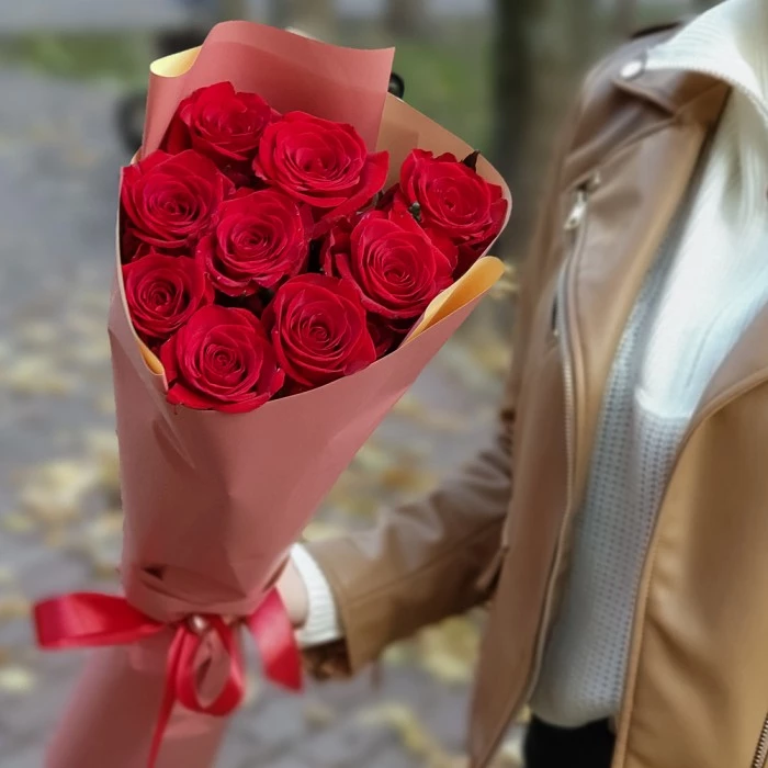 9 красных роз Эксплорер 70 см