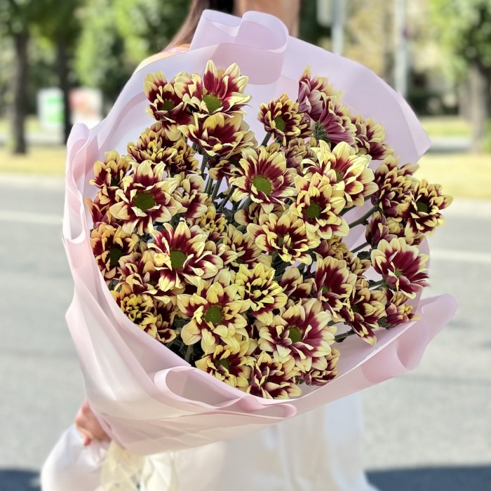 Букет из 9 кустовых хризантем сорта «Хайдар Елоу» — это яркая и жизнеутверждающая композиция, которая будет привлекать внимание своей красотой и насыщенными цветами. Хризантемы этого сорта отличаются крупными соцветиями яркого желтого и сиреневого цвета, символизирующего радость и оптимизм.