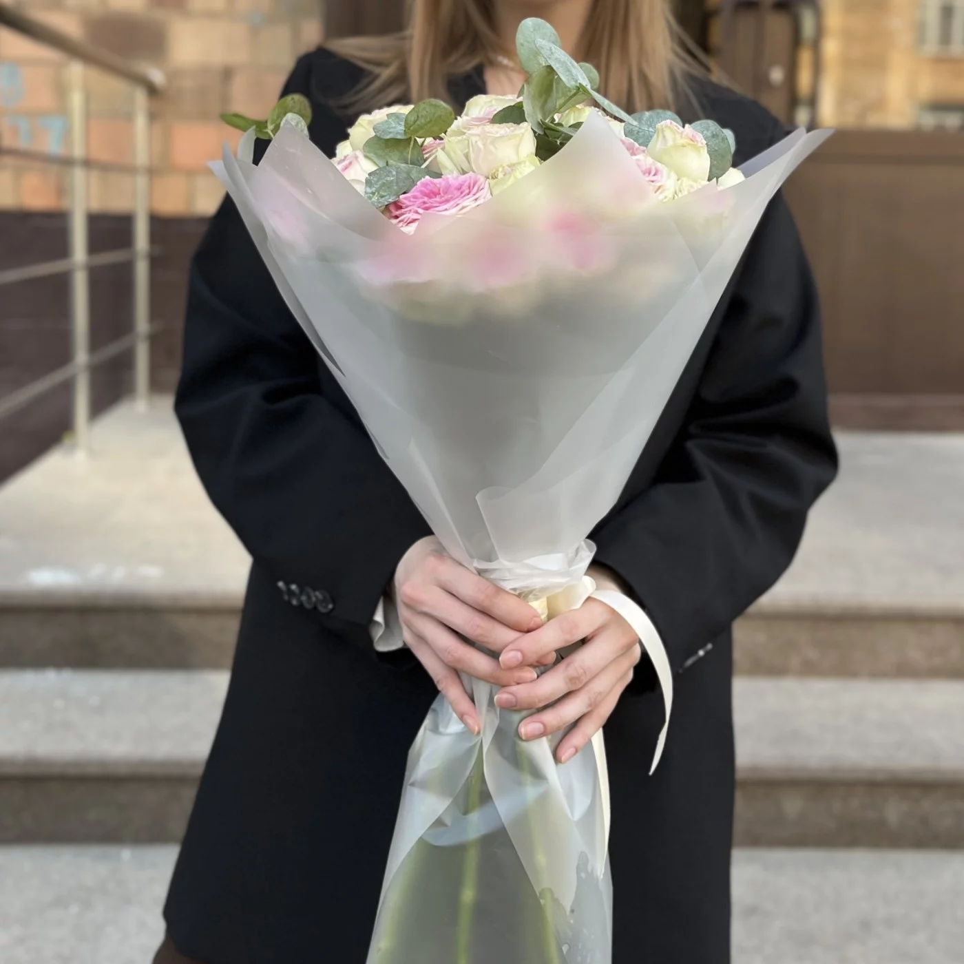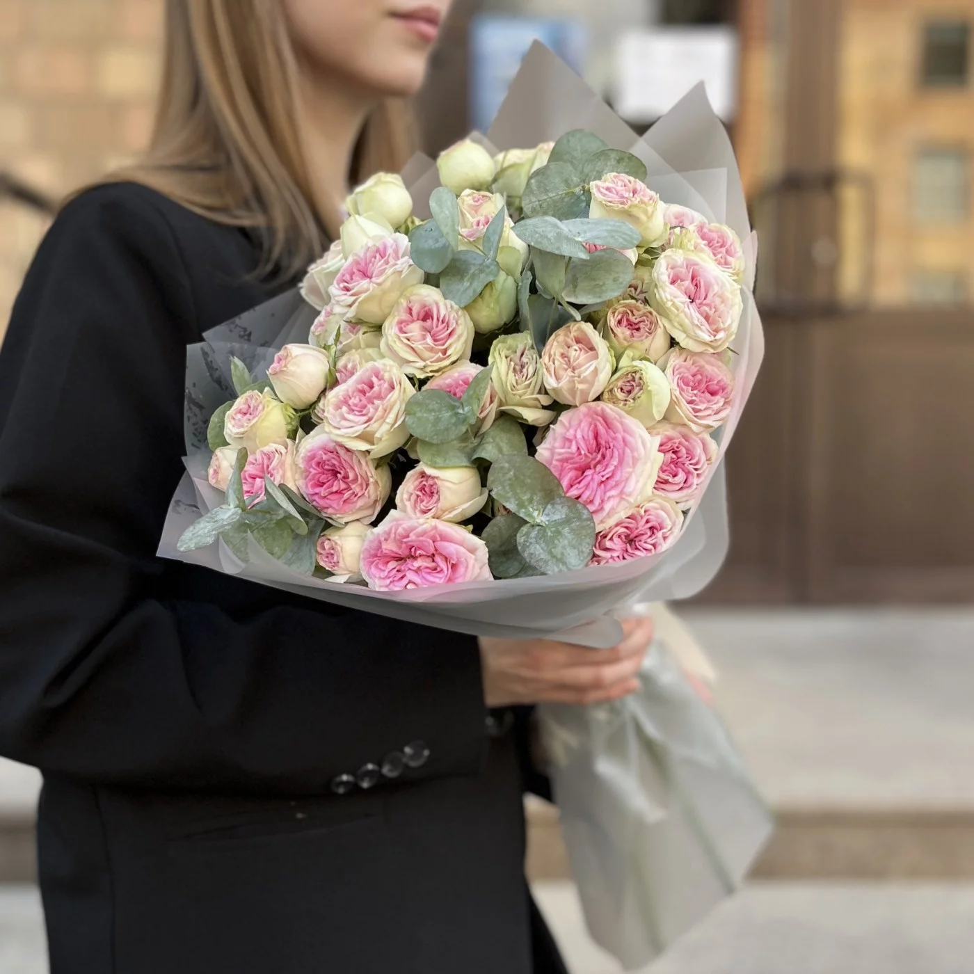 9 кустовых пионовидных бело-розовых роз Джелатто 50 см это изысканный букет.